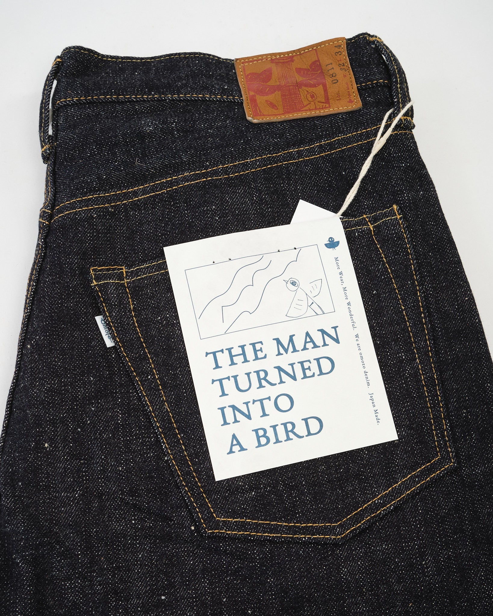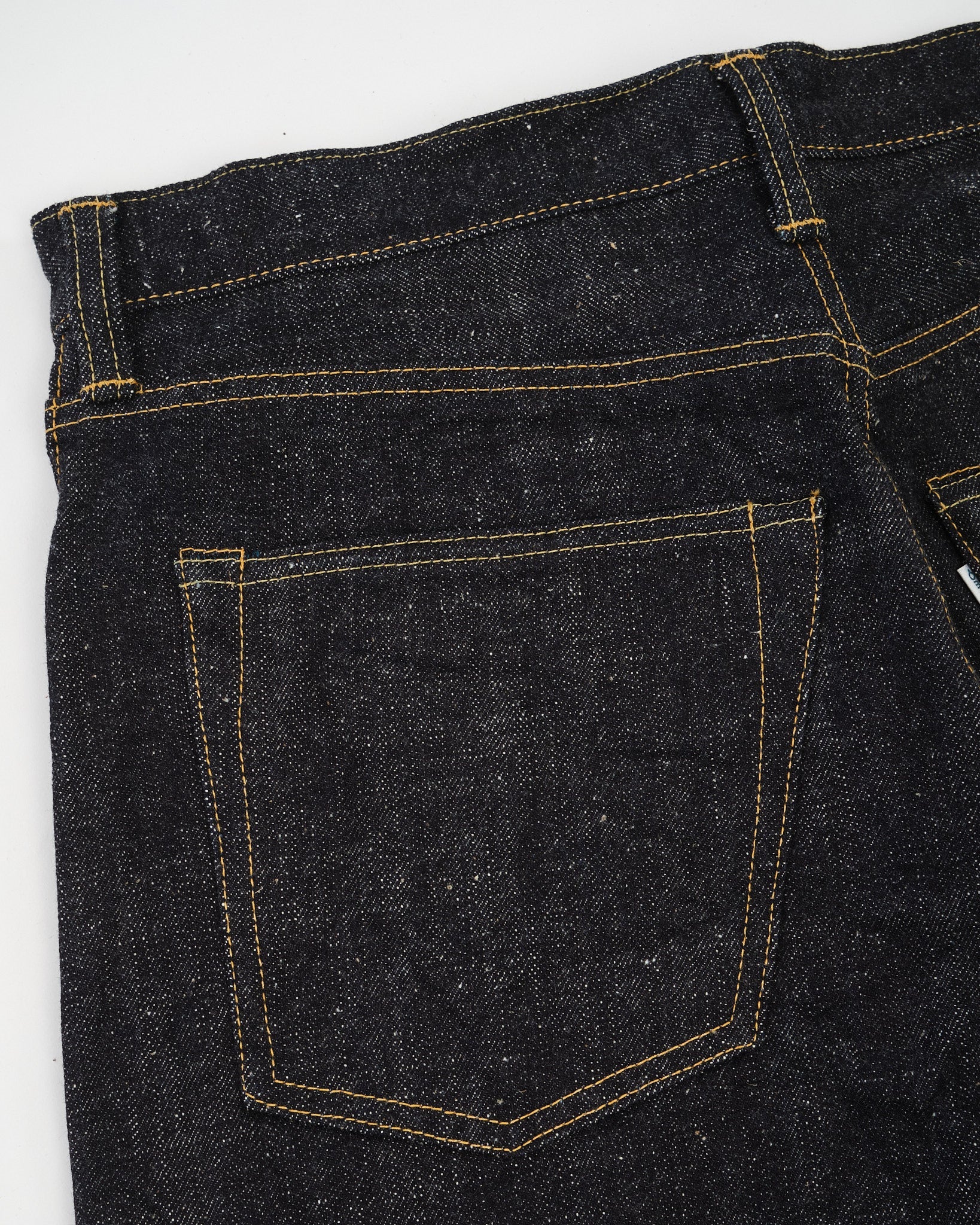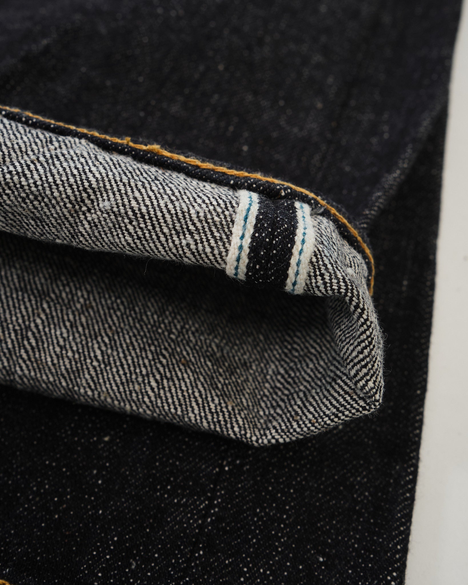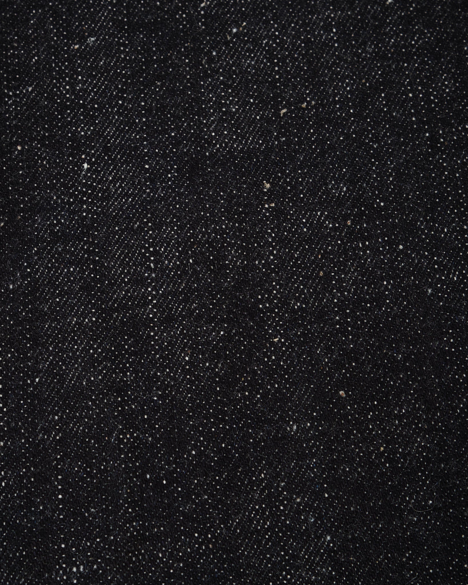 Le tissu est un denim robuste de 15.5oz tissé sur d'anciens métiers à tisser navette Toyoda. Les fils de chaîne sont fortement irréguliers pour une texture prononcée, tandis que la trame intègre des fils de bourre filés à partir de coton recyclé. Cette combinaison crée un denim qui développe des délavages verticaux audacieux et un processus de vieillissement unique en son genre. Le tissage à faible tension donne au tissu une qualité rugueuse au toucher et une profondeur de caractère.