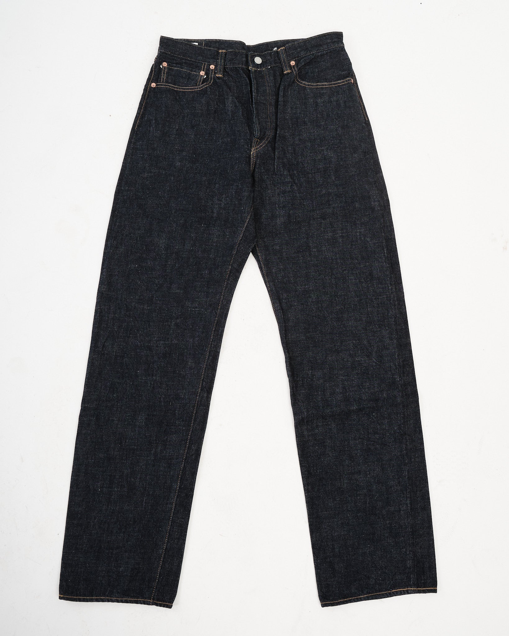 Teint en utilisant 100% pur indigo avec un Technique traditionnelle de dyeing de corde, ces jeans développent des disparations uniques et à contraste élevé avec le temps. Le tissu est tissé sur un Mesure de navette Sakamoto des années 1950 en utilisant un Méthode de tissage basse tension, résultant en une esthétique texturée et tissée à la main qui s'améliore avec l'usure.
