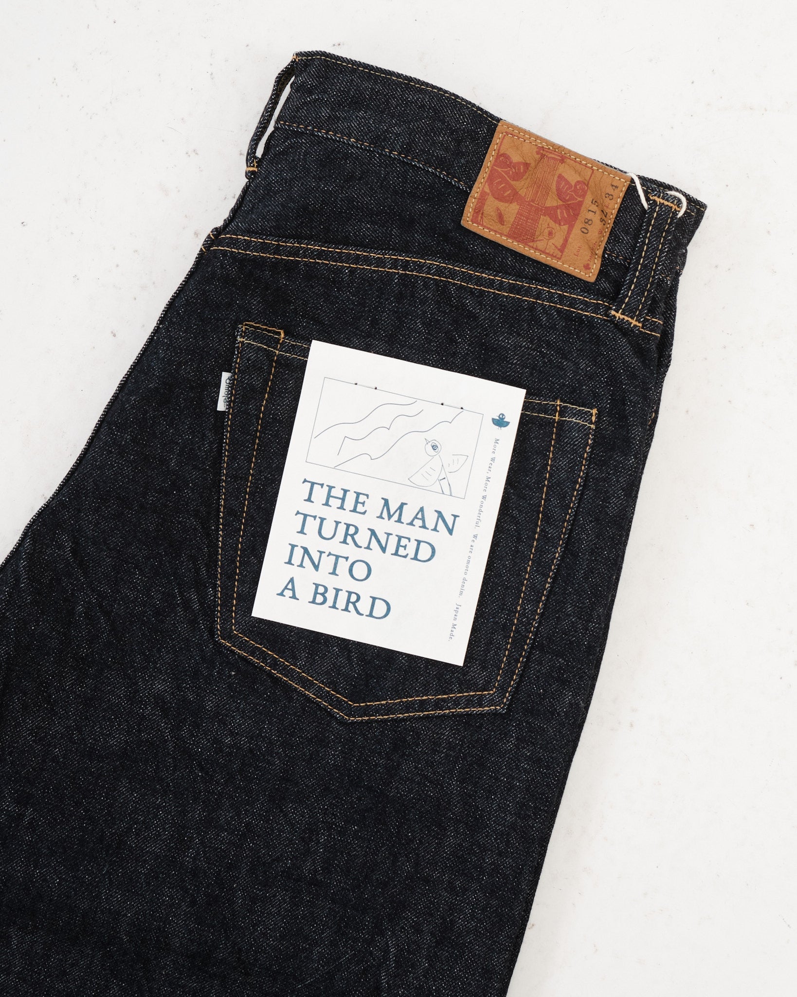 Les détails de la signature incluent La lisière «Mimi» bleu-vert d'Omoto, un Patch en cuir de mouton de marque sur mesure, et rivets cachés pour une durabilité supplémentaire. UN Sac de poche à chevrons avec un dossier de lavage Améliore le caractère vintage de ces jeans.
