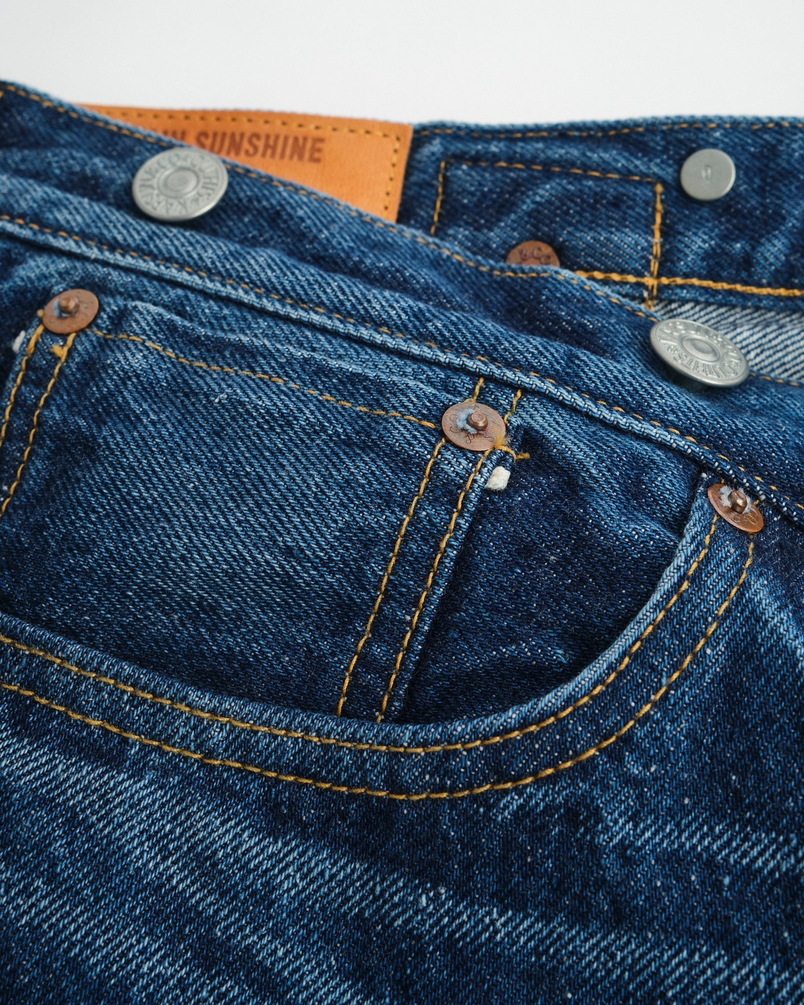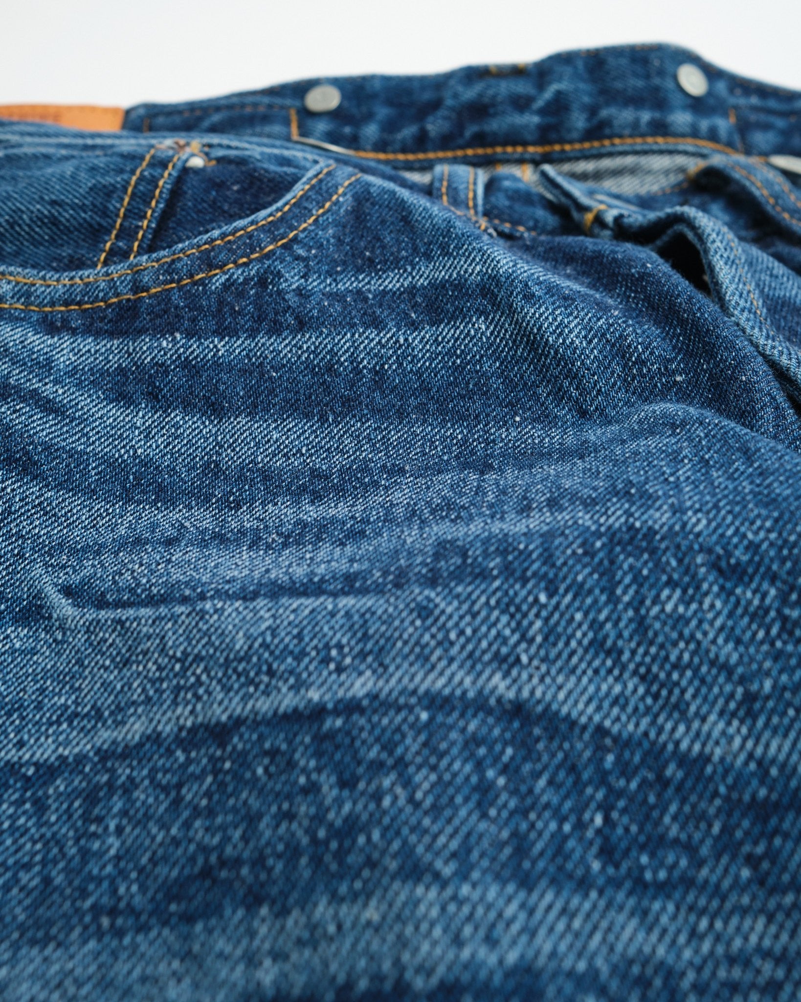 • Denim Selvedge 13,5oz : Teinté avec de l'indigo pur et tissé avec une tension faible