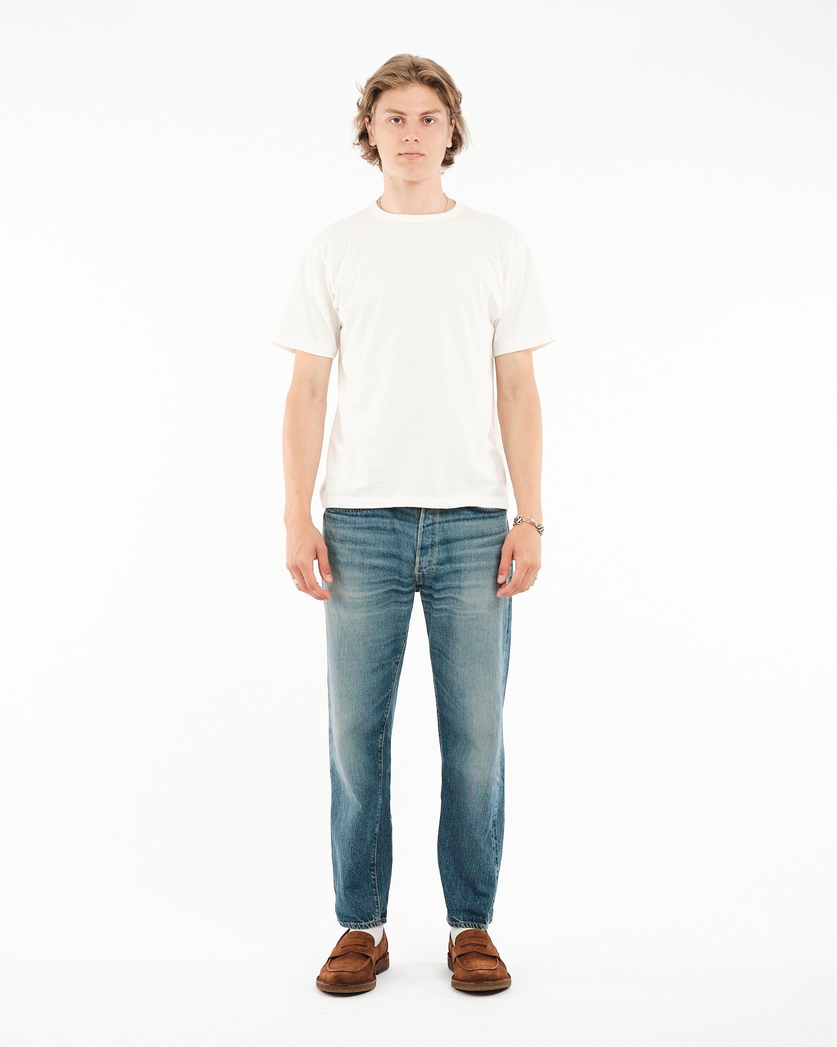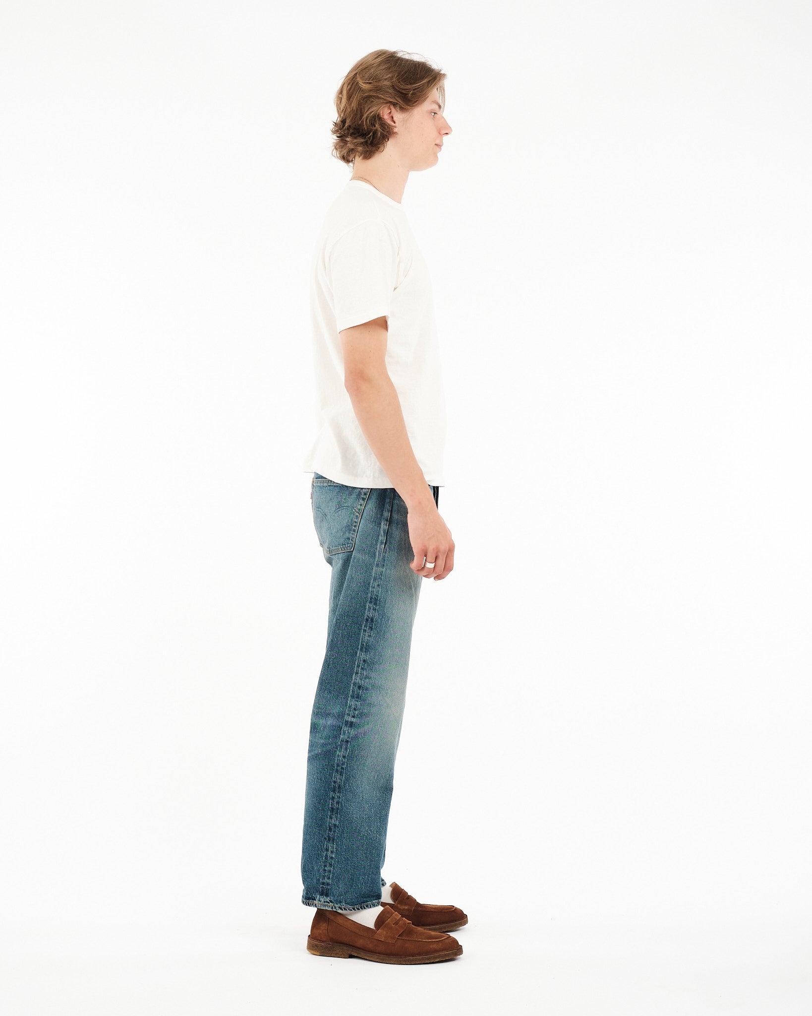 Inspiré par le denim des années 1960, le design présente une montée légèrement plus profonde et un ajustement droit avec un conique doux vers l'ourlet, offrant une silhouette classique qui complète divers types de corps. Les détails clés incluent une mouche de boutons traditionnelle, des poches arrière renforcées avec une subtile pénible pour imiter une véritable usure et des ourlets cousus de chaîne qui améliorent à la fois la durabilité et l'esthétique vintage. Les jeans sont ornés d'un patch en papier sur la ceinture, qui développera son propre caractère au fil du temps, et les poches arrière comportent des coutures et des onglets qui reproduisent authentiquement l'apparence du denim vintage bien usé.