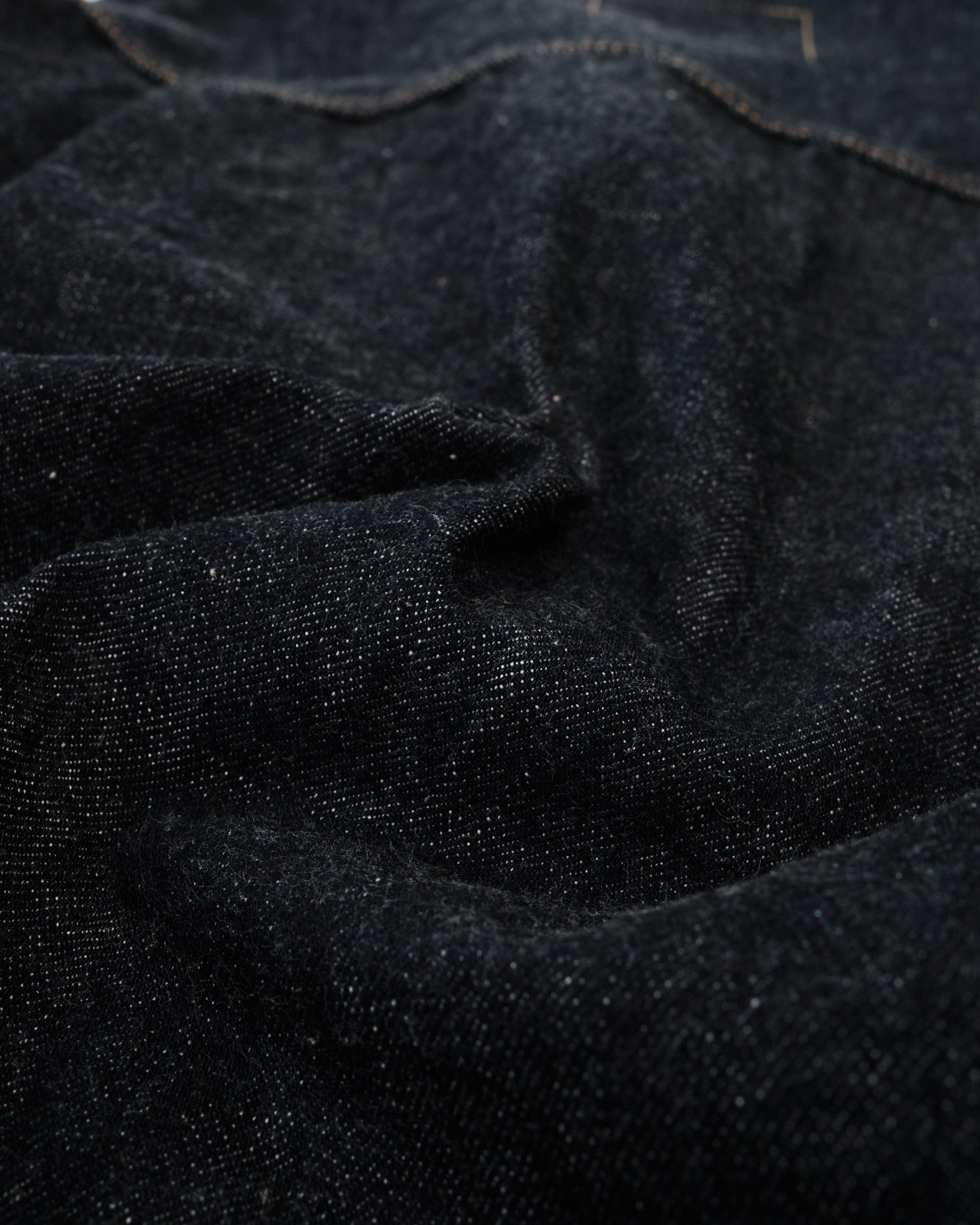 Coupée dans un denim de 13,5 oz tissé au Japon, le tissu mélange 65% de coton de Memphis pour la fermeté avec 35% de coton du Zimbabwe pour la douceur et la résistance. Teint en corde avec 100% d'indigo pur, les fils révèlent un cœur blanc net en vieillissant, créant de belles décolorations avec le temps. Utilisant un métier à tisser Sakamoto des années 1950 modifié, le tissu est tissé à faible tension, donnant au tissu une texture robuste qui évolue de manière unique avec l'usure. Fini avec un traitement de lavage unique, il est prêt à être porté tout en conservant son caractère de coton naturel.