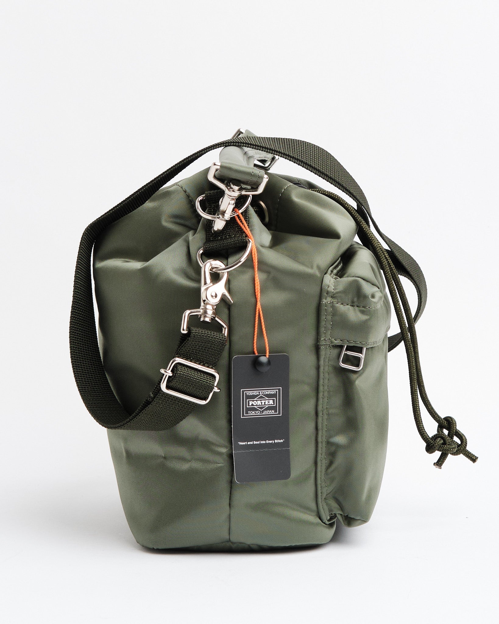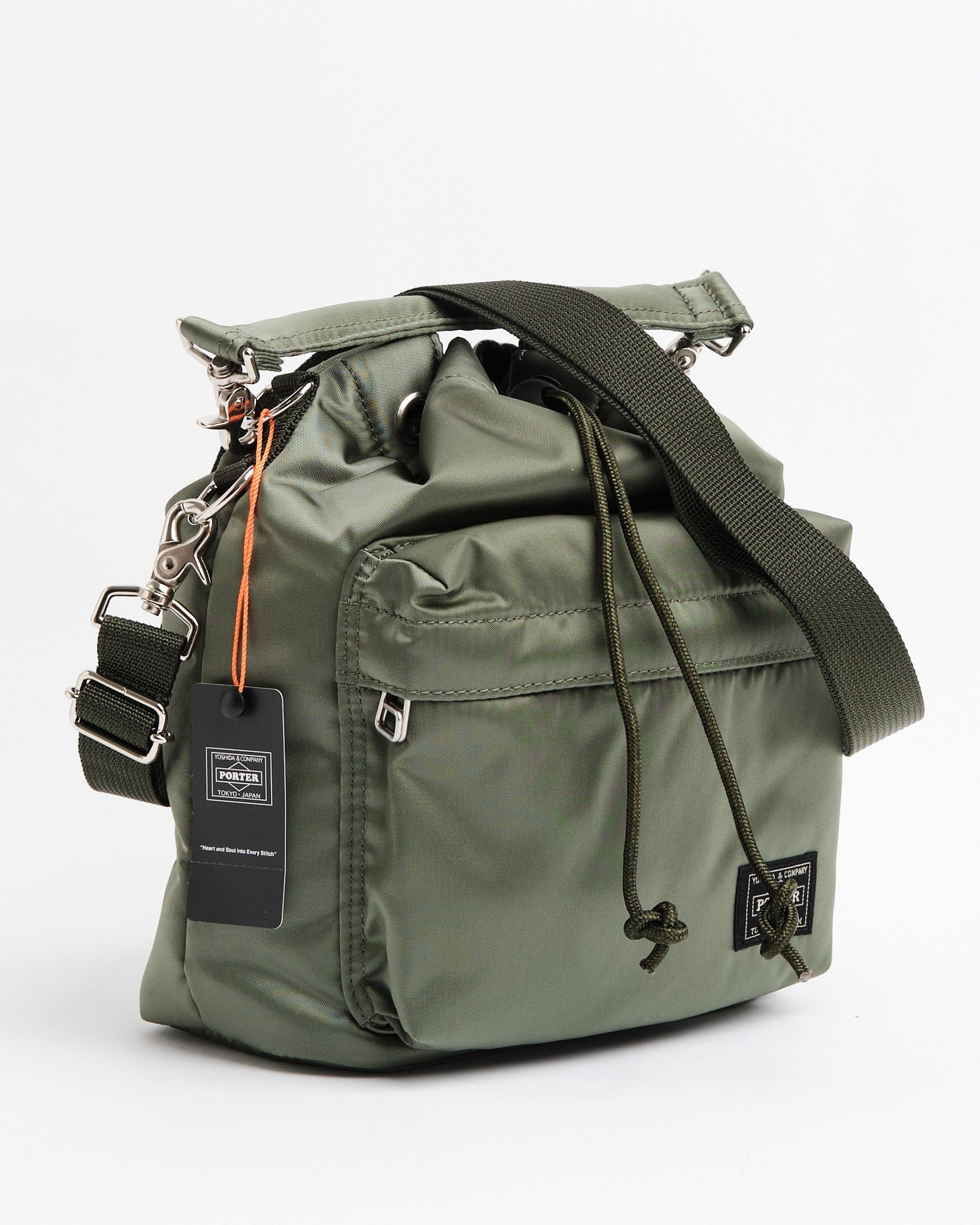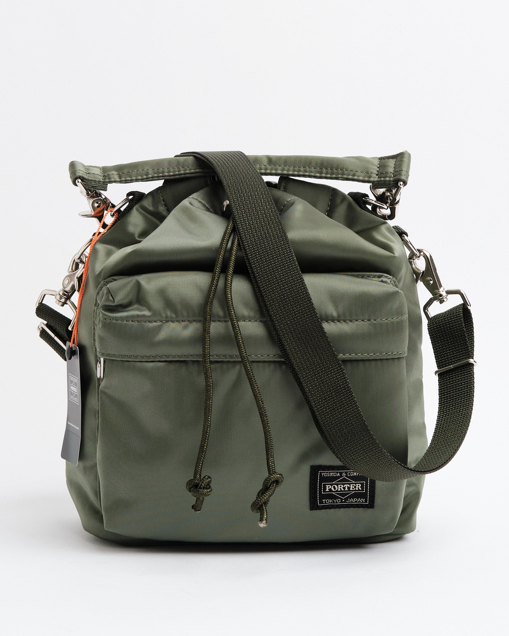 Découvrez le Porter Yoshida 381-16879-30 Bag (s) dans Sage Green. Ce sac s'inspire des sachets utilisés pour stocker de petits articles arborant une forme arrondie unique. Fabriqué à partir de tissu en nylon avec un processus de liaison en coton, il possède une brillance et une texture veloutée moelleuse. La fermeture du cordon supérieur permet d'accéder au compartiment principal tandis que le bouchon de cordon réglable vous permet de régler le formulaire de sacs. Il est livré avec des poignées et un bandoulière pour des options de transport variées. Les cordons comportent deux designs, l'un en noir et orange et l'autre correspondant à la couleur des sacs, ce qui donne une flexibilité. L'intérieur est bordé de tissu marine. Dimensionné à w; 190 mm, H; 255 mm, D; 105 mm (w; 7,5 pouces h; 10 pouces, d; 4,1 pouces). Pesant 400 g (14,1 oz), ce sac compact est idéal pour les éléments essentiels, comme votre portefeuille et votre smartphone.