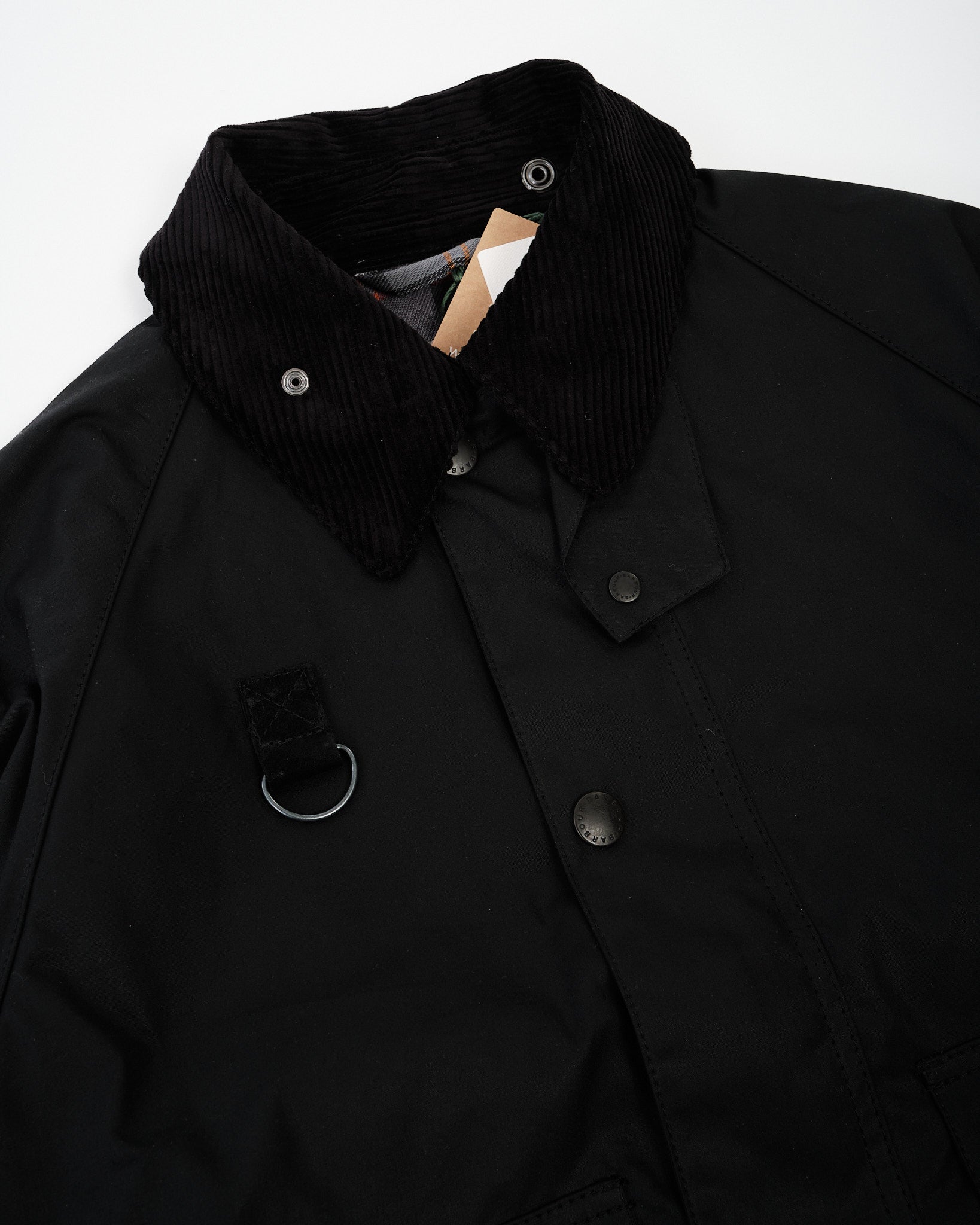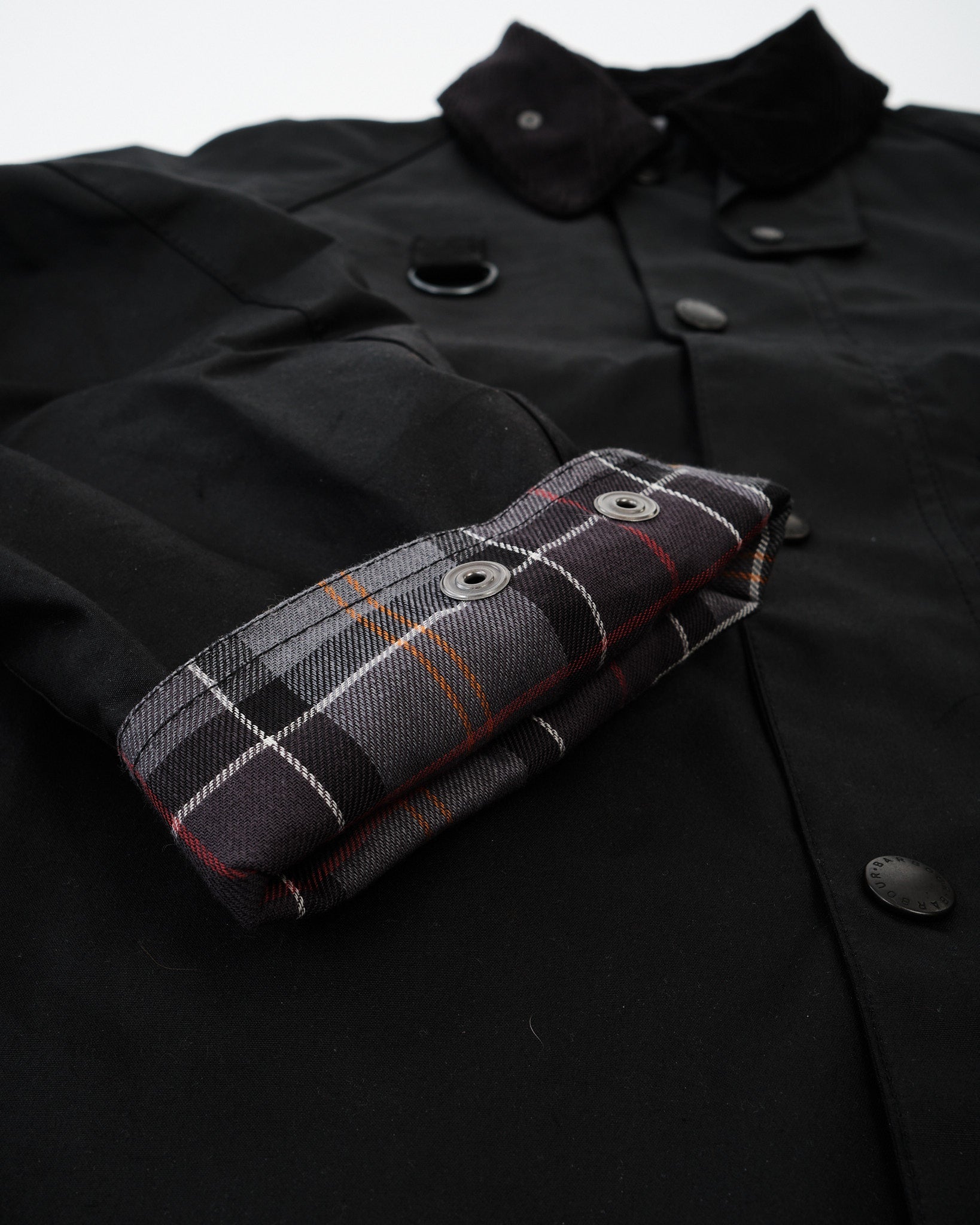 • Col en velours côtelé net avec revers de manchette en tartan—détail signature Barbour