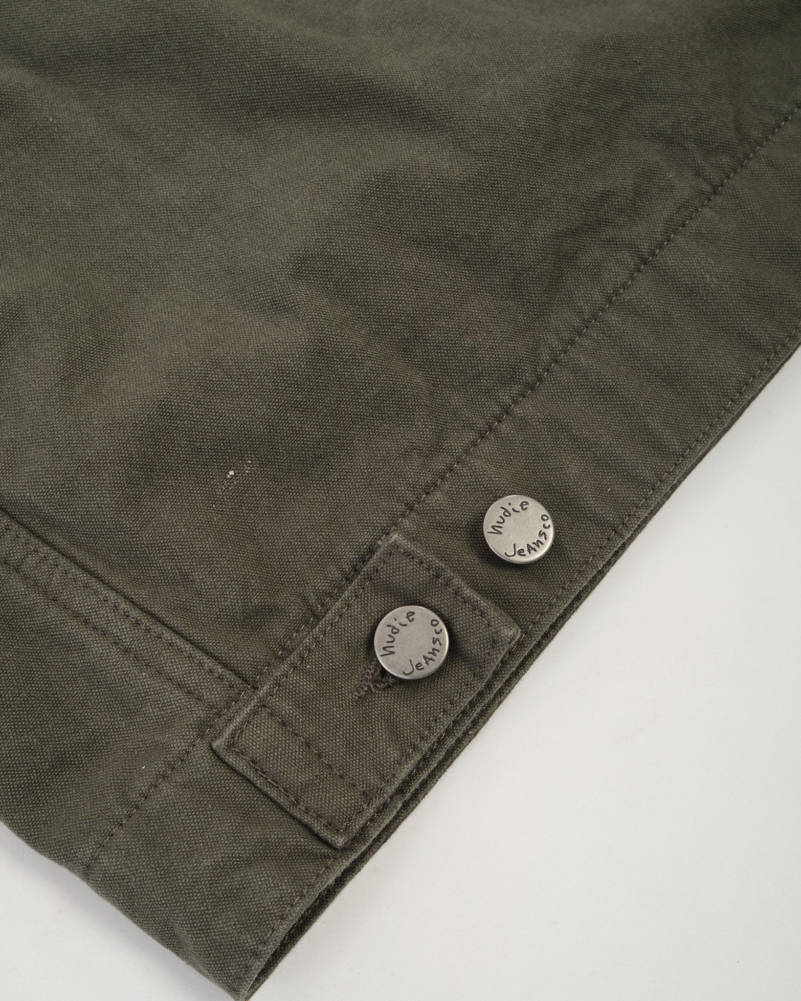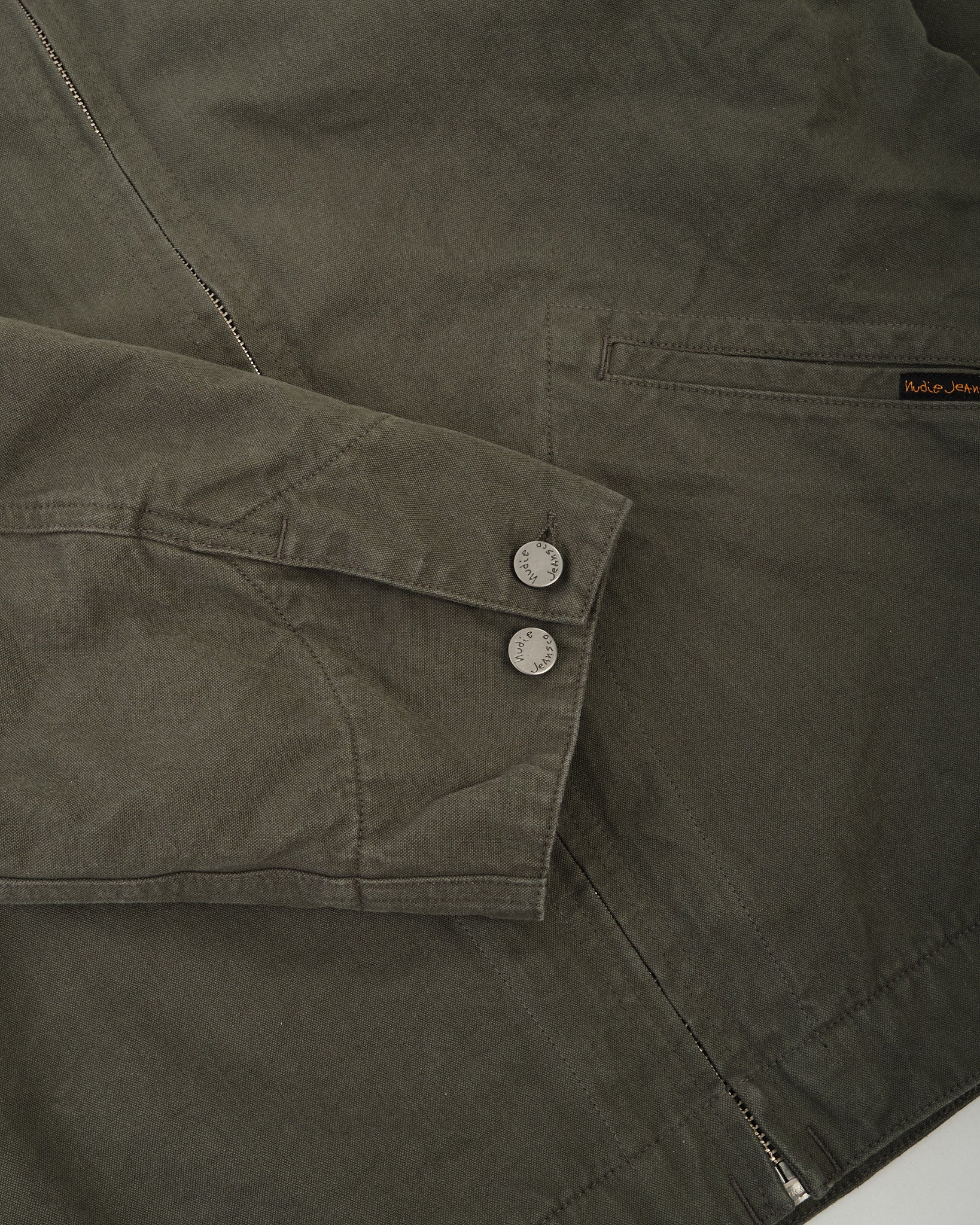 Le Nudie Jeans CO. Blake Zip Jacket Canvas Green reste fidèle à la silhouette de veste de travailleurs classiques, avec un Ajustement régulier avec une coupe courte et carrée pour une conception intemporelle mais fonctionnelle. Fabriqué à partir de toile de canard robuste, cette veste offre une durabilité et une texture distinctive qui âges magnifiquement au fil du temps.