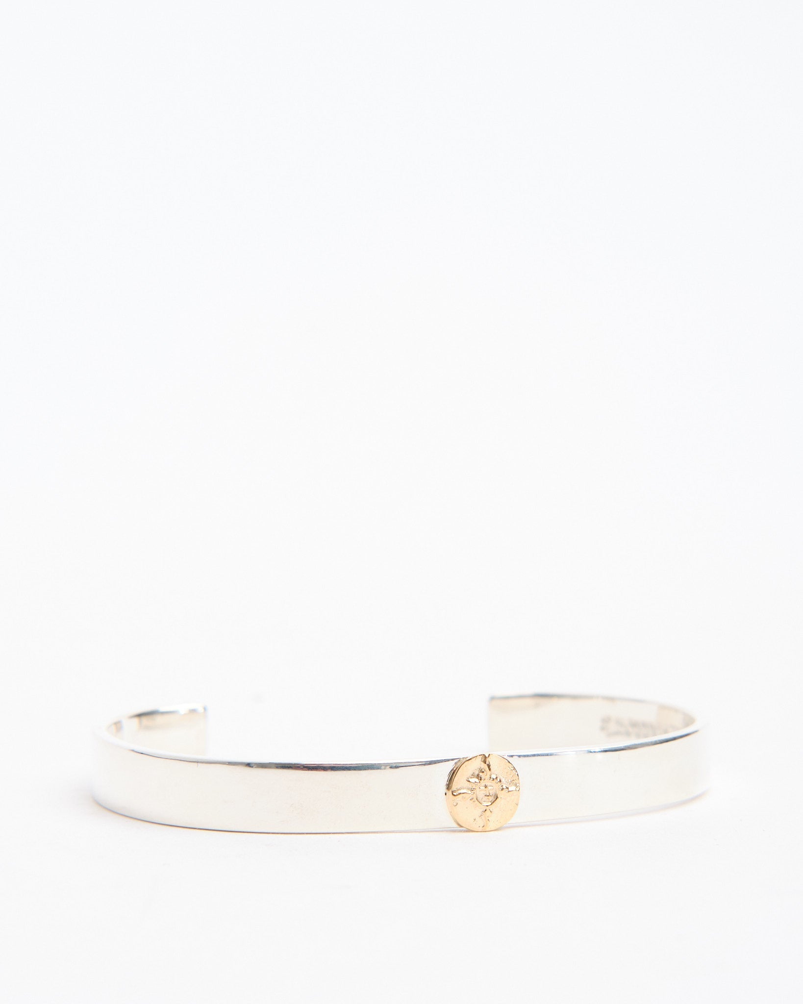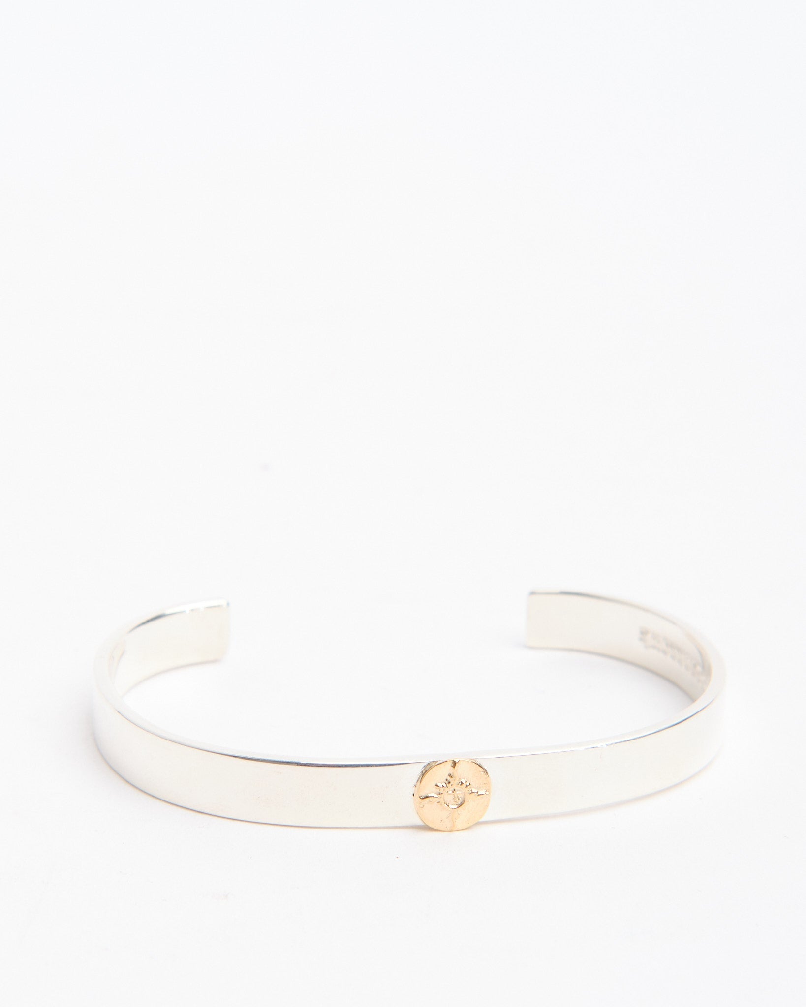 The Flat Hammered 8mm Plane Bungle with K18 in M size balances bold craftsmanship with everyday wearability. Handcrafted in Japan from Britannia Silver 950, this bracelet features a slimmer 8mm profile that still carries the character of a hammered surface, each mark adding depth and reflection. A touch of 18k yellow gold brings warmth and contrast, highlighting the beauty of mixed metals. Reinforced with First Arrows’ special heat-treatment process, the silver is bright yet durable, designed to age gracefully as its tone darkens and plays against the gold’s enduring glow. Inspired by Native American jewelry but refined for modern life, this bungle is versatile enough to stand alone or to be layered with other pieces.