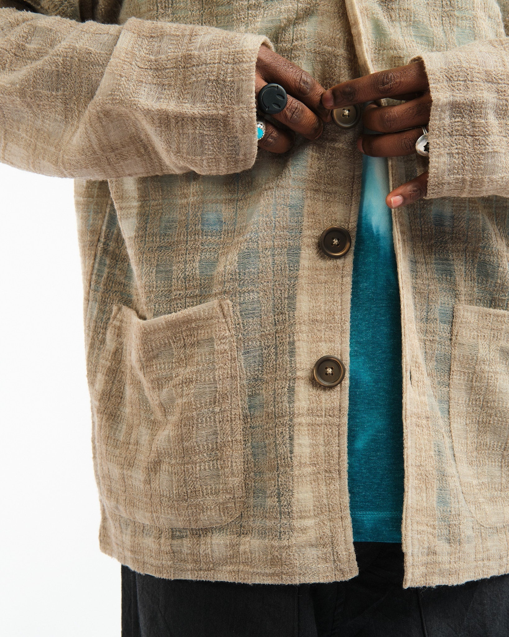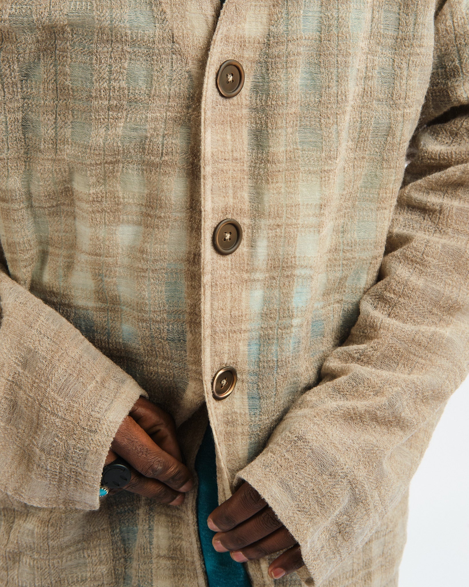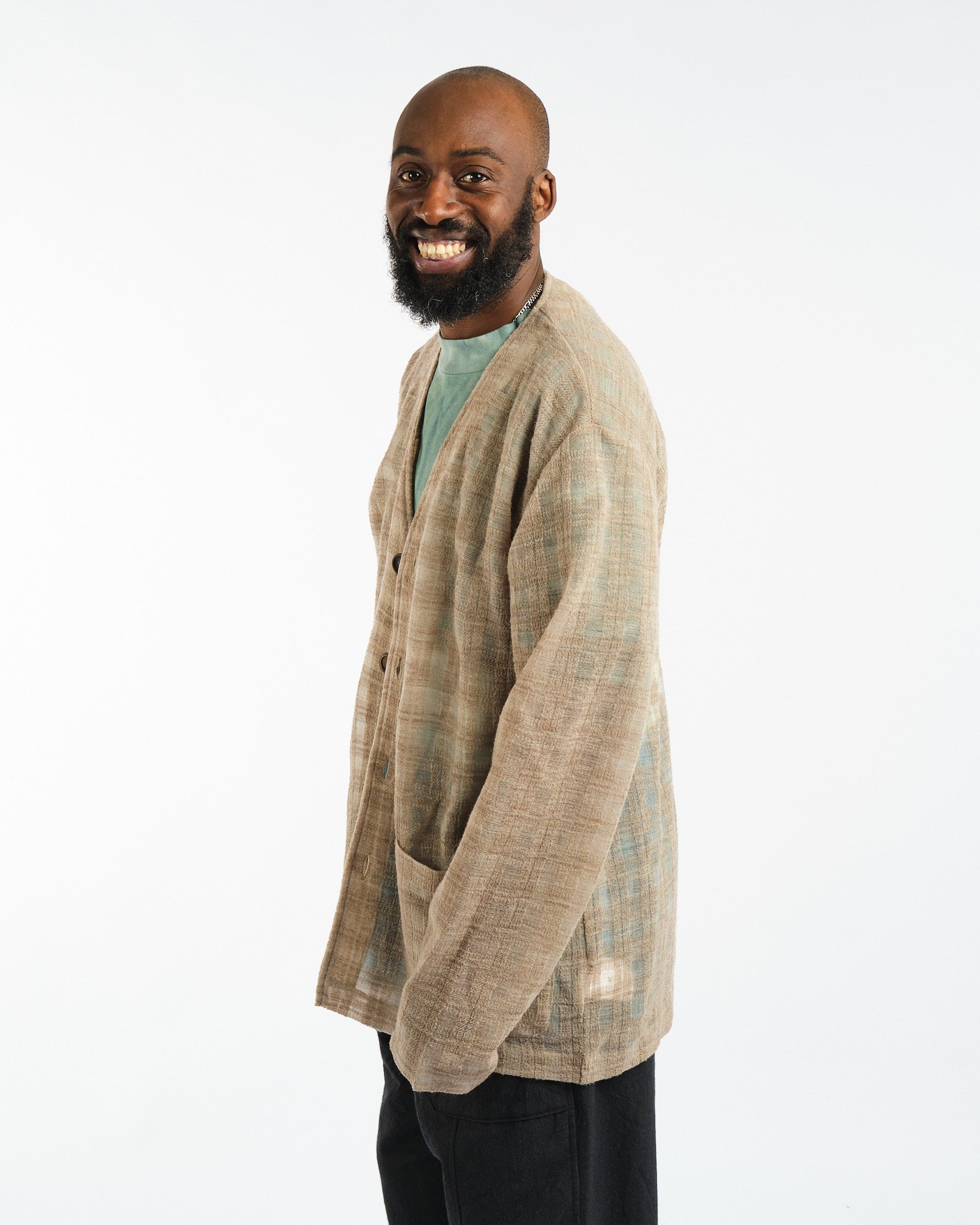 Ce vêtement est fabriqué à l'aide d'un matériau spécial qui est soigneusement sélectionné pour ses propriétés uniques. Alors que le porteur enfile le cardigan, il prendra sa forme et sa détresse naturellement au fil du temps, terminant le processus de conception avec une ambiance décontractée et amusante.