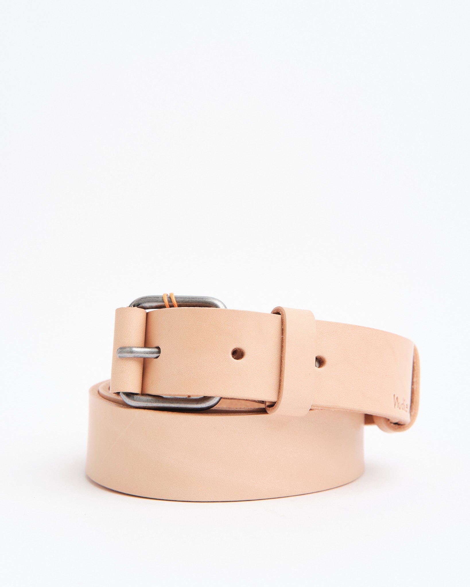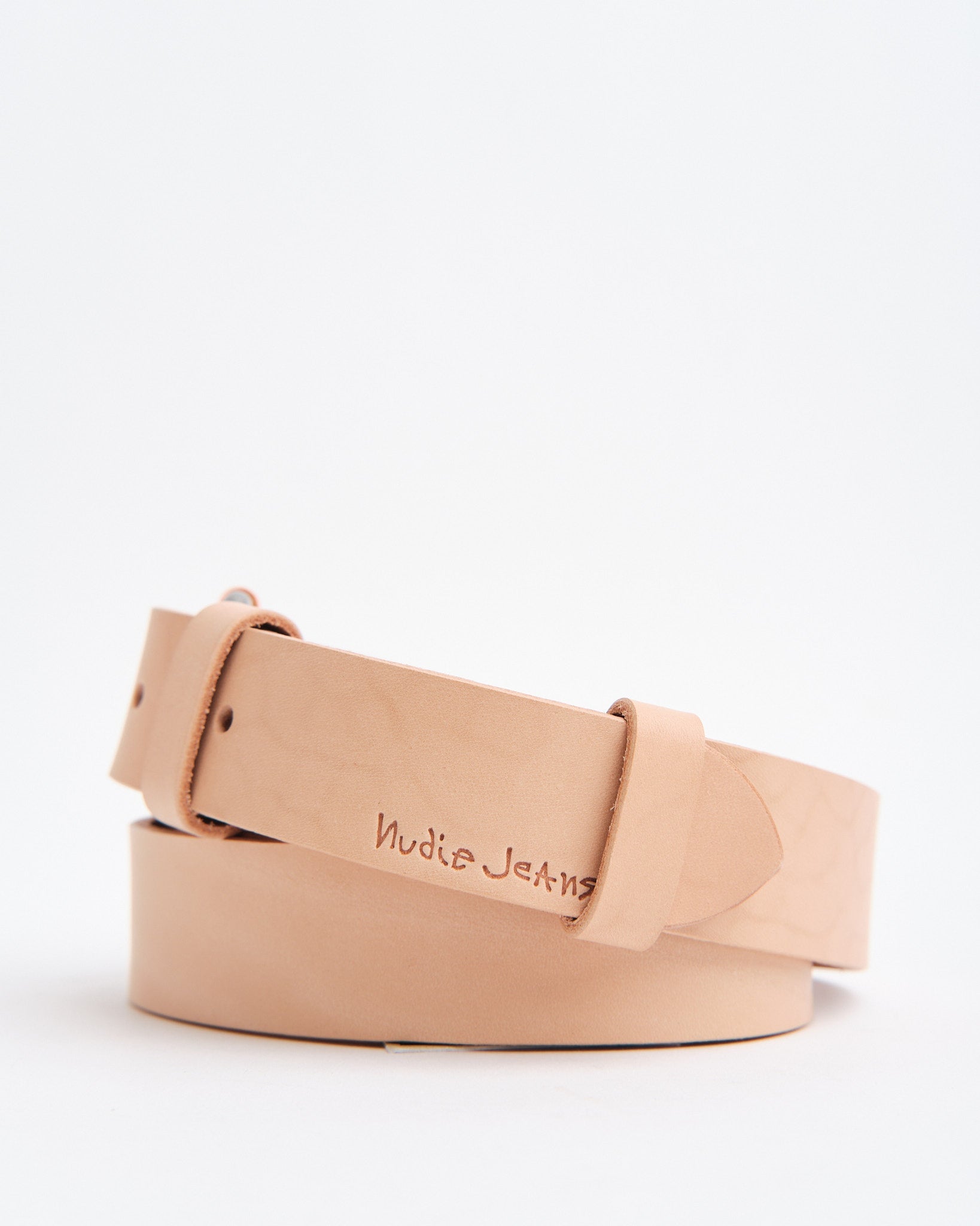 Dwayne Leather Belt Natural de Nudie Jeans Co. découpé à partir d'un cuir à grain complet à tannage à légumes qui vieillira magnifiquement. Deux boucles, boucle en métal et logo en relief en jean Nudie. 100% cuir et 28 mm de largeur. Les tailles sont en CM. Fabriqué en Pologne.
