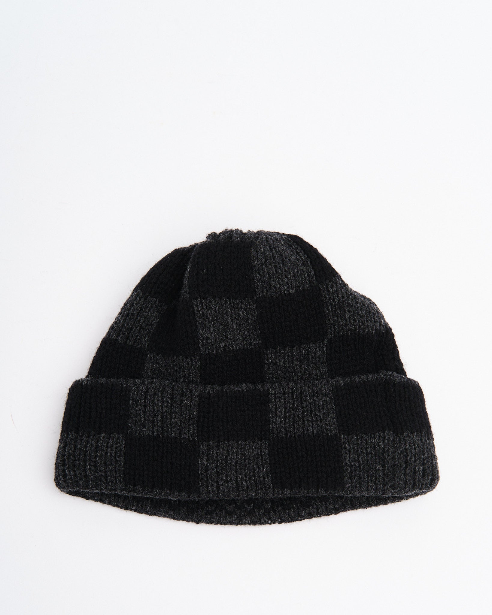 The Checker Beanie in Black by Found Feather is a refined staple made for everyday wear. Crafted in Japan from soft, washable Italian Donegal wool, it features a jacquard knit that offers visual depth and a subtly flecked finish. A single-panel construction and stretch yarn ensure a snug, unisex fit, while the 7 cm brim and 18 cm crown height create a clean, timeless profile. Finished with a woven label and QR-coded care tag, it’s built for comfort, utility, and understated style.