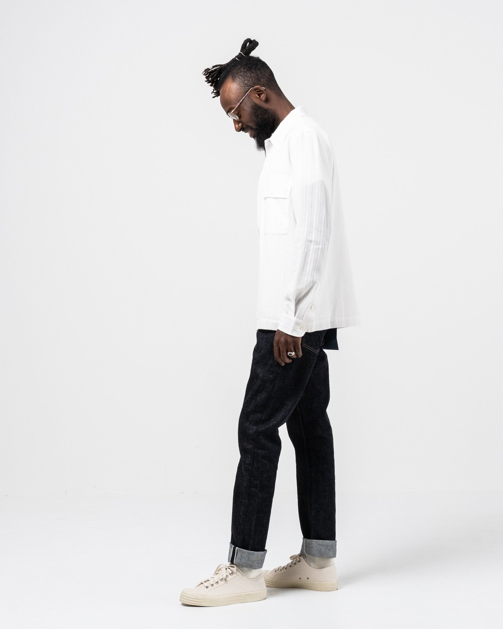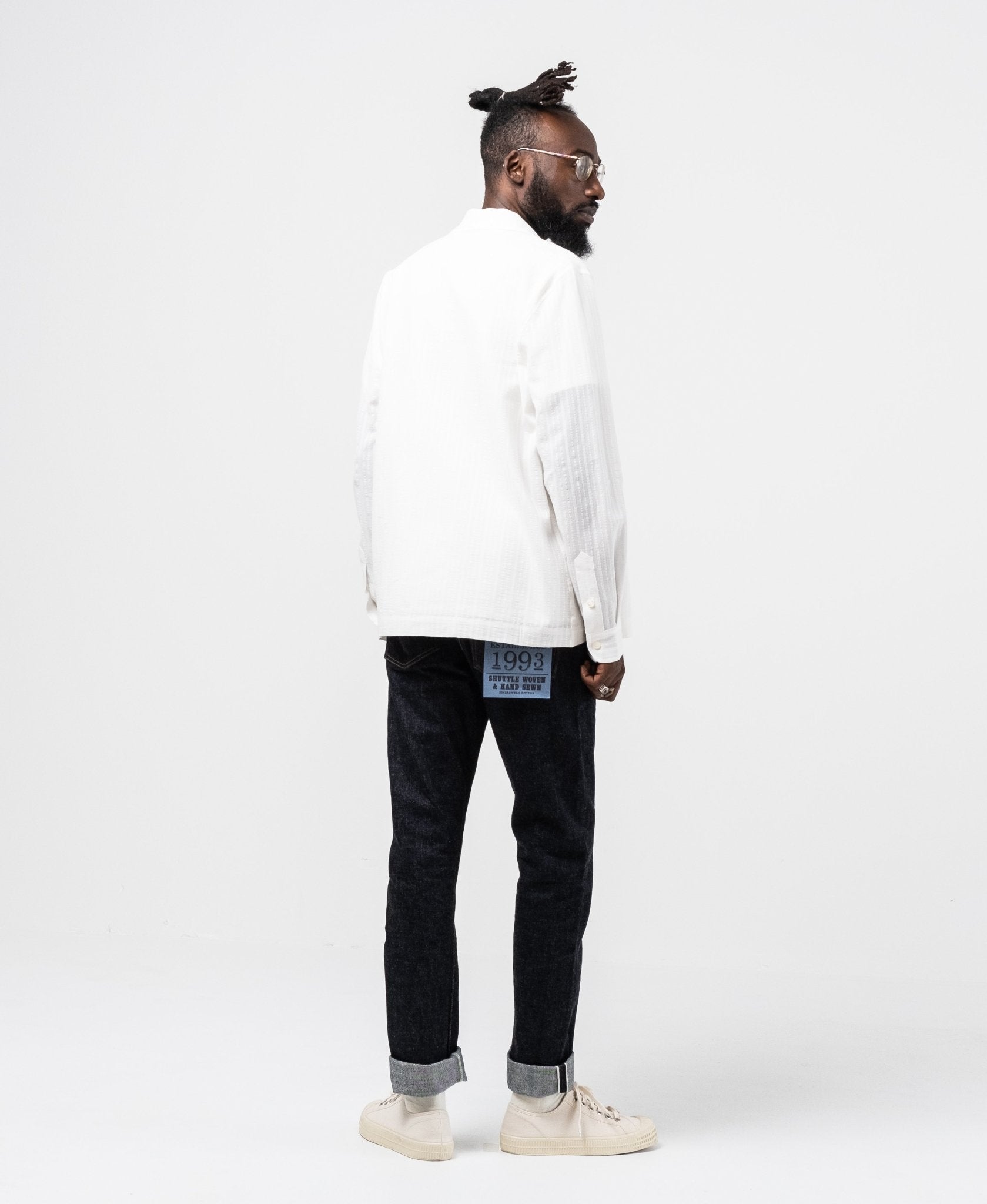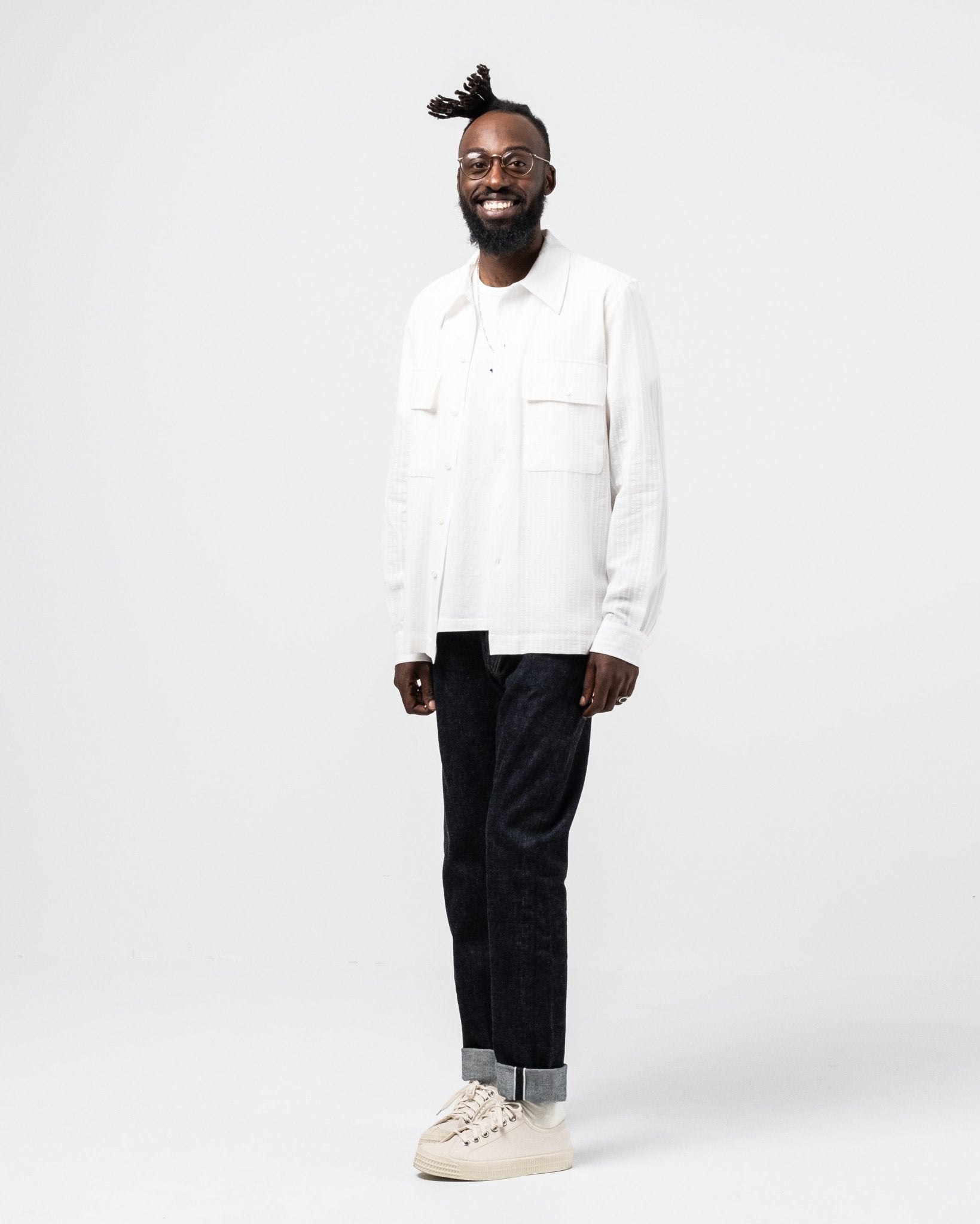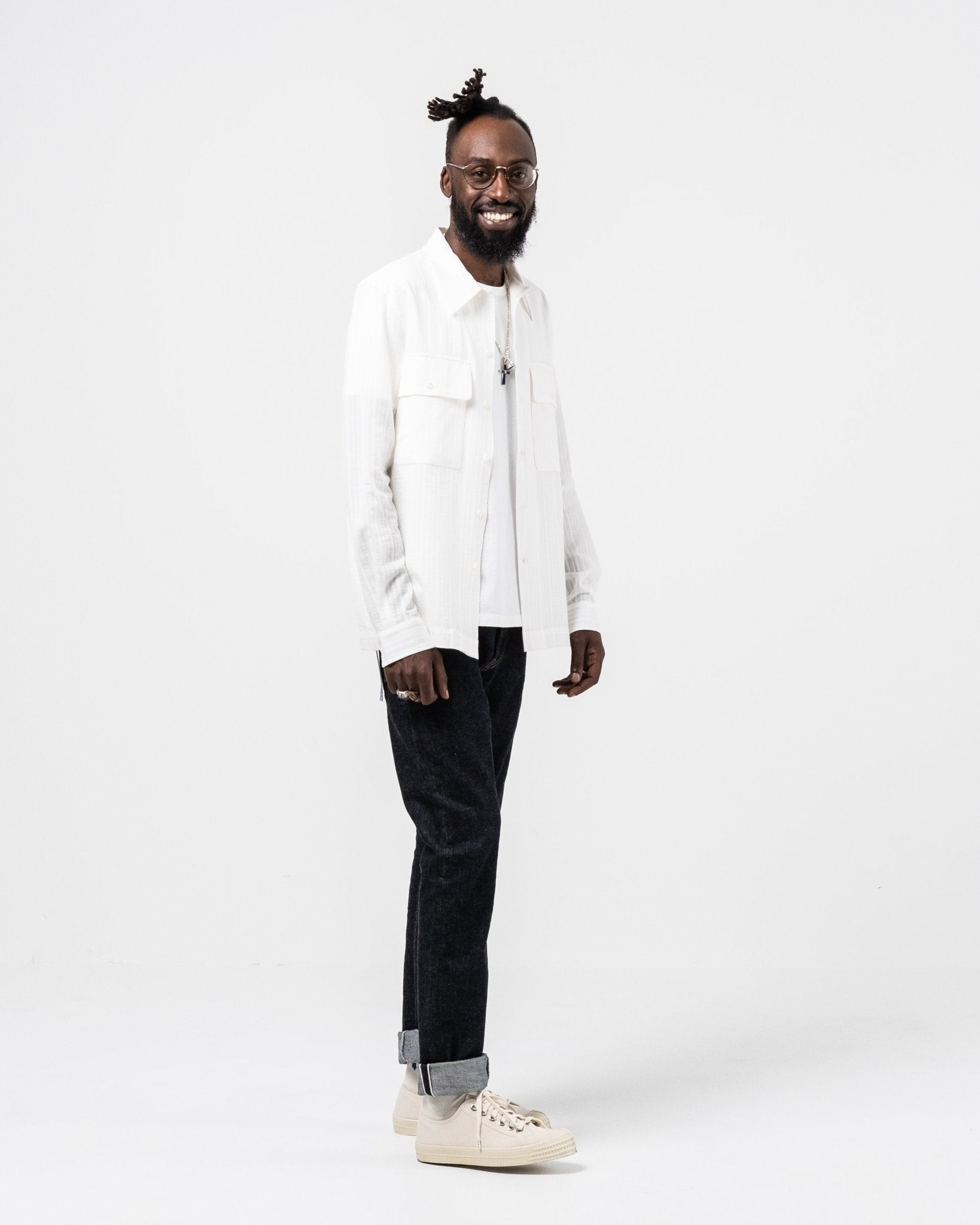 Lukey Shirt White formel de Séfr. Chemise inspirée militaire avec deux poches de poitrine, collier large et boutons de la mère des perles. Tissu léger et confortable dans 69% de coton, 25% de lin et 6% de polyamide. Fait en Lettonie.