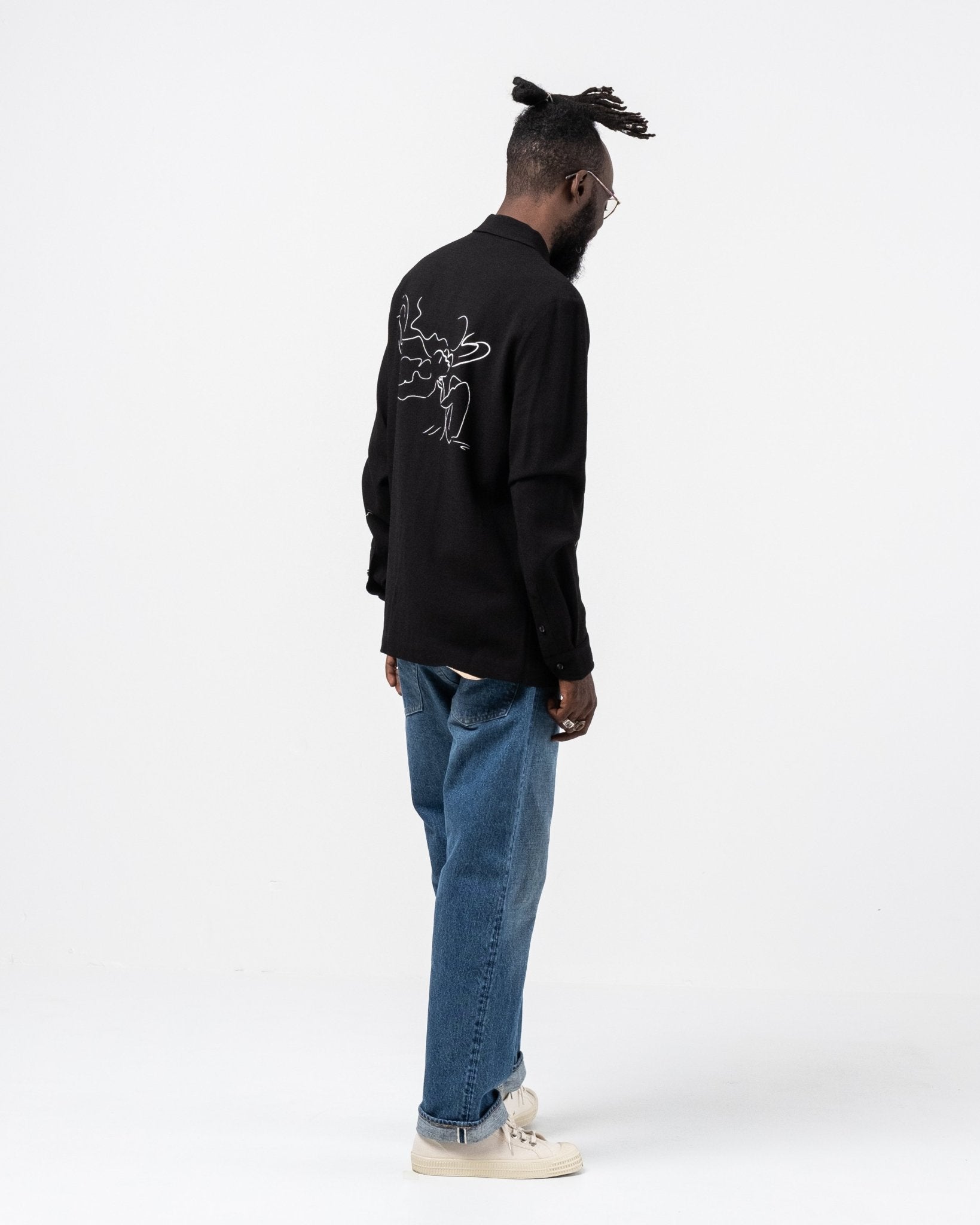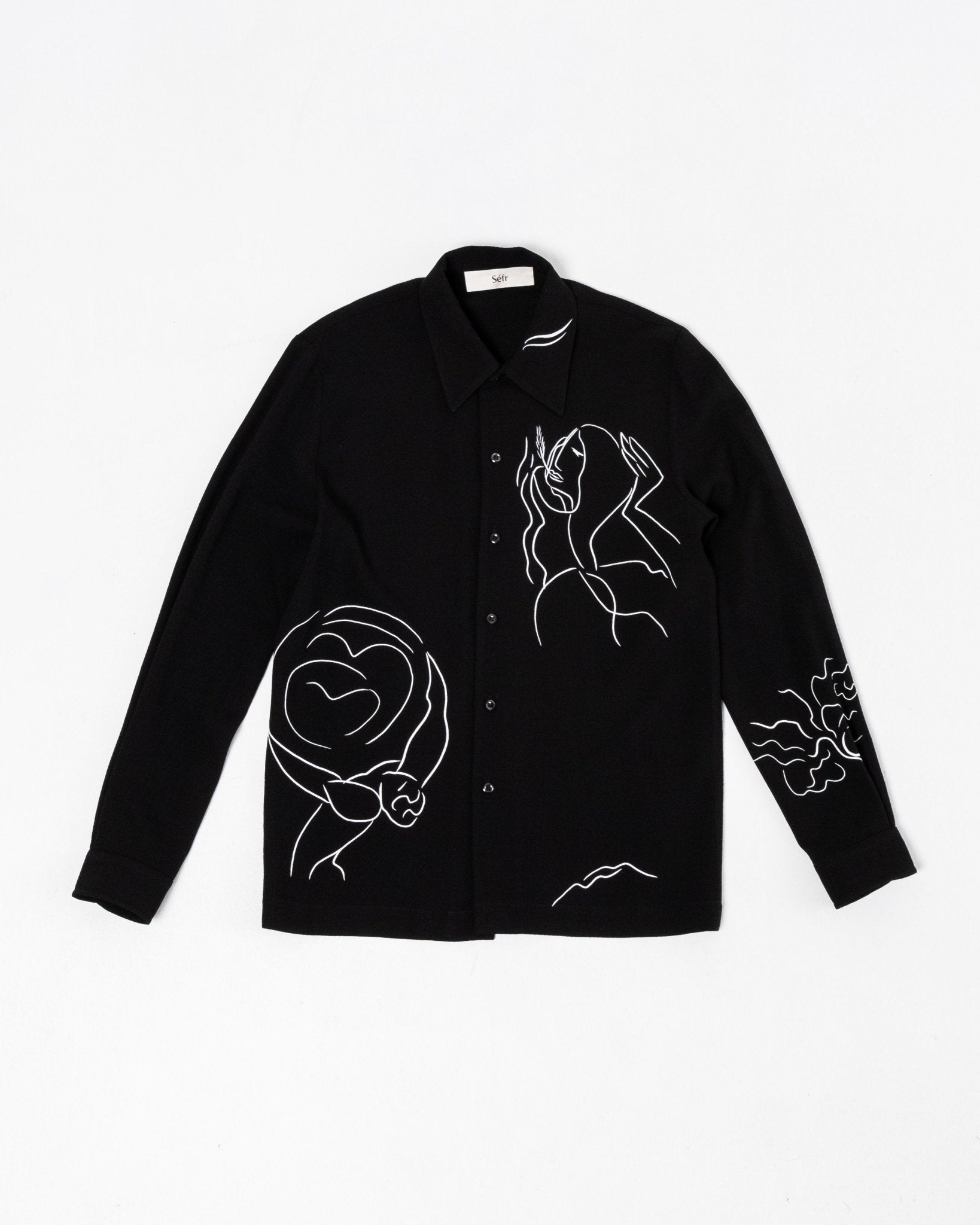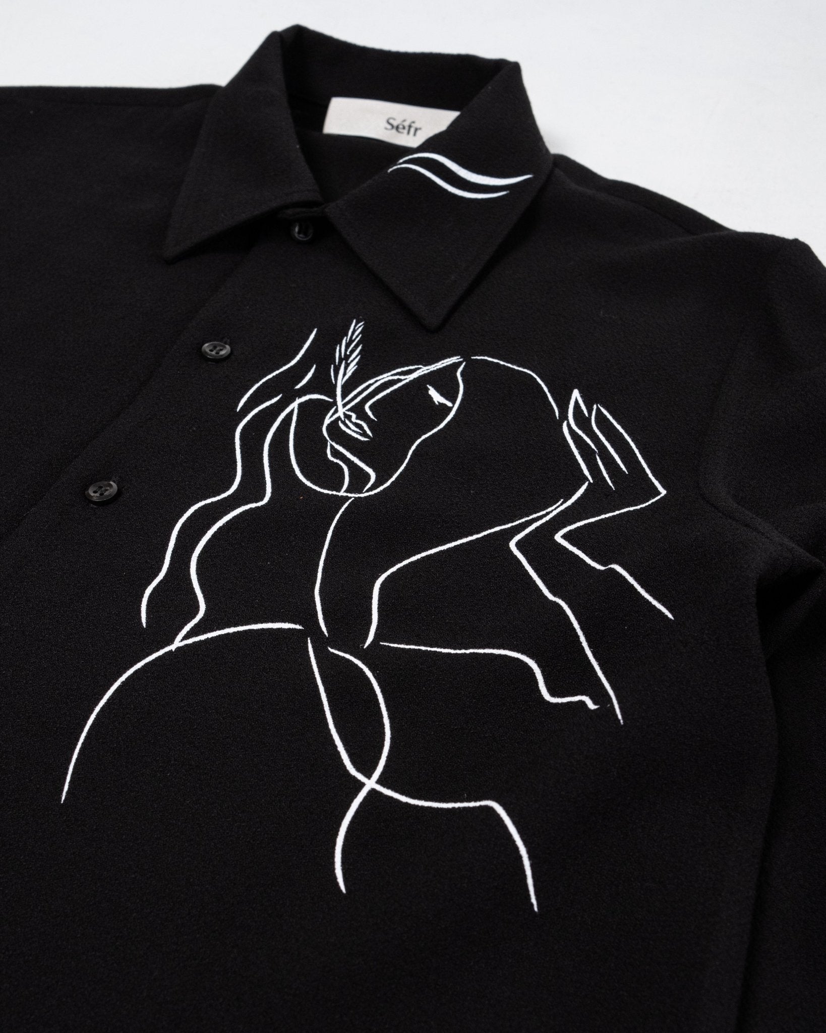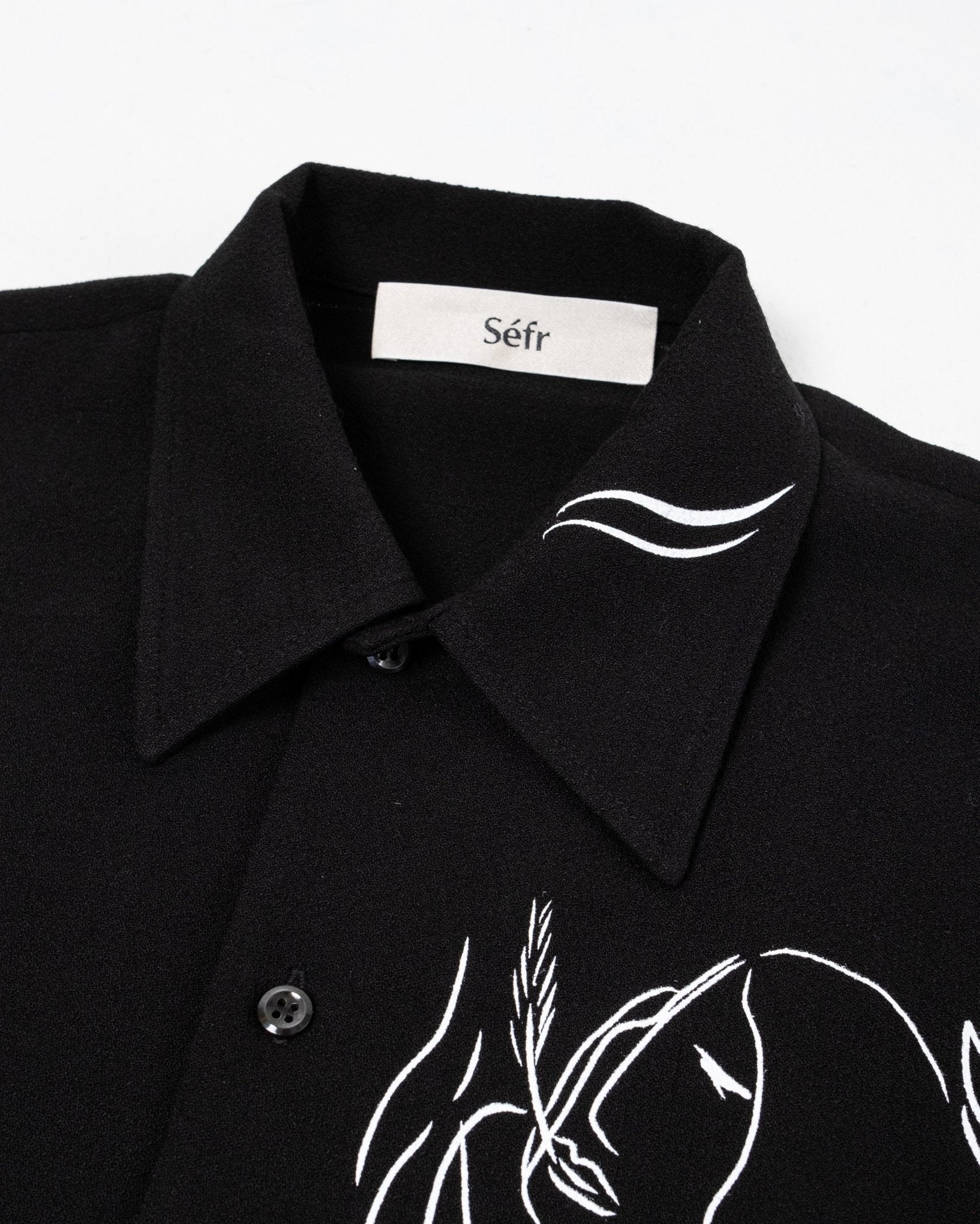 Ripley Shirt Silent Print de Séfr. Chemise à manches longues avec collier large et boutons de la mère des perles. Coupe droite avec une impression silencieuse en viscose à 60% et 40% ULL. Fait en Lettonie.
