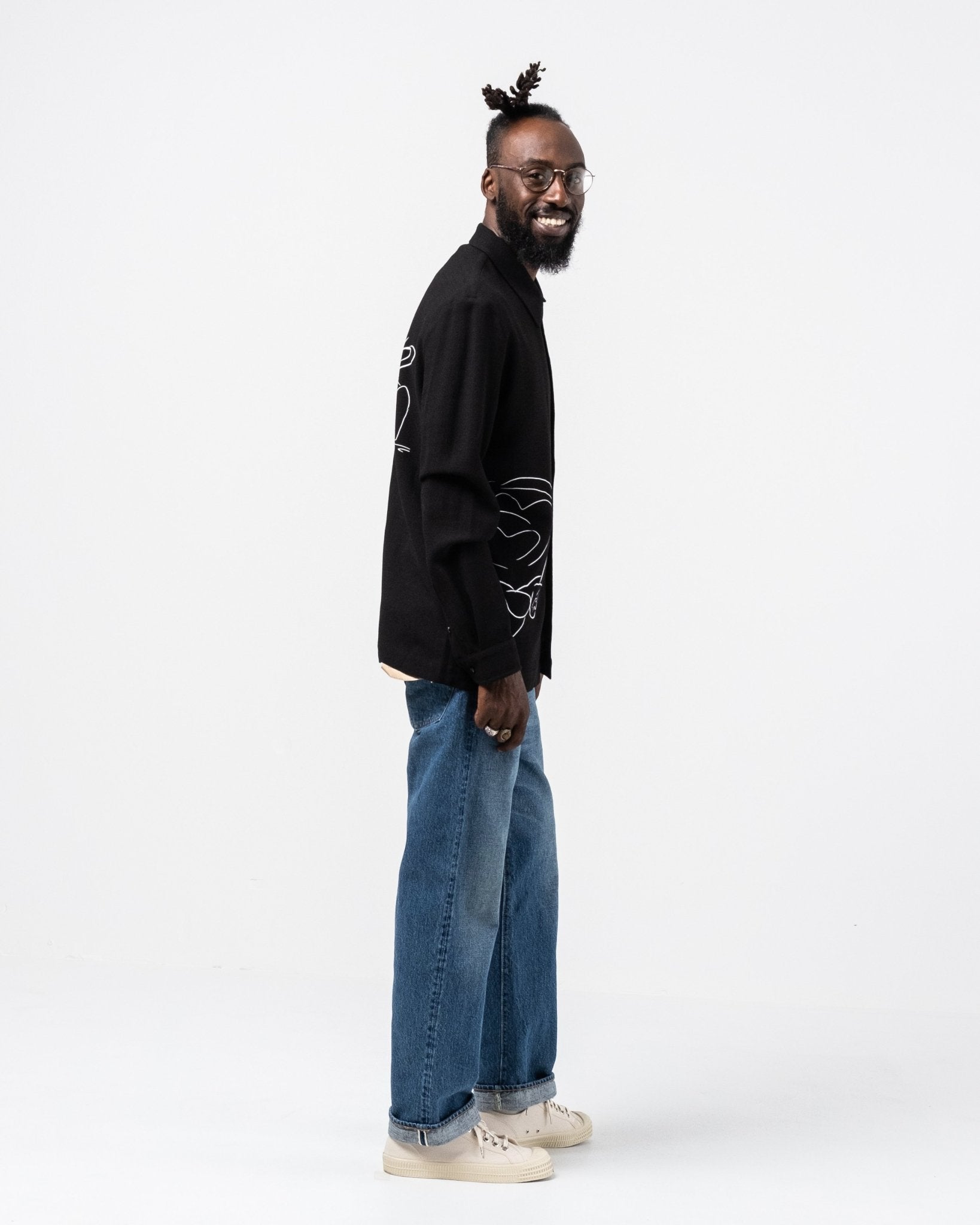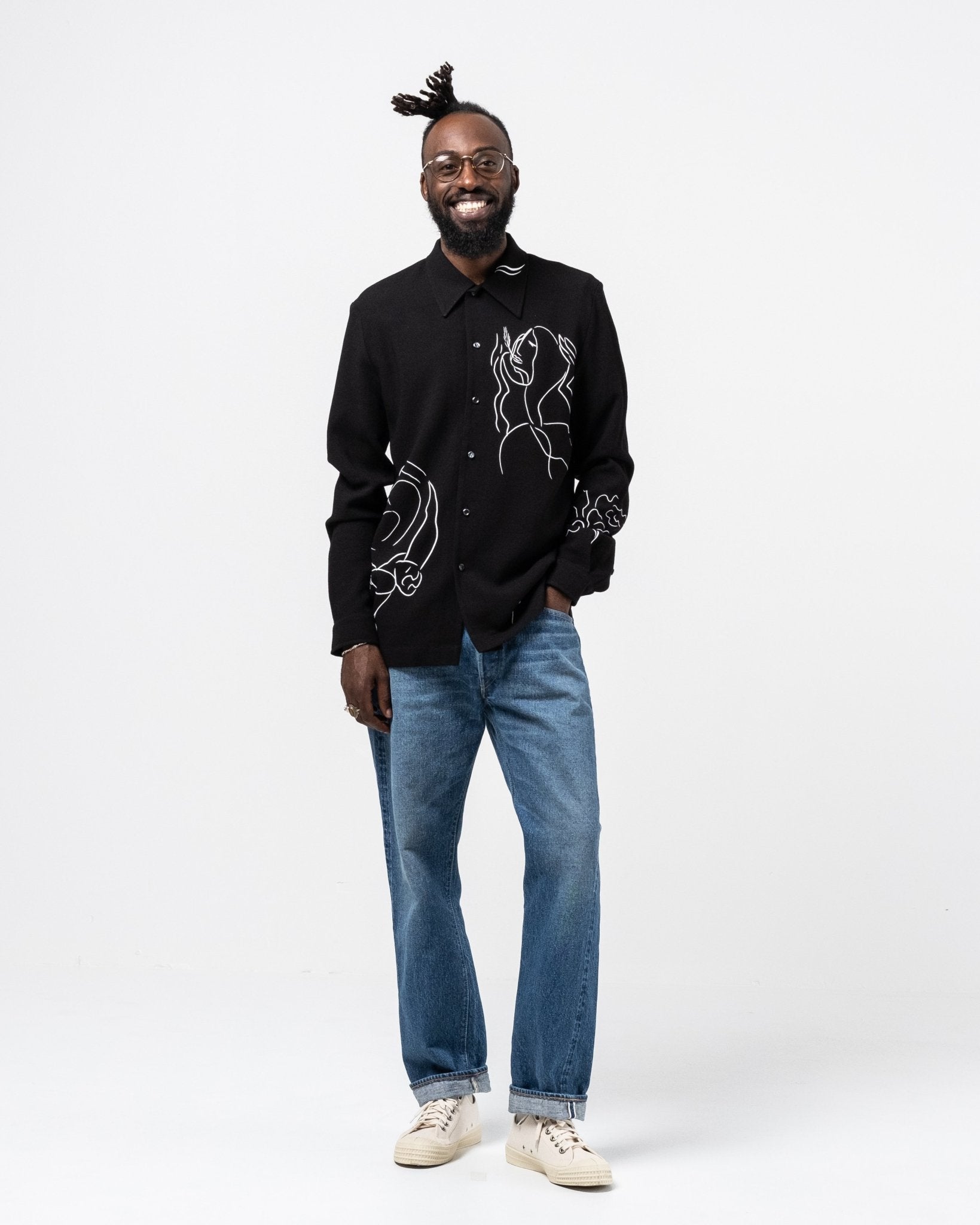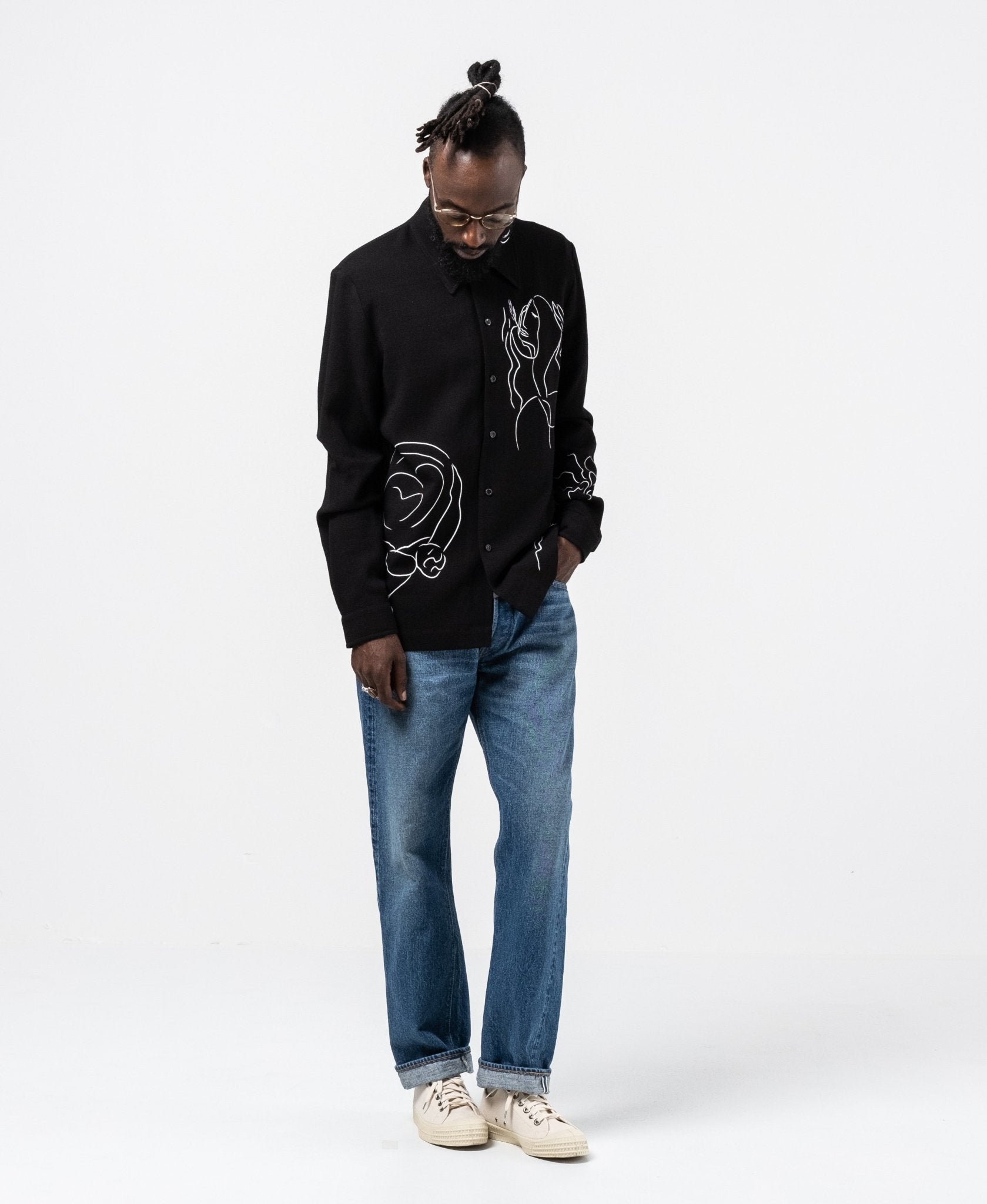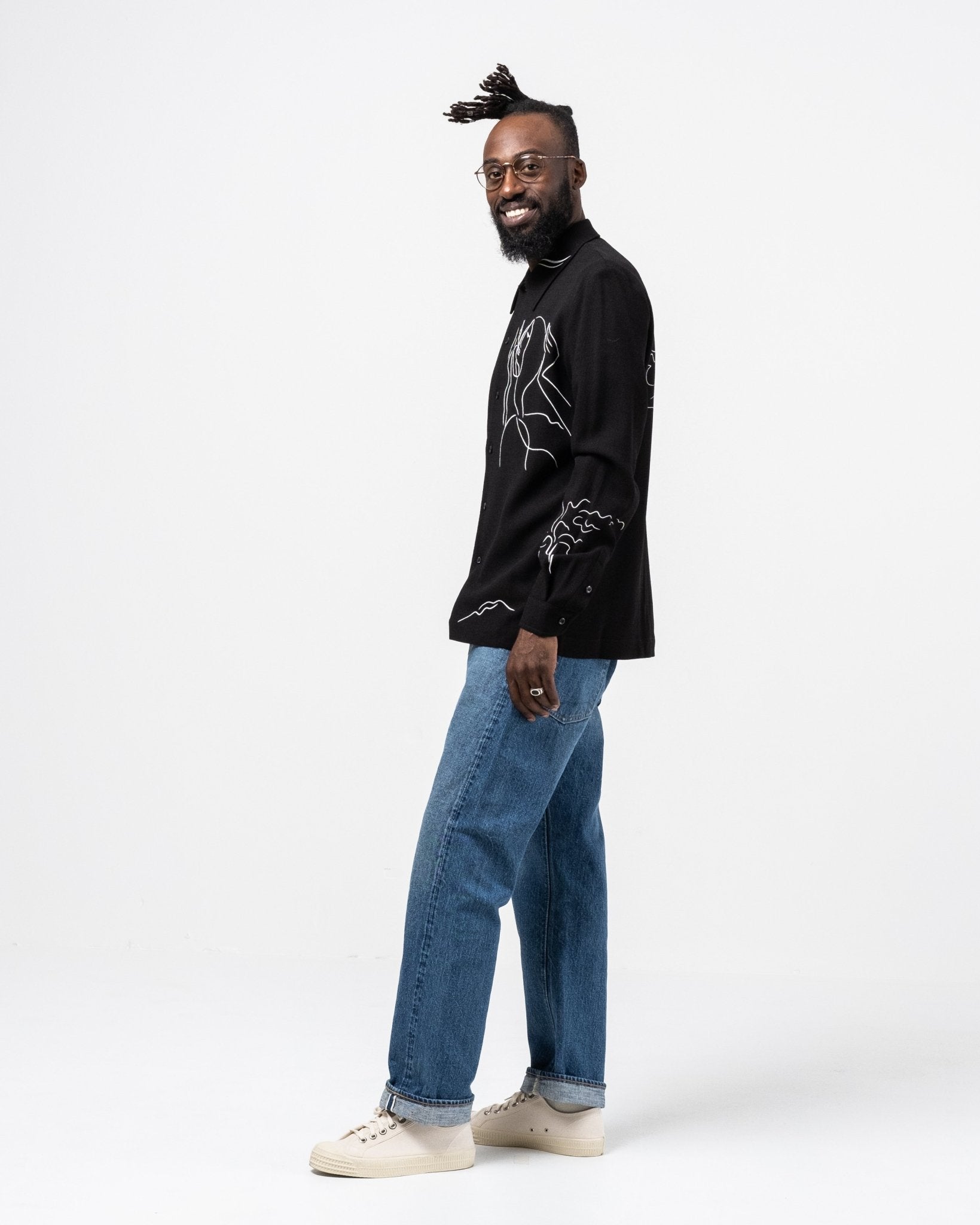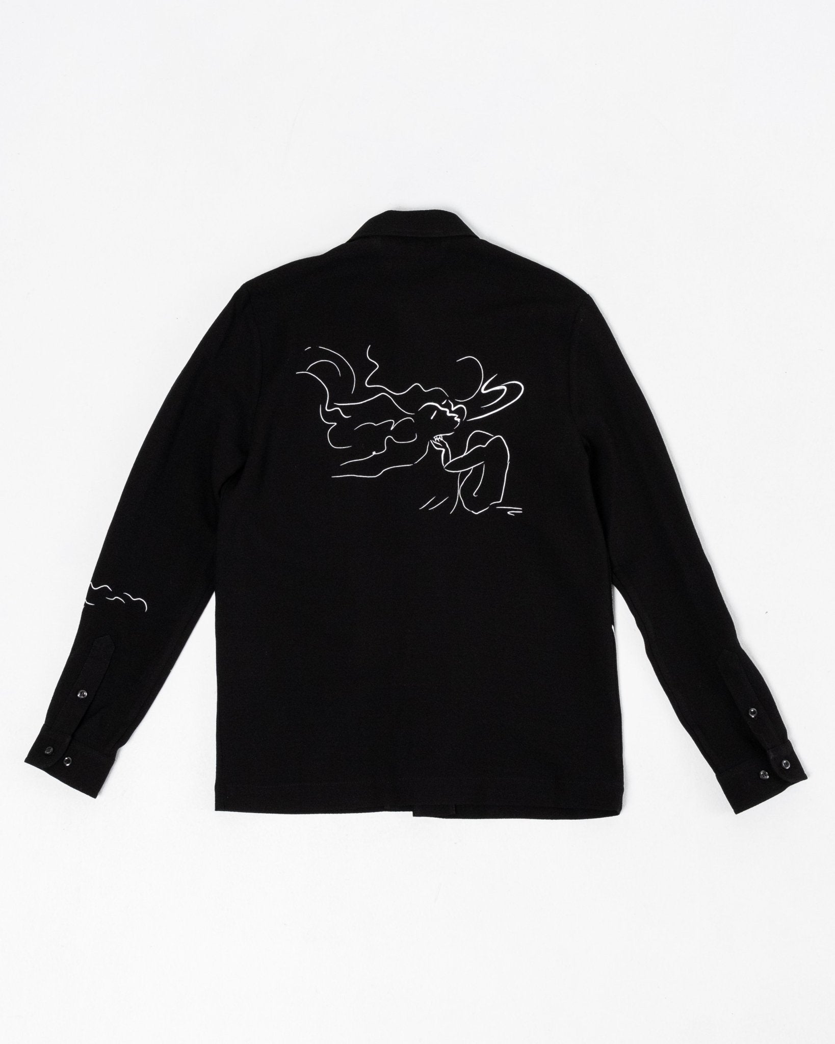 Ripley Shirt Silent Print de Séfr. Chemise à manches longues avec collier large et boutons de la mère des perles. Coupe droite avec une impression silencieuse en viscose à 60% et 40% ULL. Fait en Lettonie.