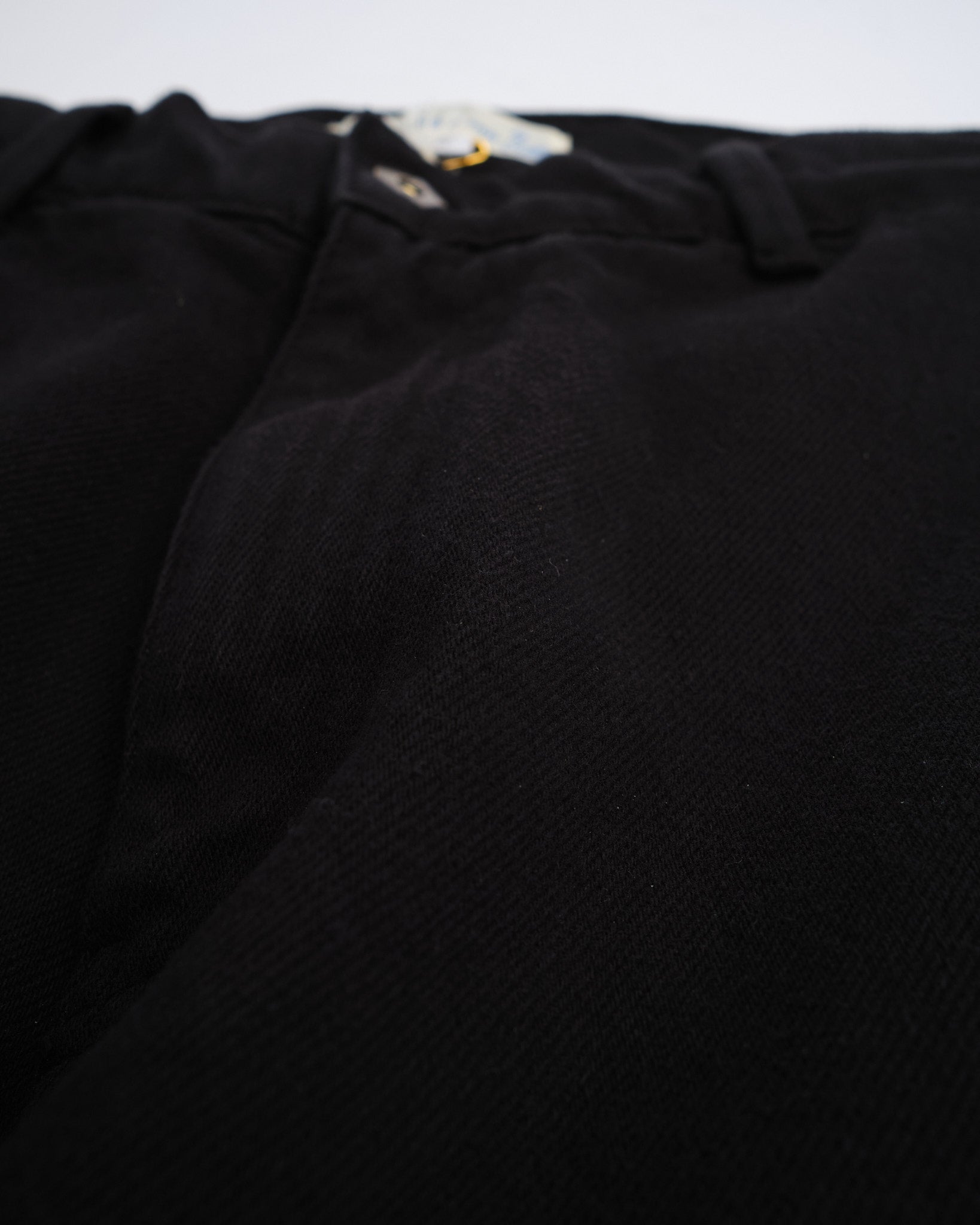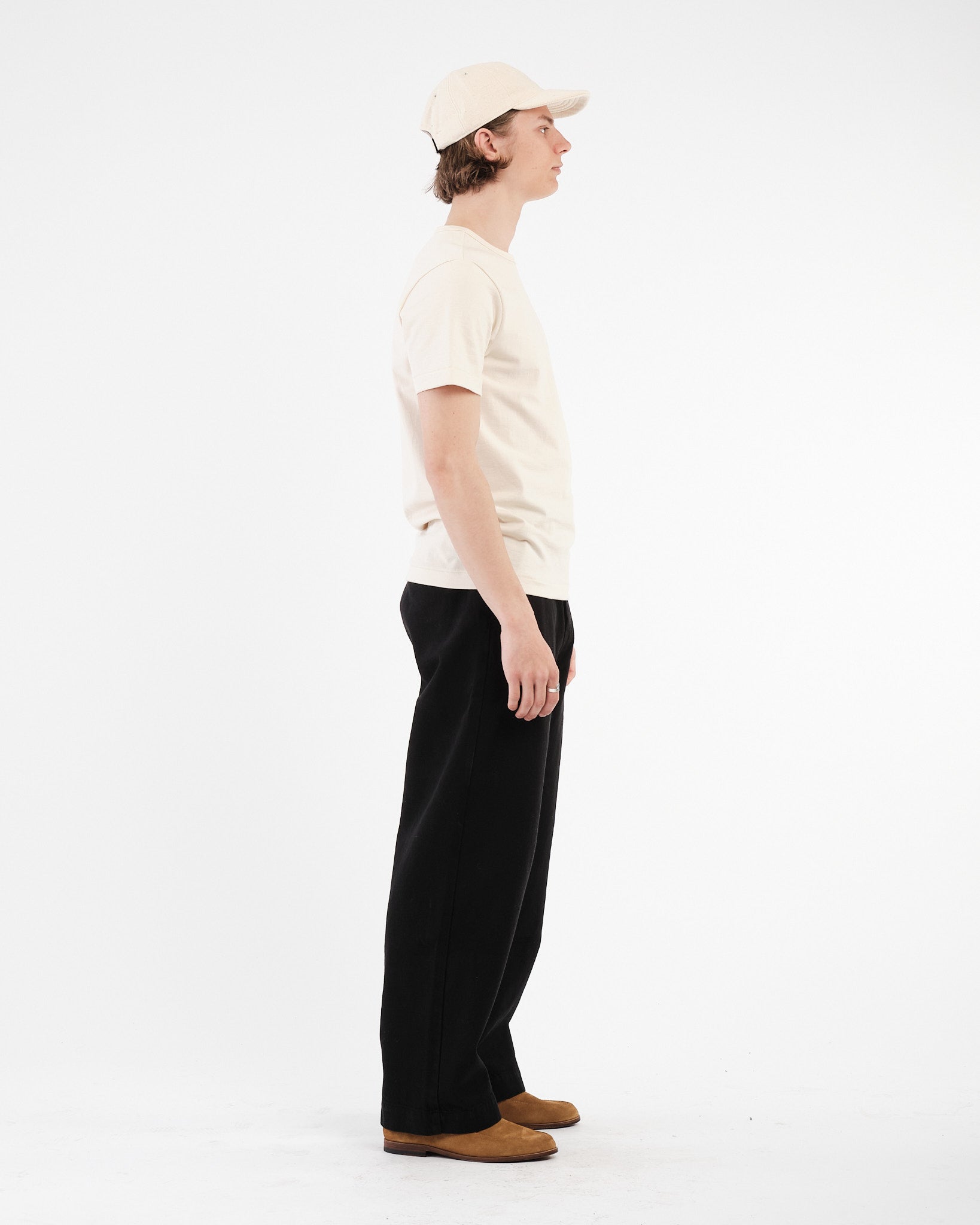 Dites bonjour au CHINO02 en Noir Profond — l'interprétation par Merz b. Schwanen du chino à taille haute et jambes larges. Confectionné à partir de 100% coton biologique dans une armure sergée brisée, ce pantalon combine structure et douceur pour une silhouette raffinée qui bouge avec vous.
