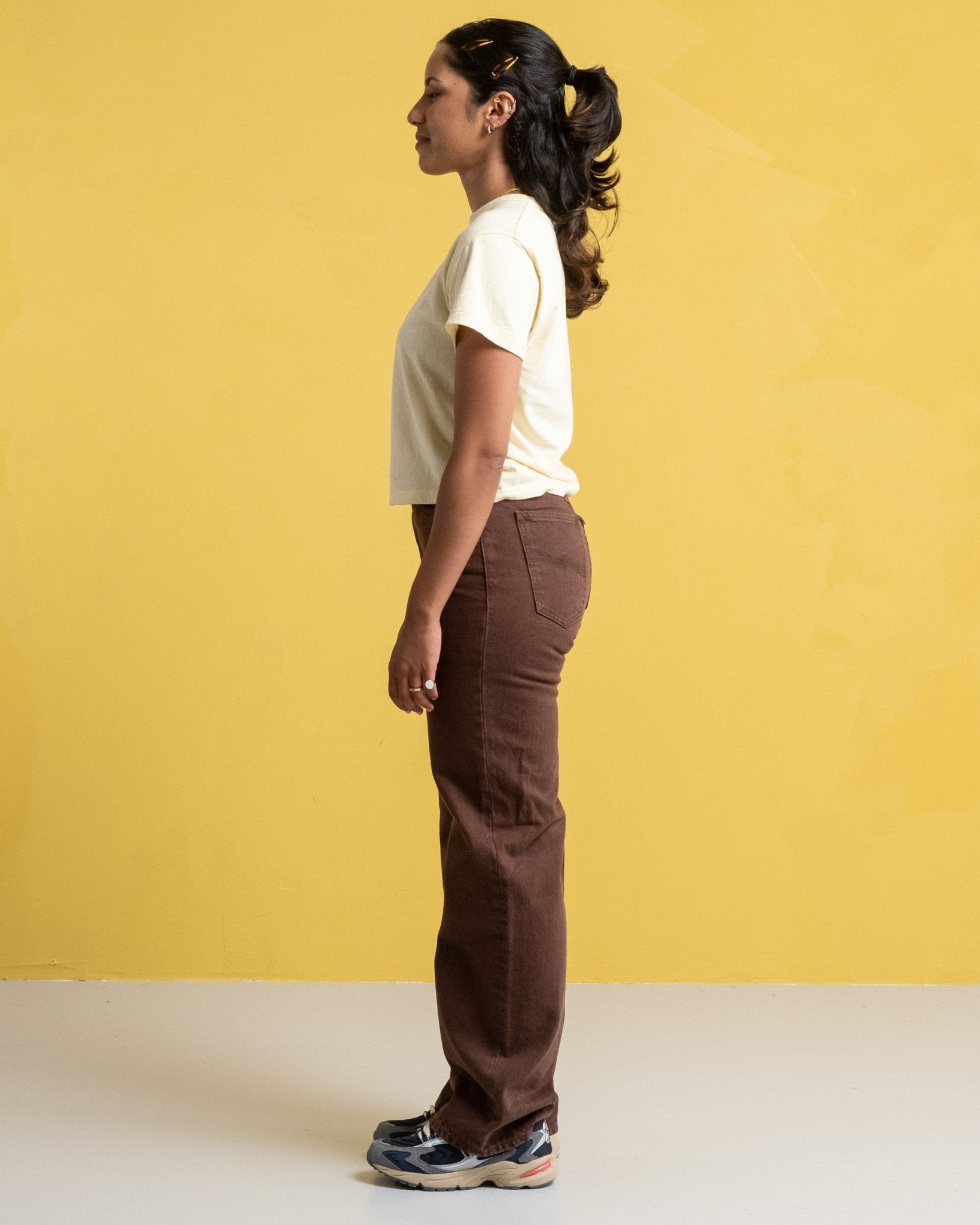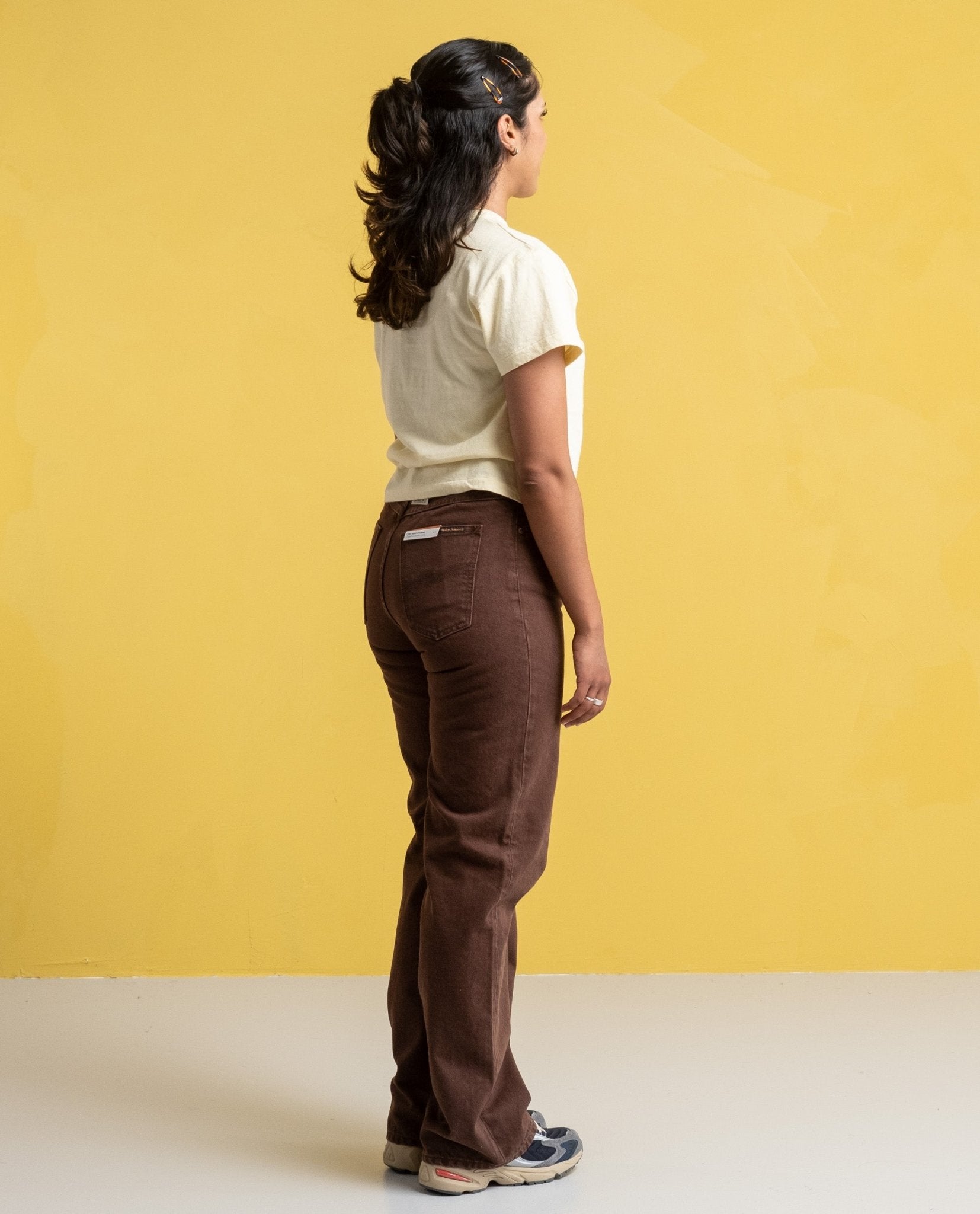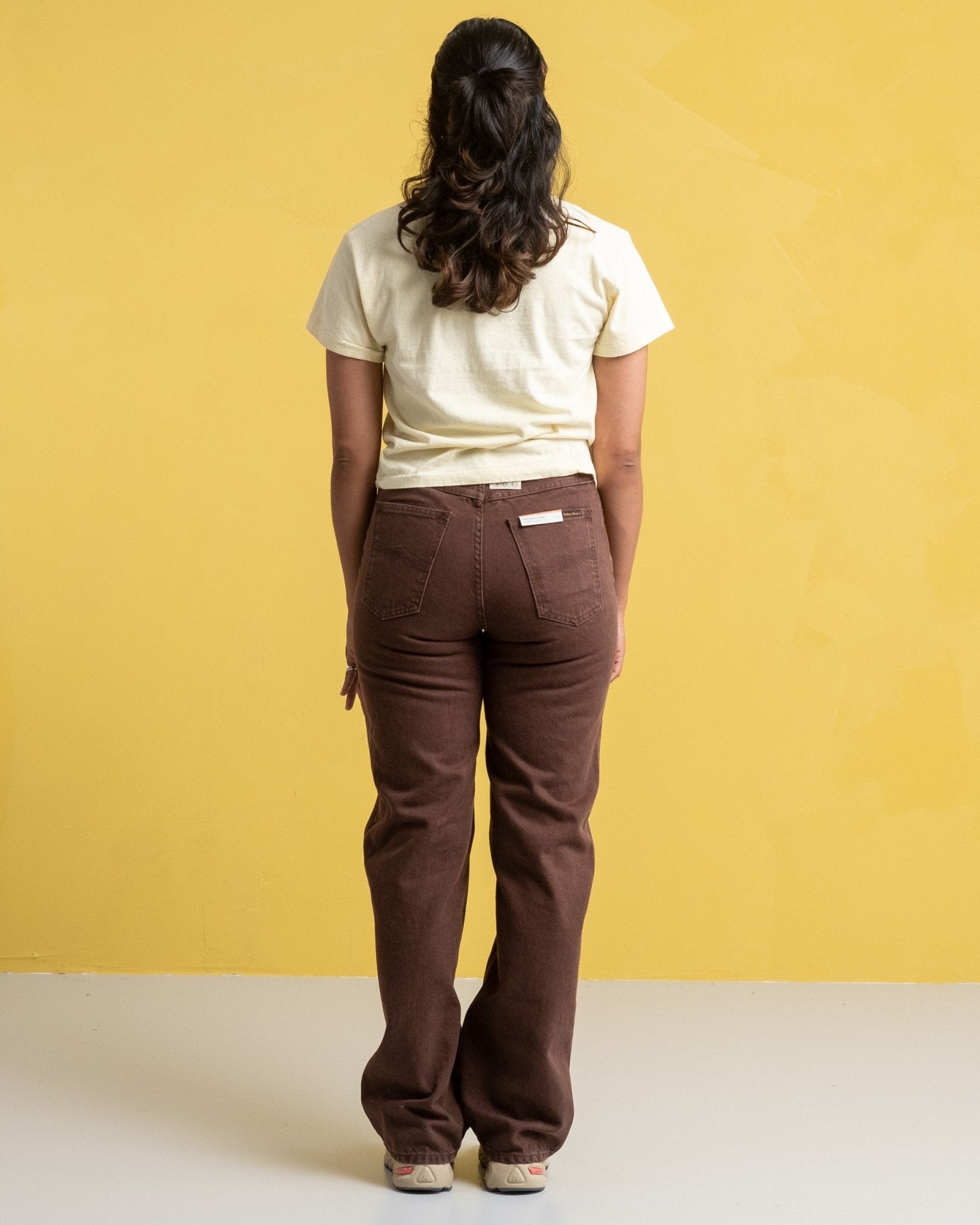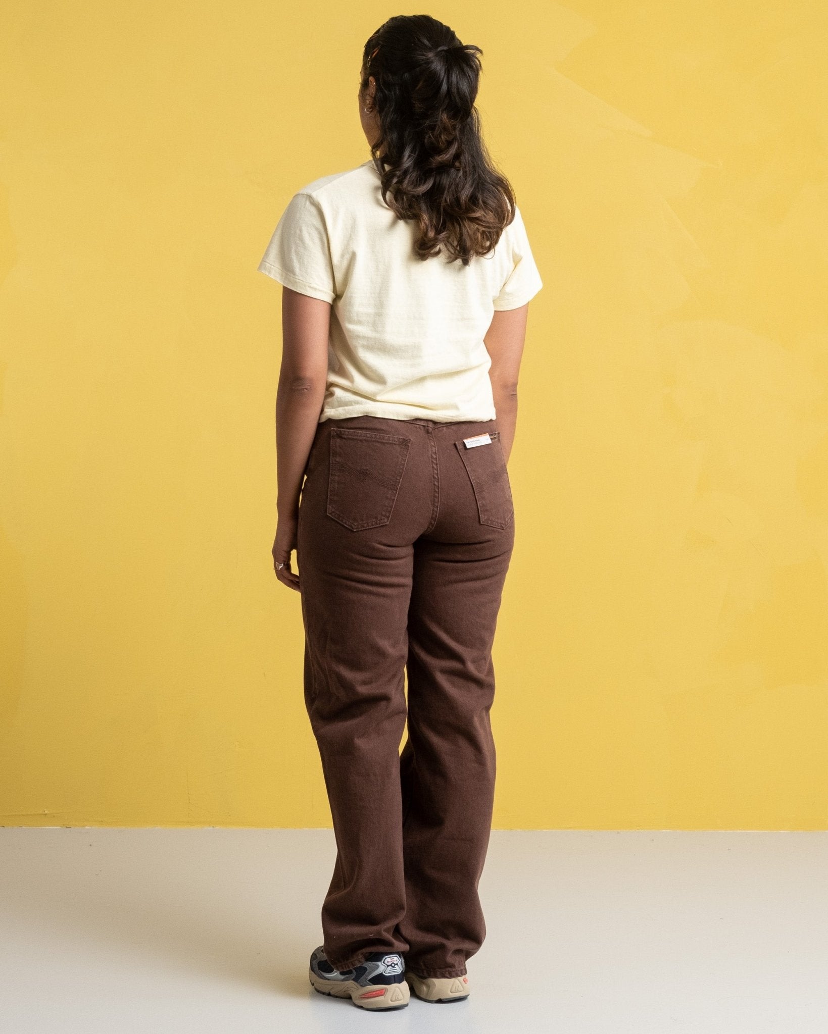 Clean Eileen Cinnamon de Nudie Jeans Co. Jeans pour femmes en forme avec une taille haute et des jambes larges. Ici, dans un joli ton terreux avec un look subtil usé. Fait à partir de 100% de coton biologique. Fabriqué en Tunisie.
