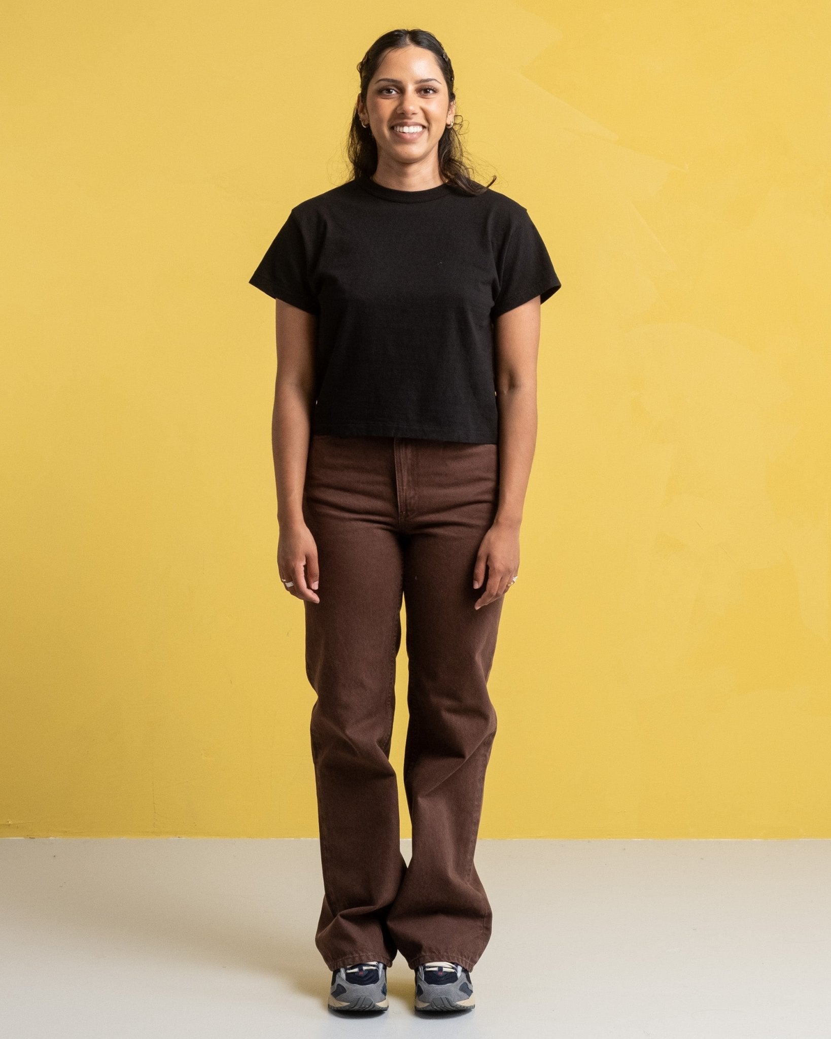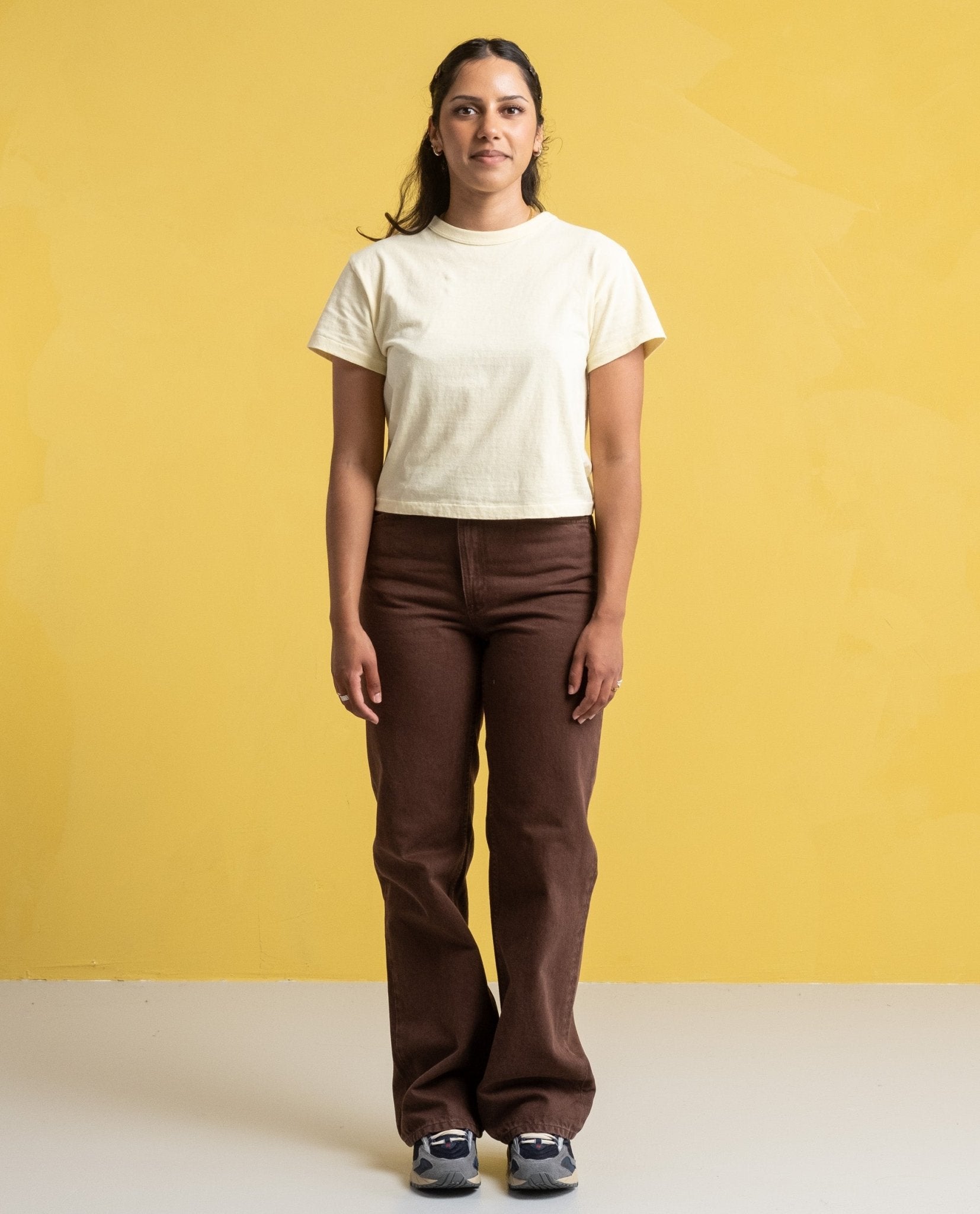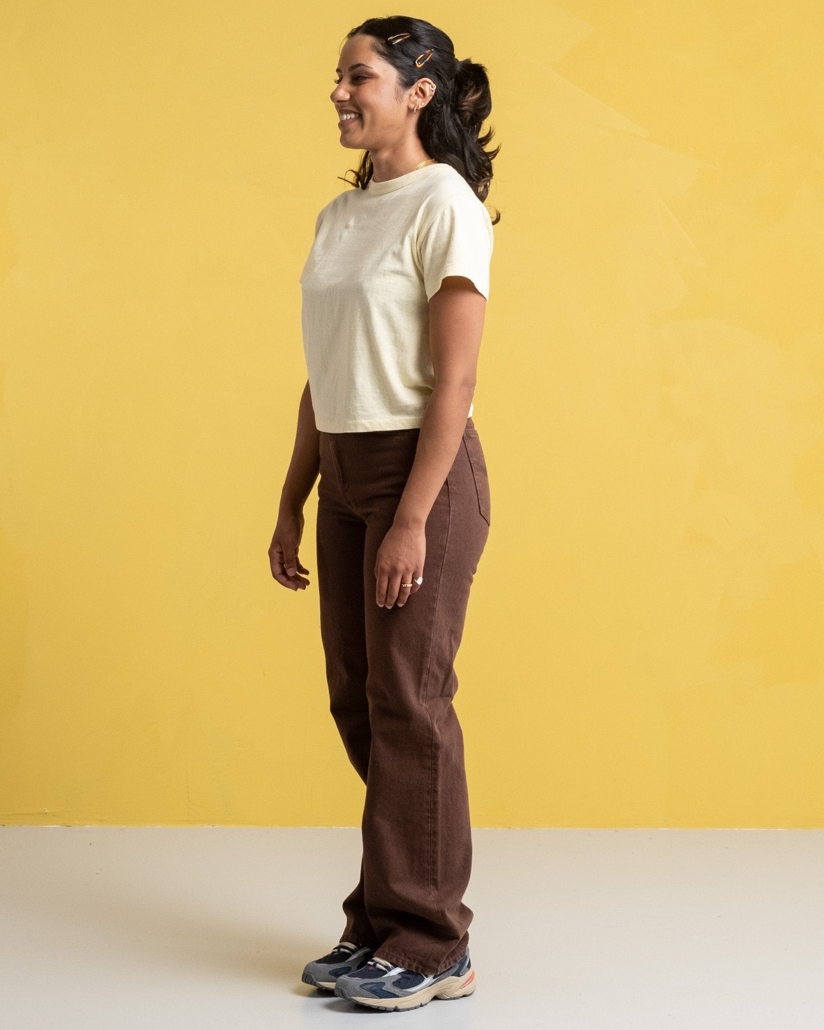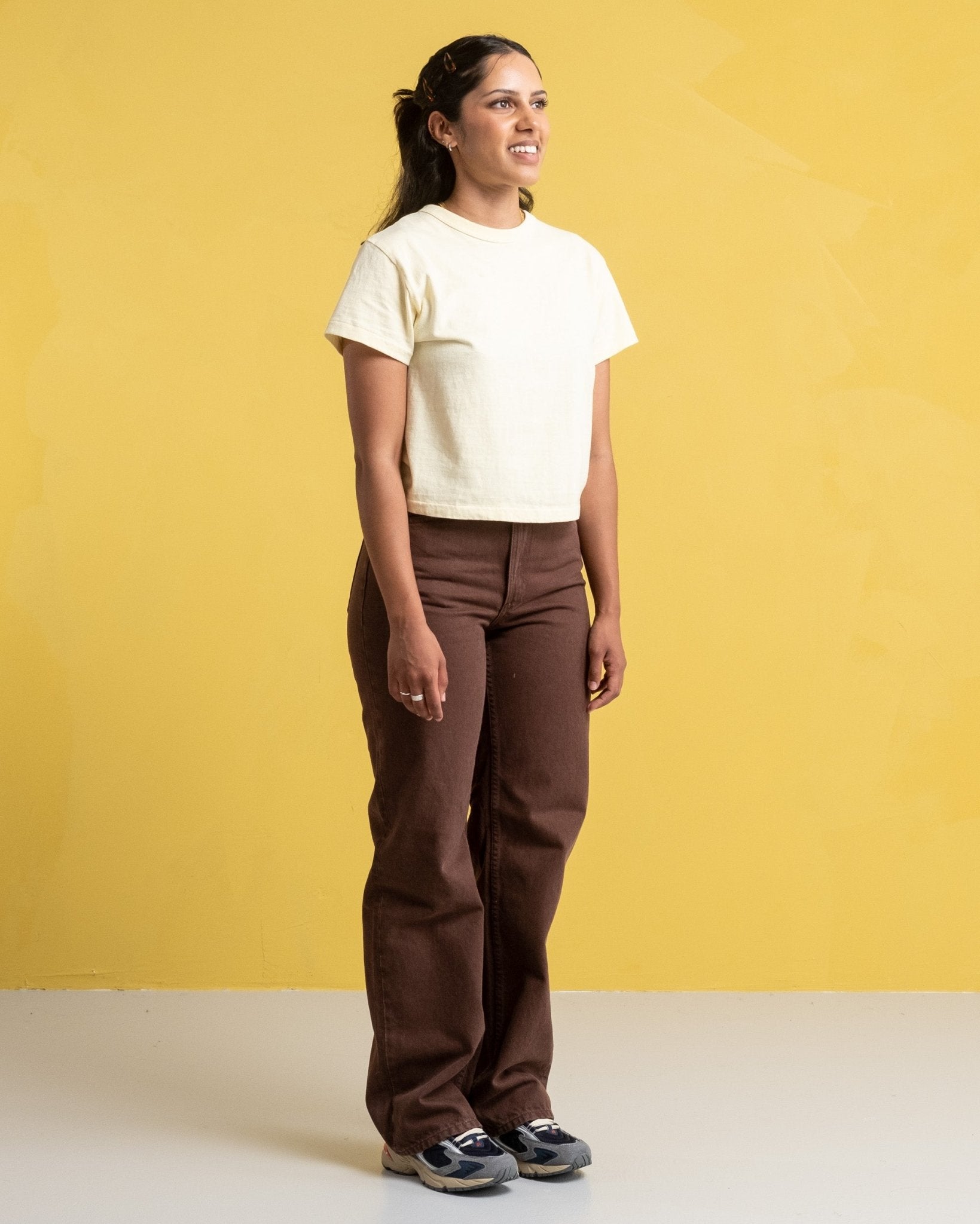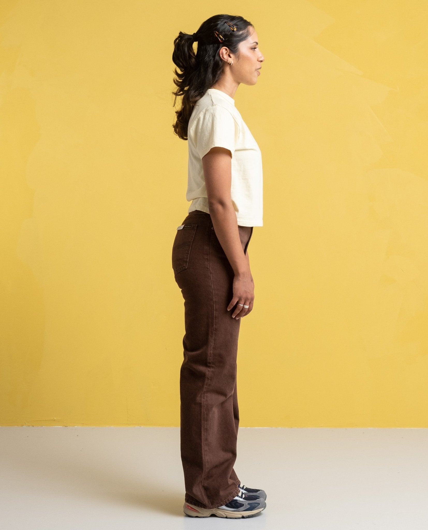 Clean Eileen Cinnamon de Nudie Jeans Co. Jeans pour femmes en forme avec une taille haute et des jambes larges. Ici, dans un joli ton terreux avec un look subtil usé. Fait à partir de 100% de coton biologique. Fabriqué en Tunisie.