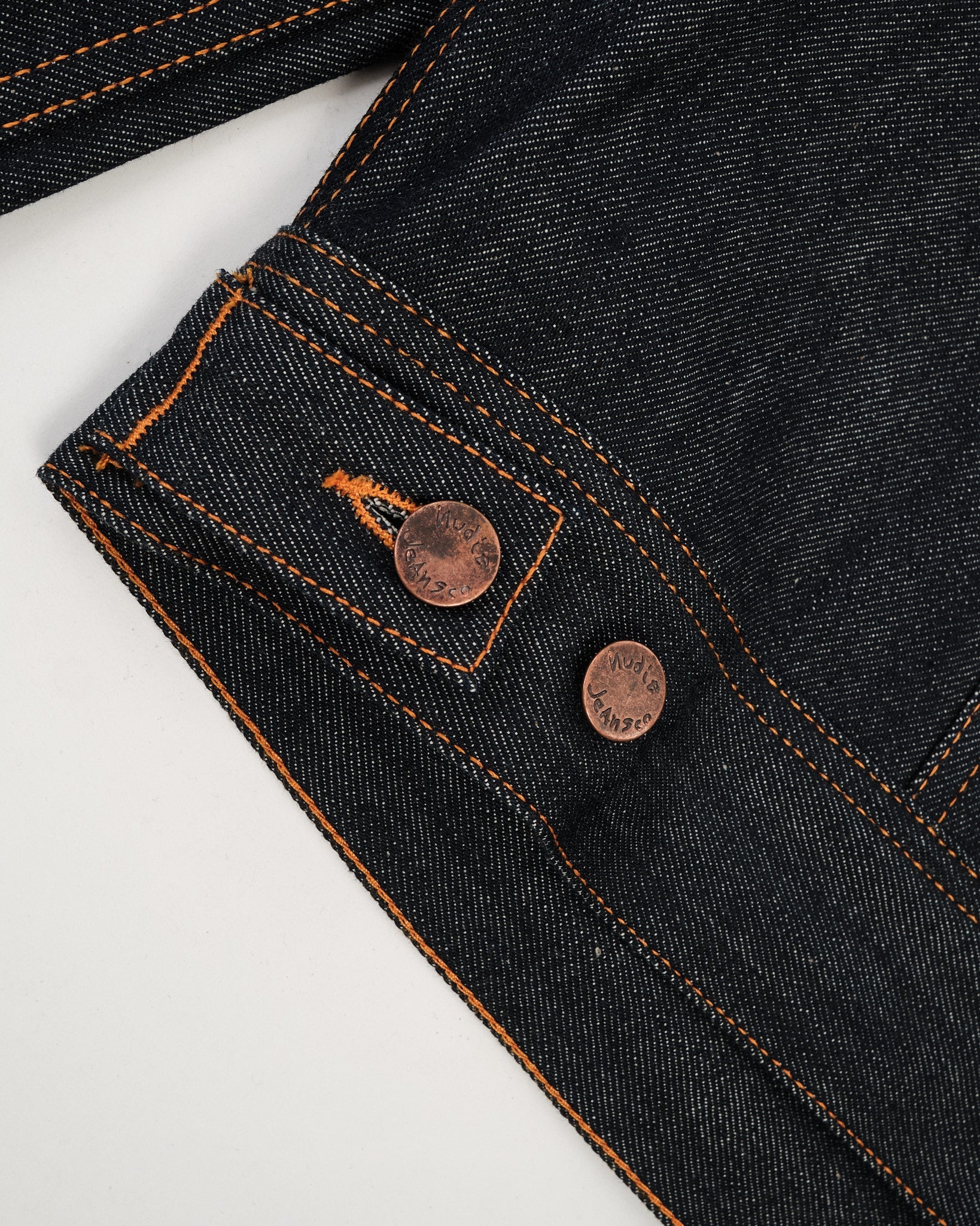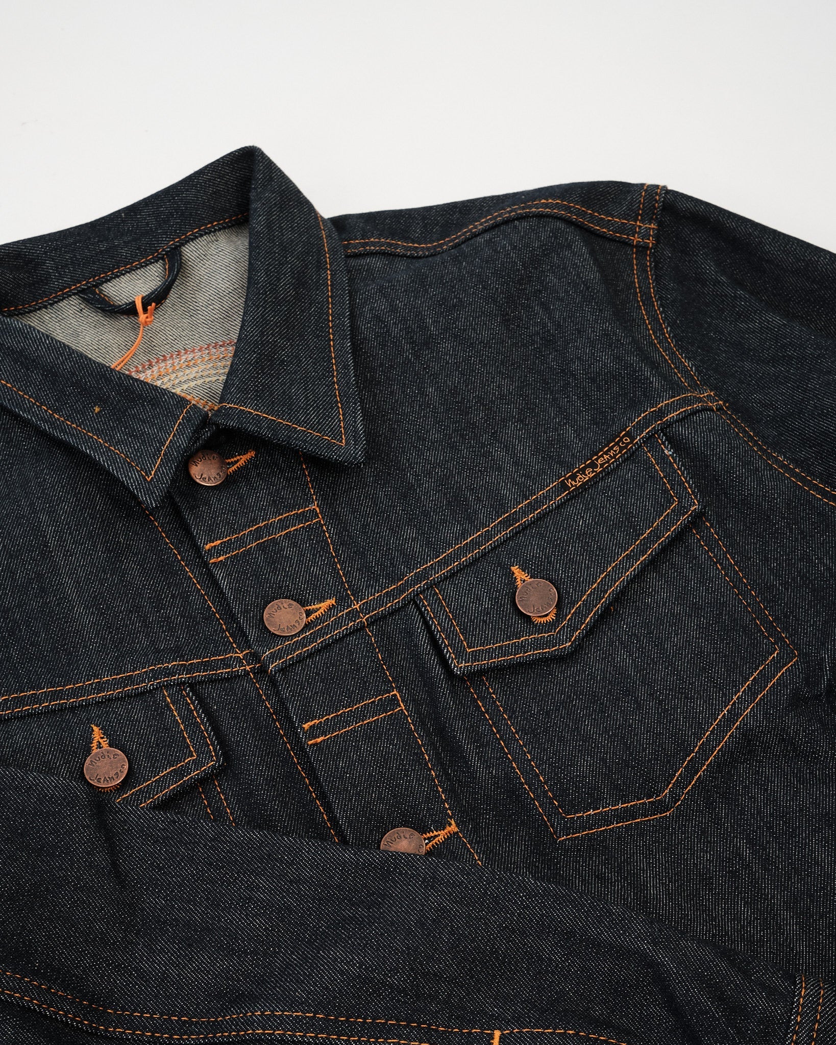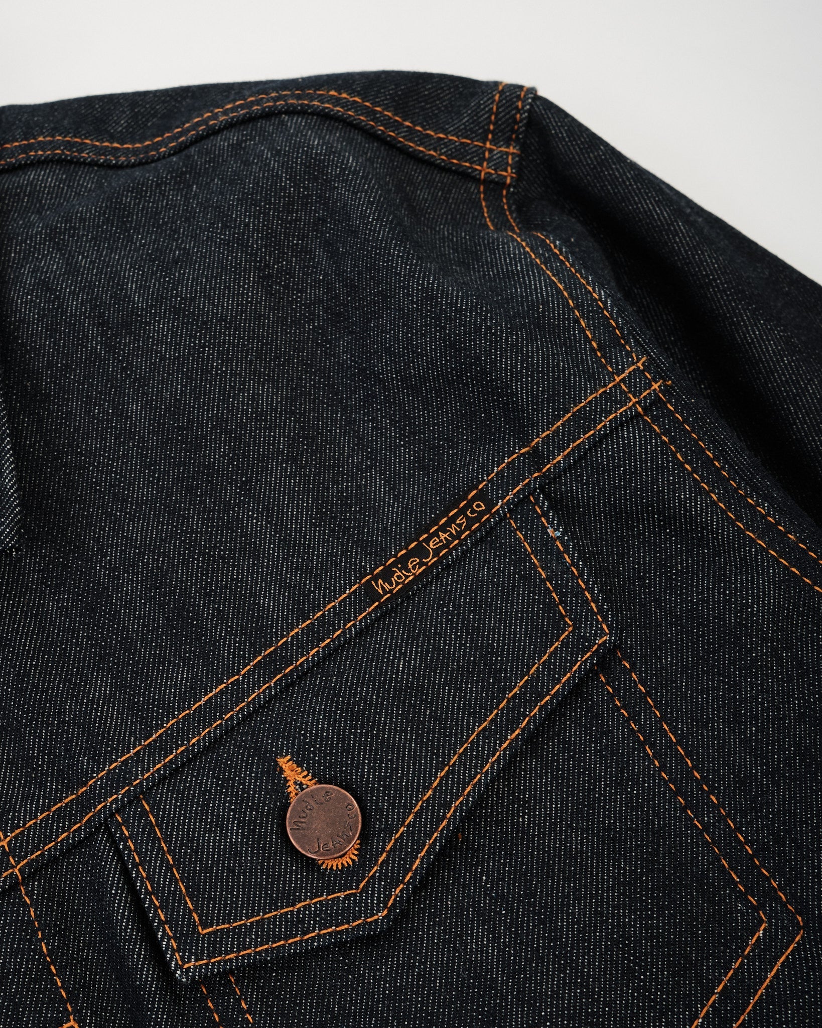 The Conny Denim Jacket in Sunburns Blue is Nudie’s sharpest take on a timeless classic. Cut from 14.2 oz rigid denim made with regenerative organic cotton, it pairs durability with a commitment to sustainability. The standout feature is a gradient “sunburns” embroidery across the back yoke — a bold touch that elevates this slim-fit jacket from wardrobe staple to conversation piece. Finished with copper buttons, orange thread, and a jacron patch, Conny is built to wear hard and fade beautifully.