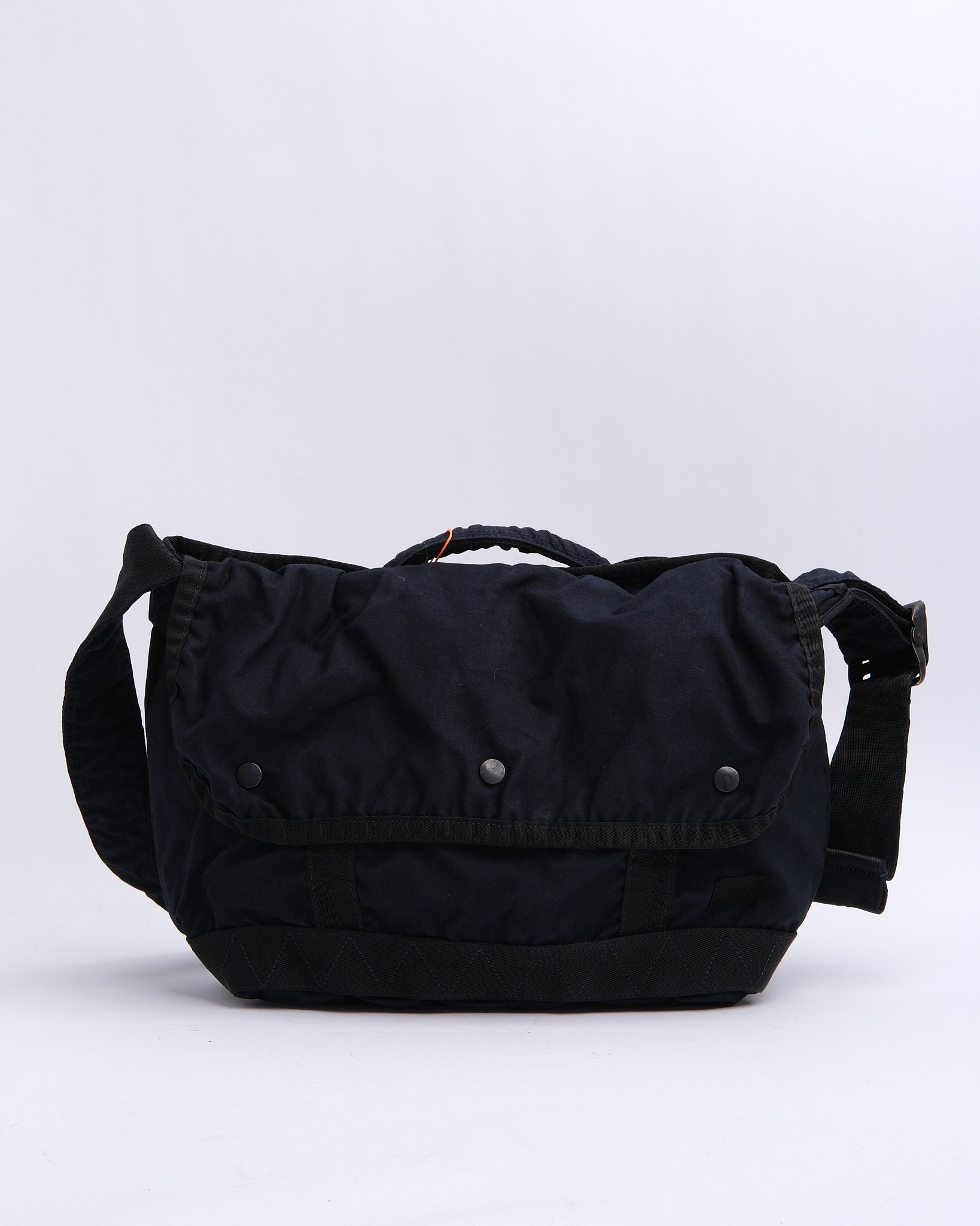 Le PORTER BY YOSHIDA Sac Messager Crag (M) en Marine fait partie de la série PORTER CRAG, connue pour son processus distinctif de teinture de produit qui crée des couleurs et des textures riches et profondes. Fabriqué à partir de tissu en satin de dos, un mélange dense de nylon et de coton, ce sac se vante à la fois de durabilité et d'une texture douce et ferme. La technique de teinture en deux bains produit des teintes riches et multidimensionnelles avec des variations naturelles, garantissant que chaque sac est unique.