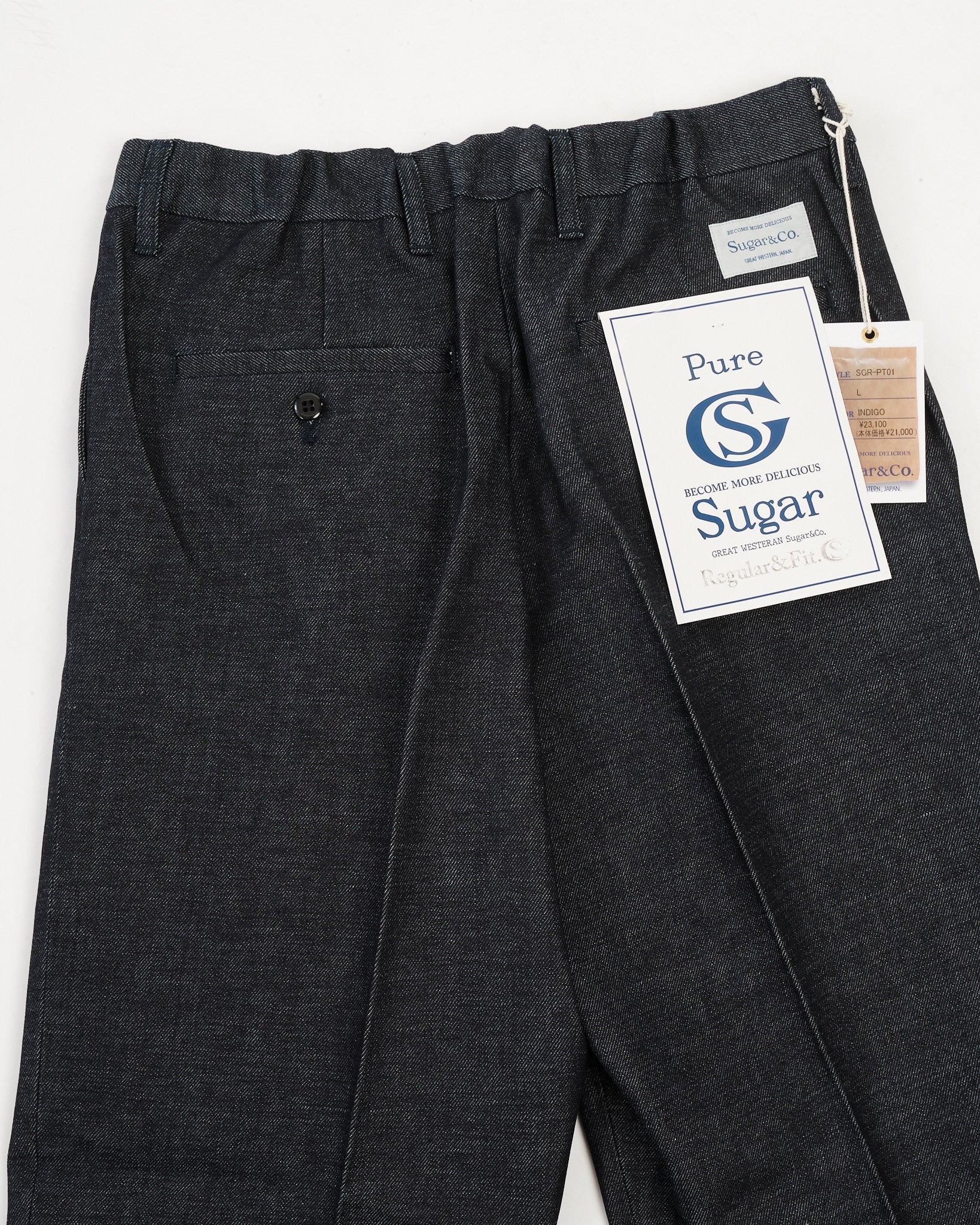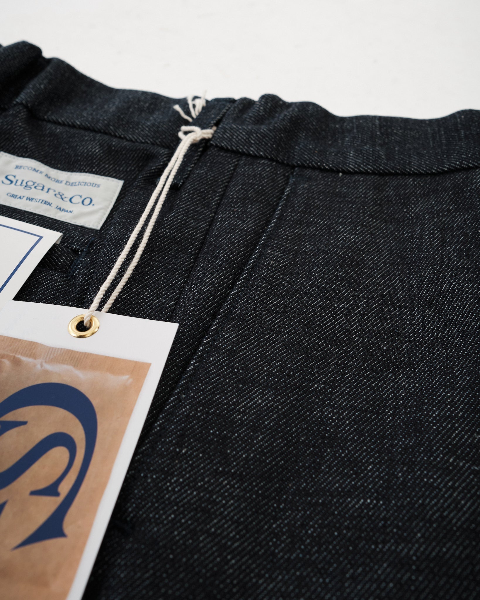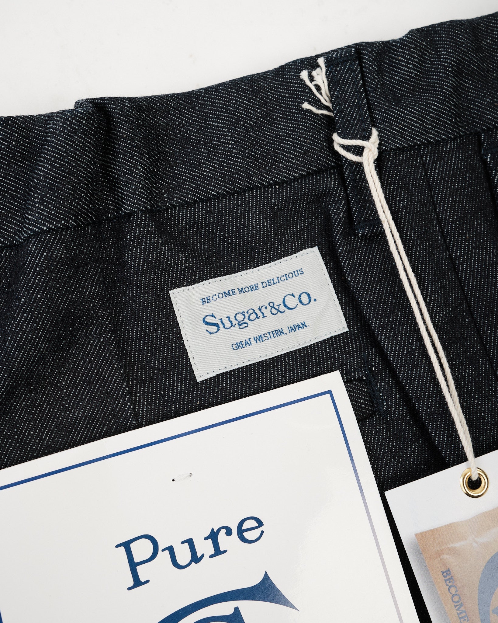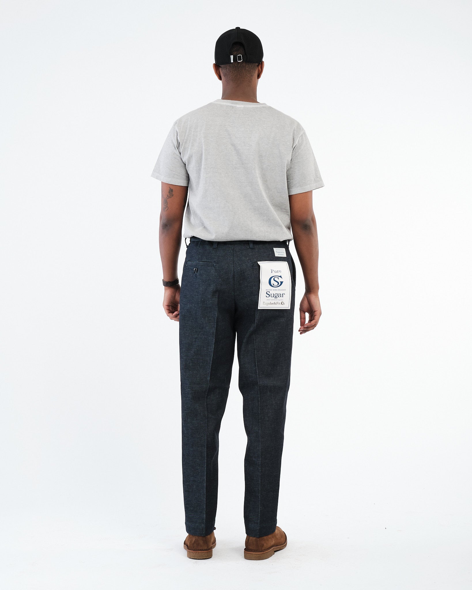 Présentation du Sugar & co. Pantalon de papa dans un riche Indigo teinte. Ces pantalons sont un modèle phare de Sugar & Co., présentant le dévouement de la marque à la qualité et à la conception intemporelle. Fabriqué au Japon à partir de coton 100% américain, le tissu offre une texture robuste mais sèche qui devient plus confortable avec l'usure. La couleur indigo profonde, obtenue à l'aide de fils avec une variation significative, assure des caractéristiques de décoloration et de vieillissement uniques, permettant au pantalon de développer une patine personnalisée au fil du temps.