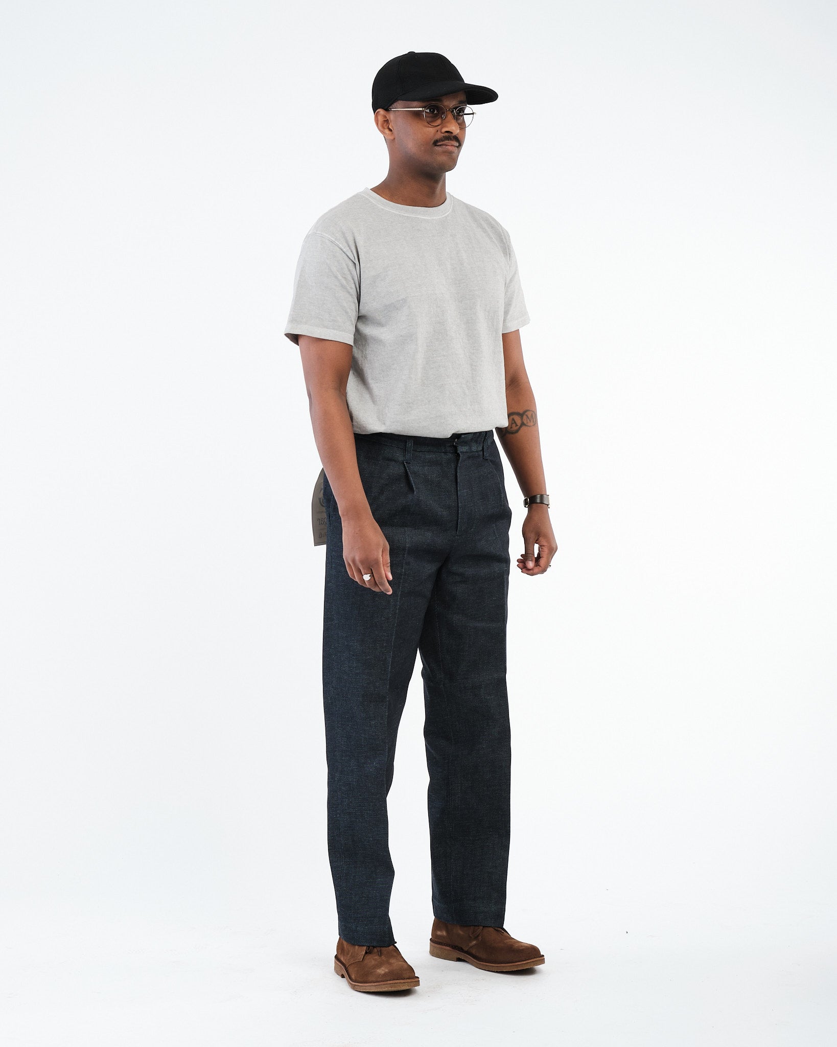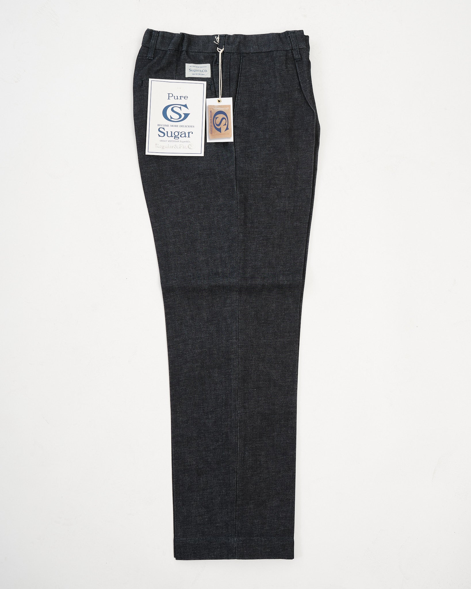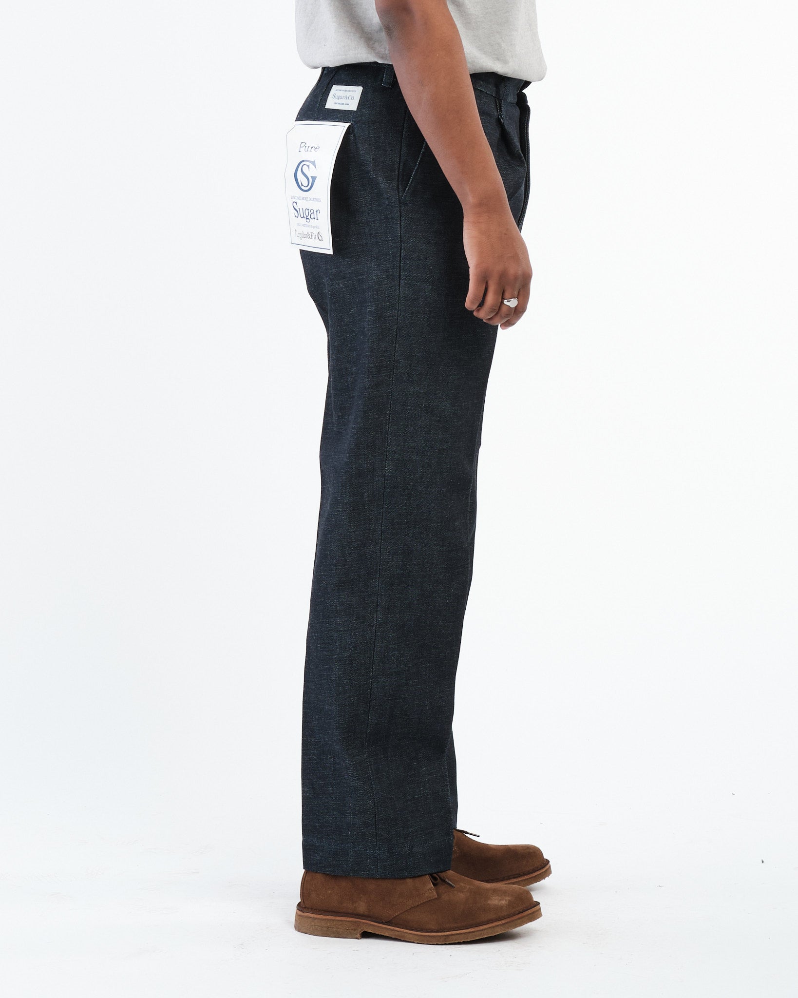 Présentation du Sugar & co. Pantalon de papa dans un riche Indigo teinte. Ces pantalons sont un modèle phare de Sugar & Co., présentant le dévouement de la marque à la qualité et à la conception intemporelle. Fabriqué au Japon à partir de coton 100% américain, le tissu offre une texture robuste mais sèche qui devient plus confortable avec l'usure. La couleur indigo profonde, obtenue à l'aide de fils avec une variation significative, assure des caractéristiques de décoloration et de vieillissement uniques, permettant au pantalon de développer une patine personnalisée au fil du temps.