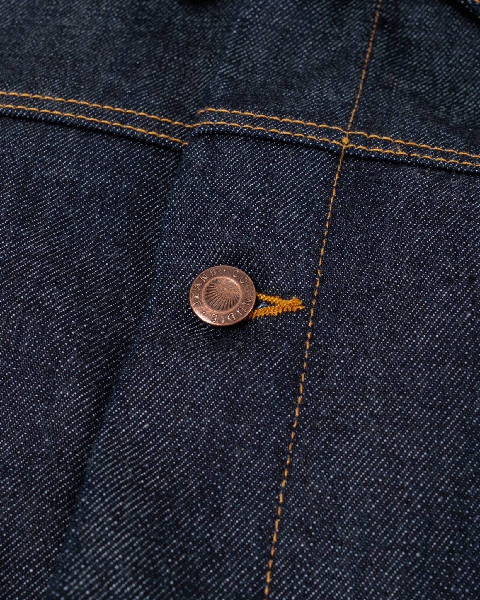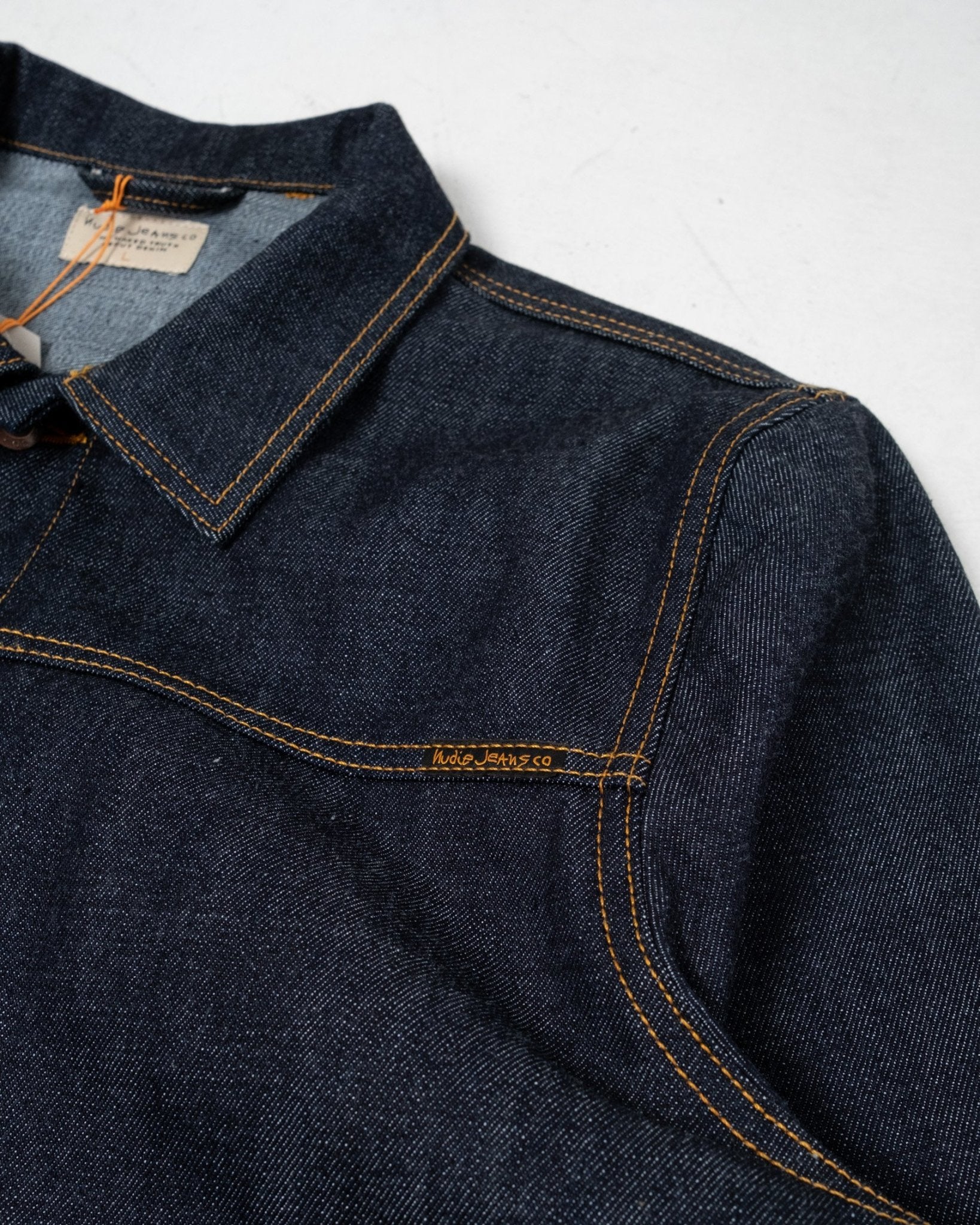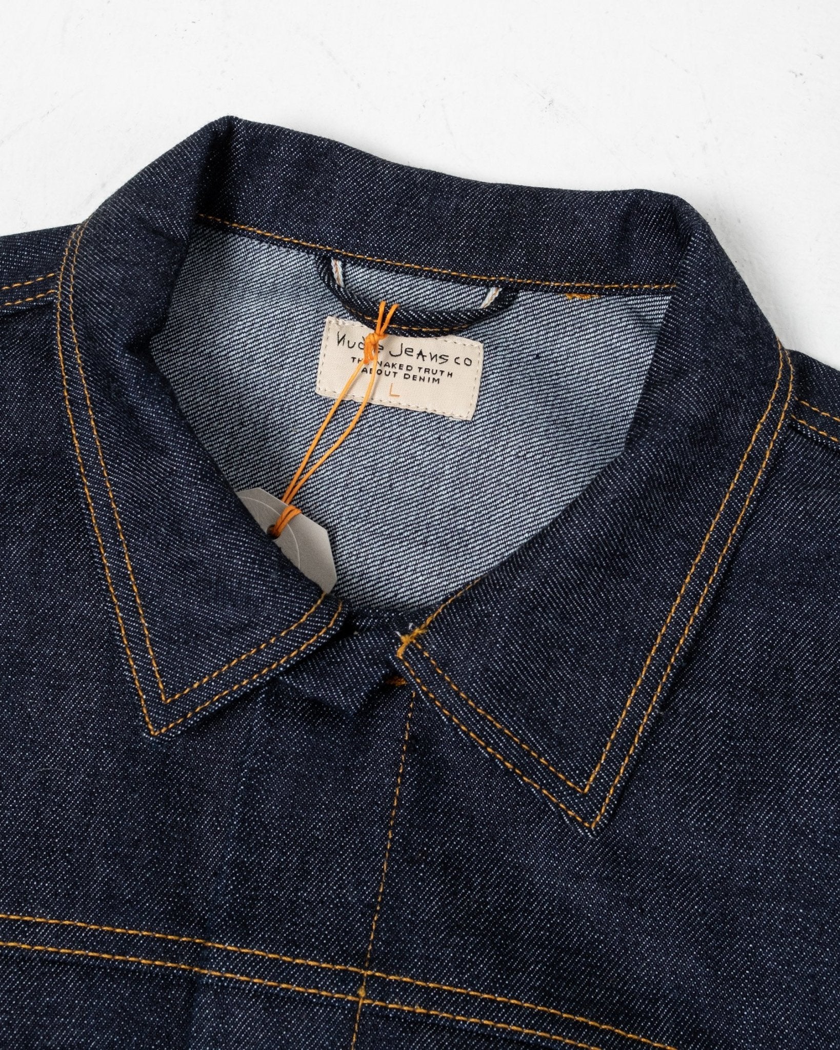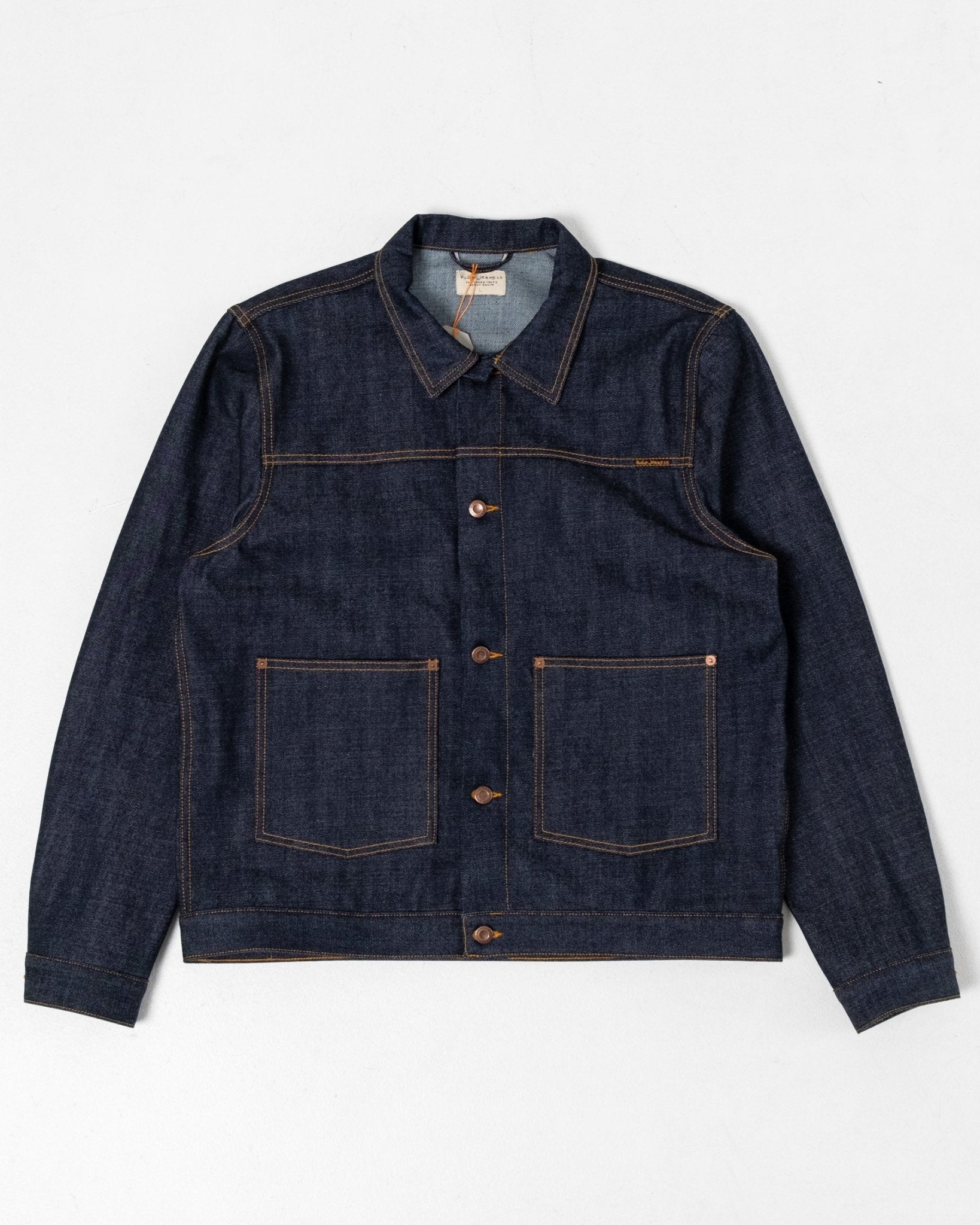 Dante Blue de Nudie Jeans Co est une veste de vêtements de travail classique en un denim de selvage rouge brut avec deux poches avant inférieures et de beaux boutons personnalisés Nudie. Ajustement régulier et coton biologique. Fabriqué en Italie.