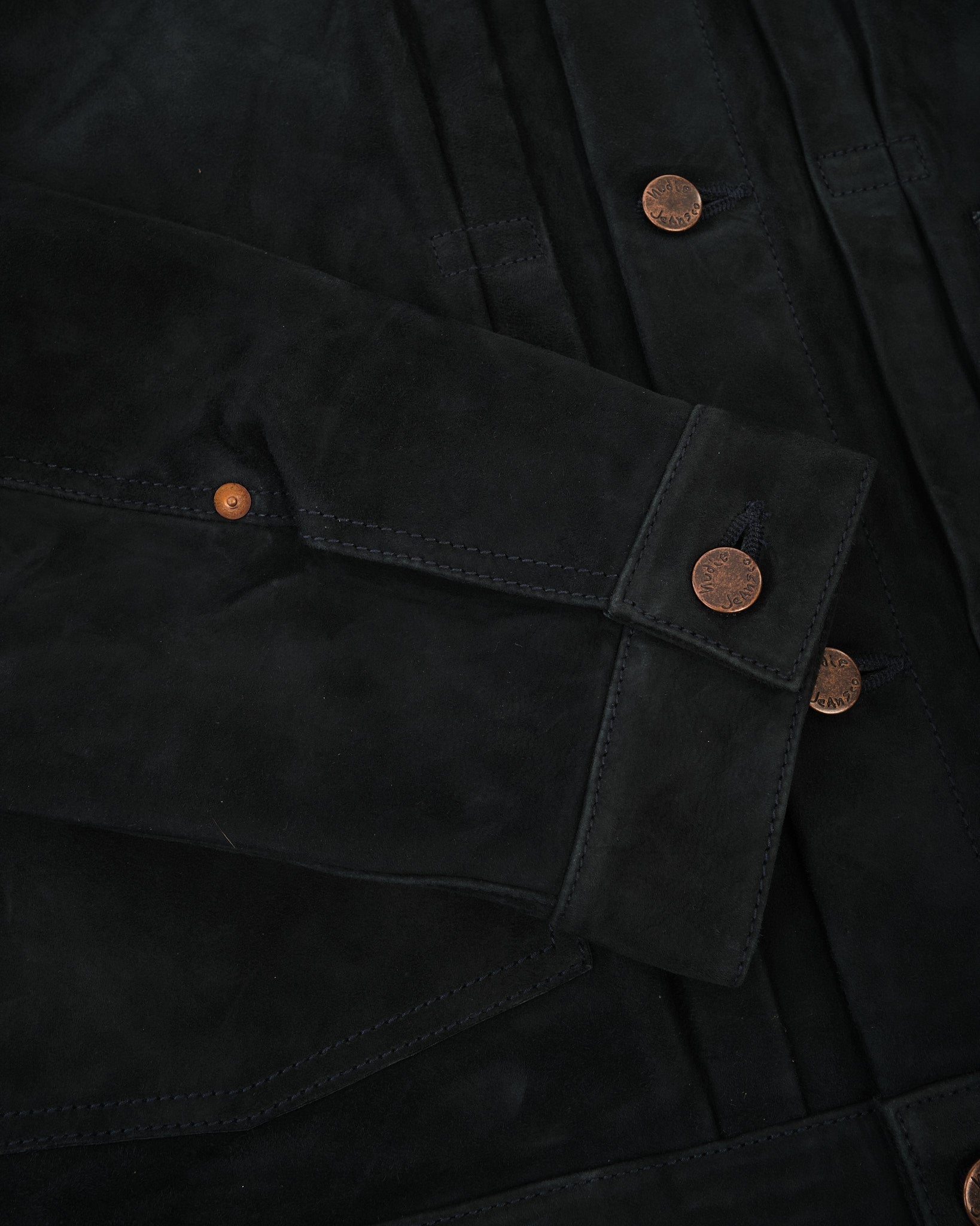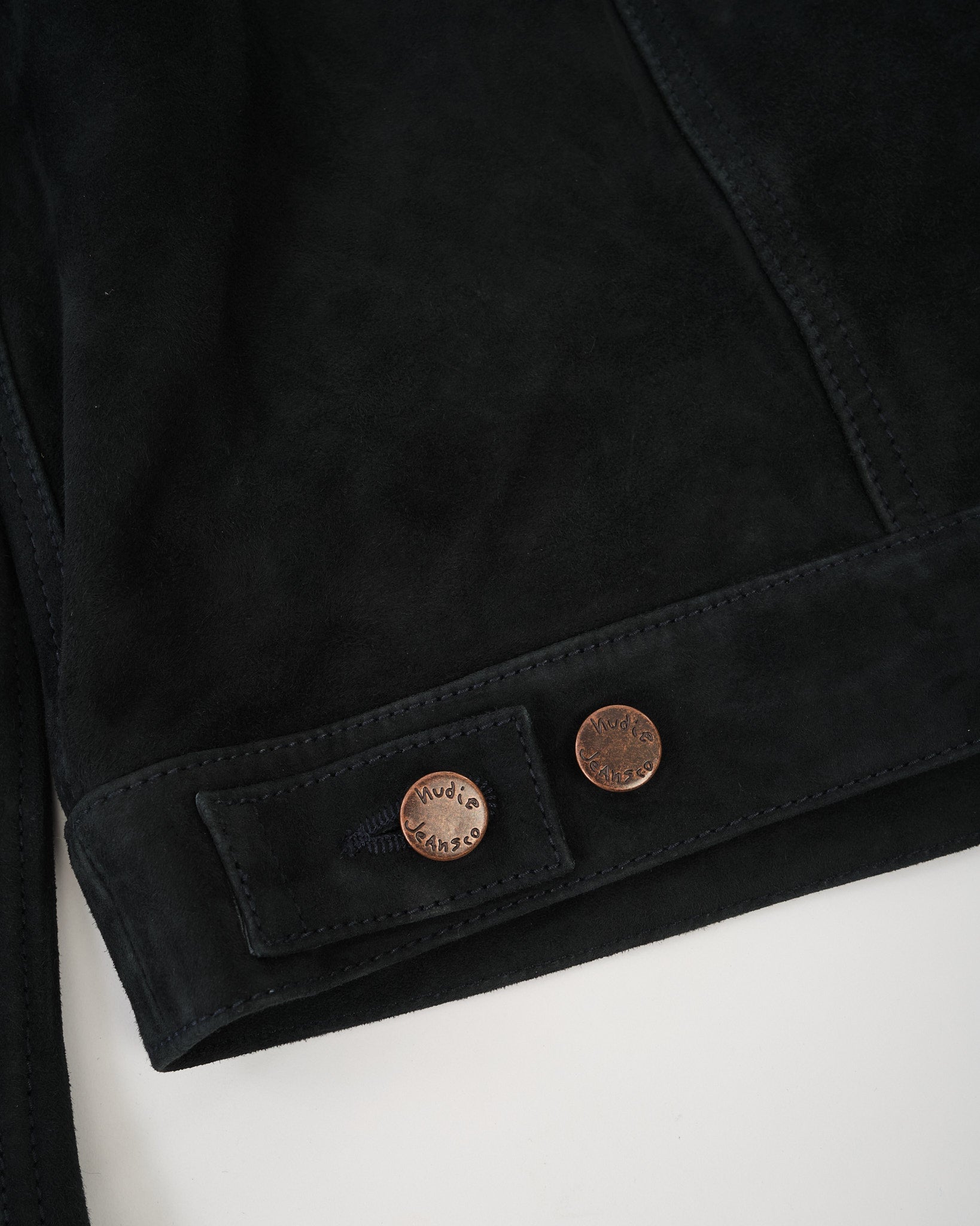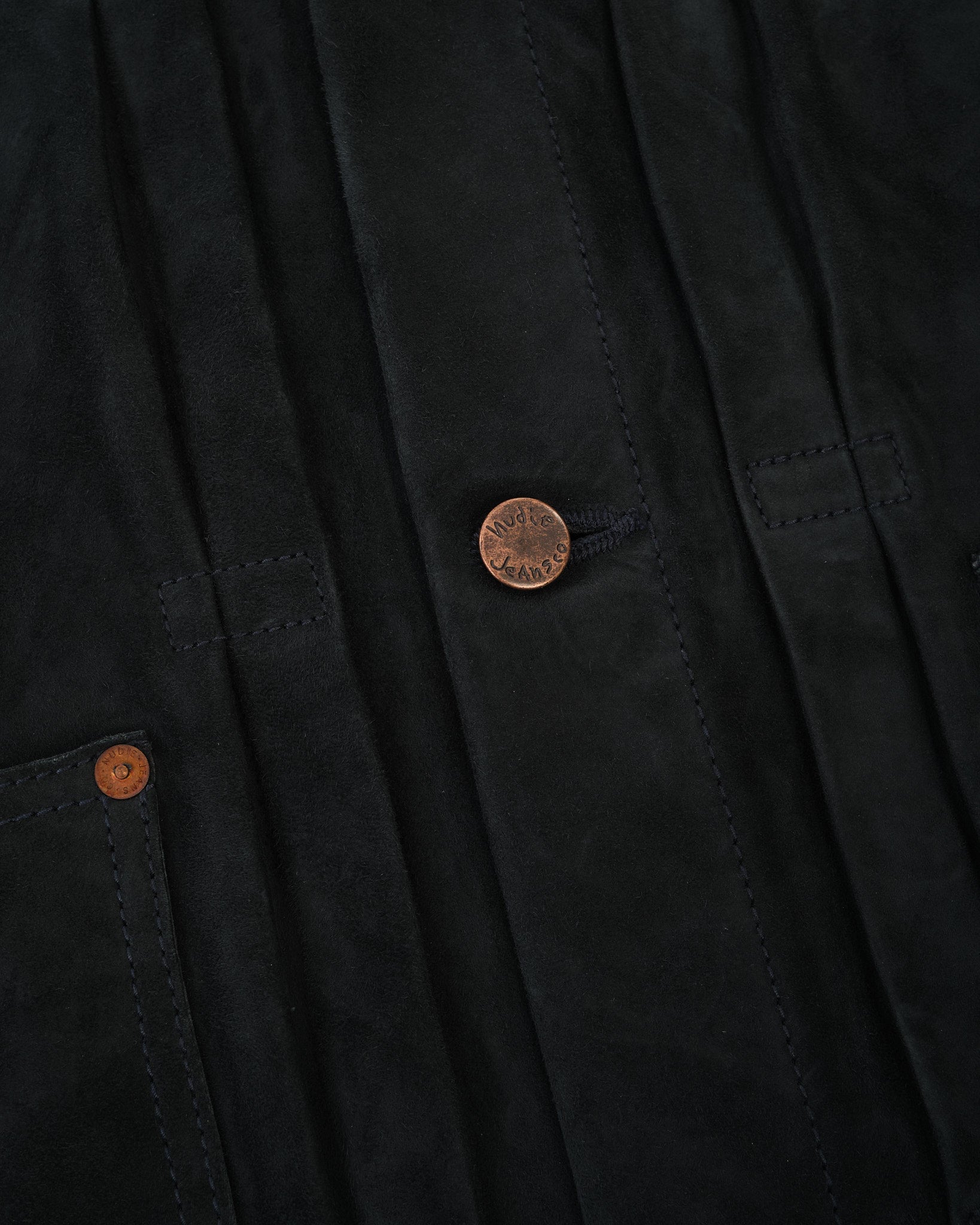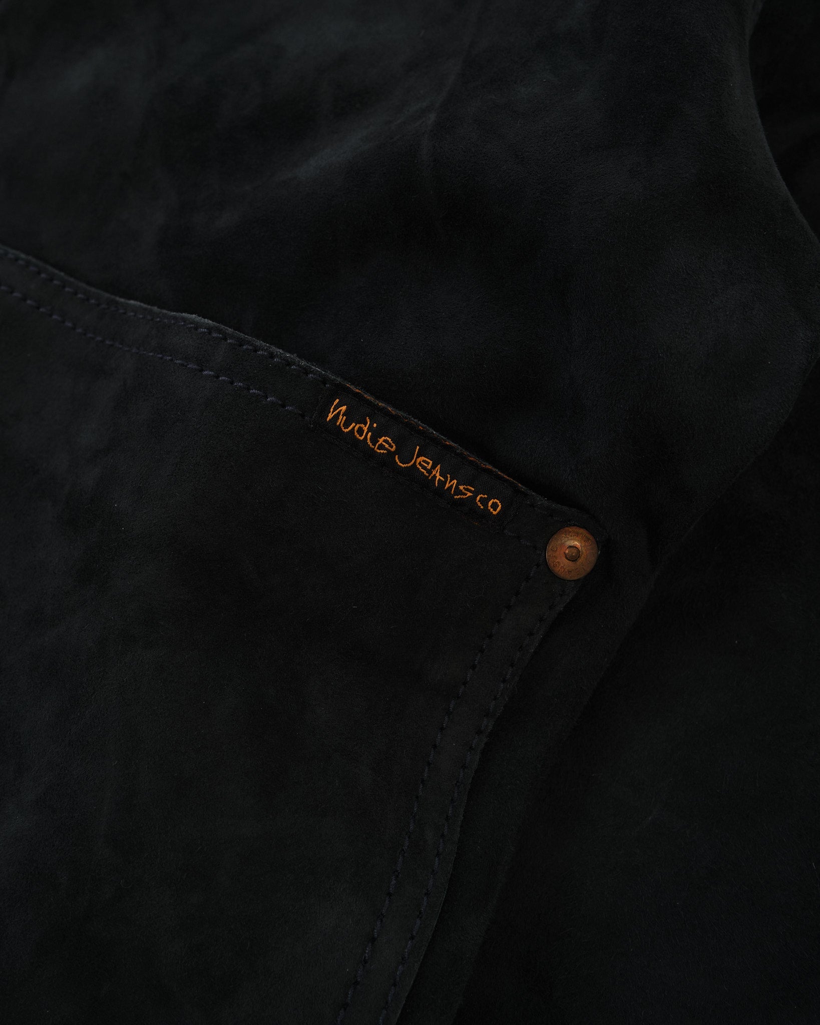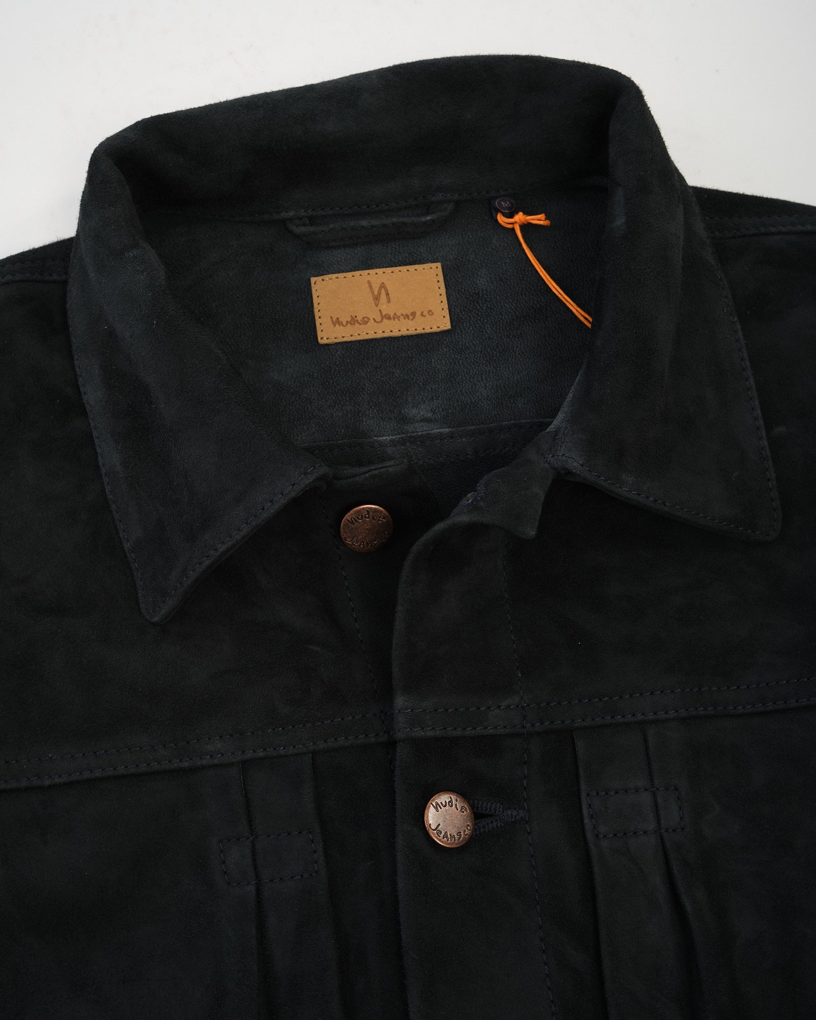 Le Nudie Jeans CO. Dante II Veste en daim Navy est un Affinage raffiné sur la silhouette de la veste en jean classique, fabriqué à partir de Suede de chèvre impeccablement douce et souple. Le Shade bleu foncé et pâle Améliore la riche texture du daim, lui donnant un look sophistiqué sans effort.