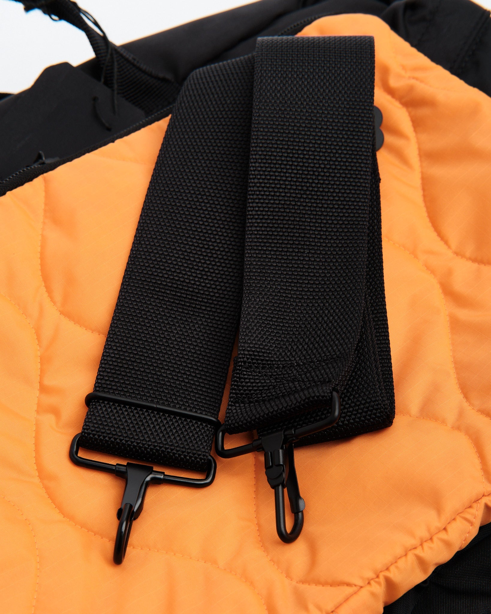 Confectionné à partir d'un tissu de qualité industrielle tissé avec un fil solide en nylon 210 deniers 6, initialement utilisé pour les bateaux pneumatiques, le sac est exceptionnellement durable. L'intérieur est doté d'une doublure orange d'urgence, inspirée des doublures de vestes militaires, et comporte du nylon ripstop matelassé pour une résilience accrue.