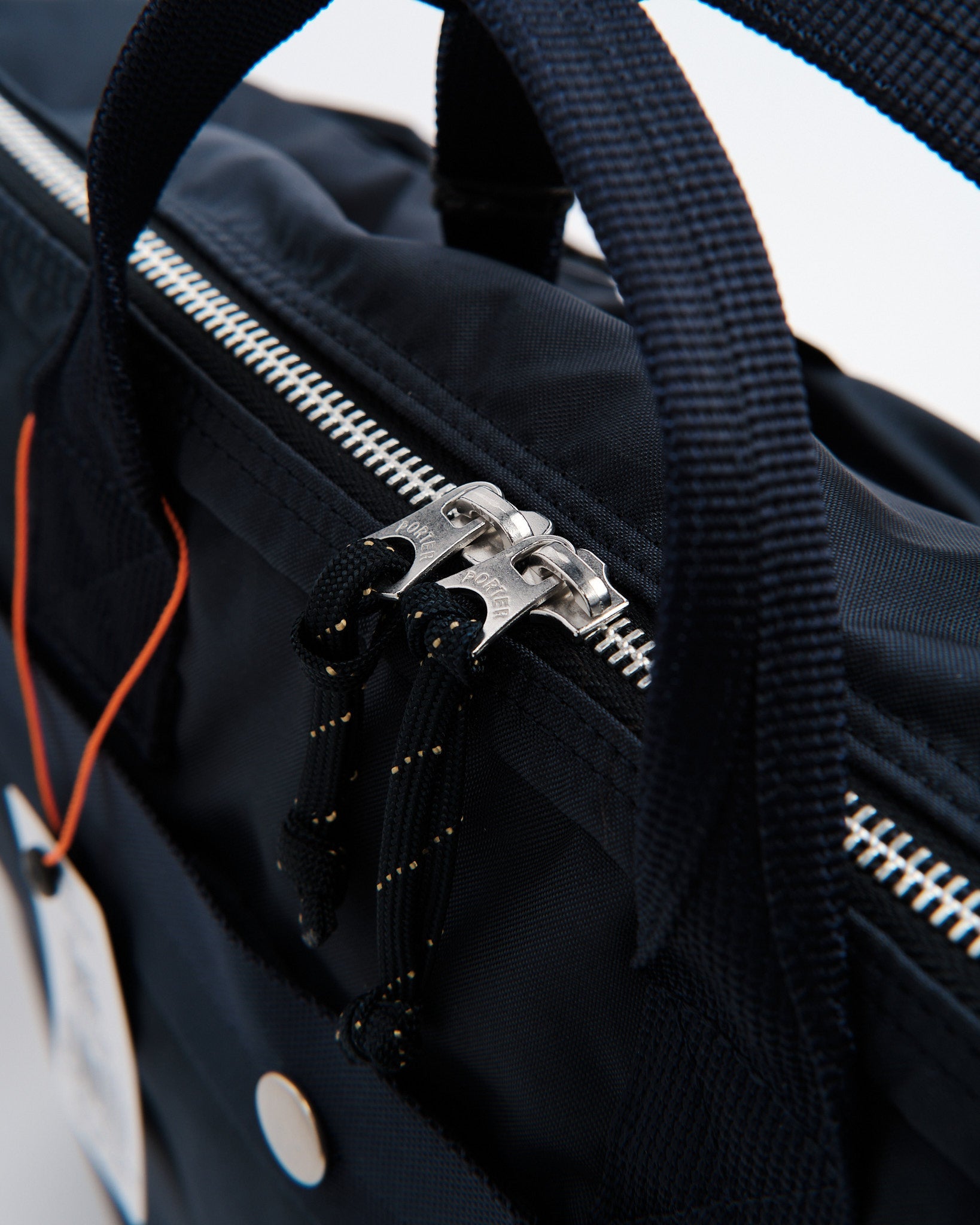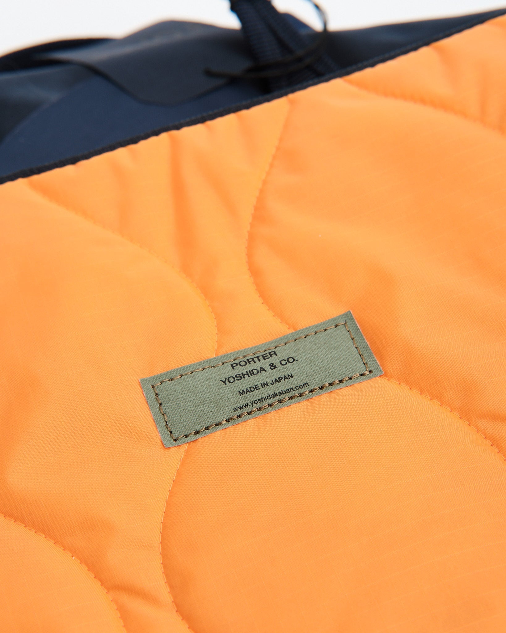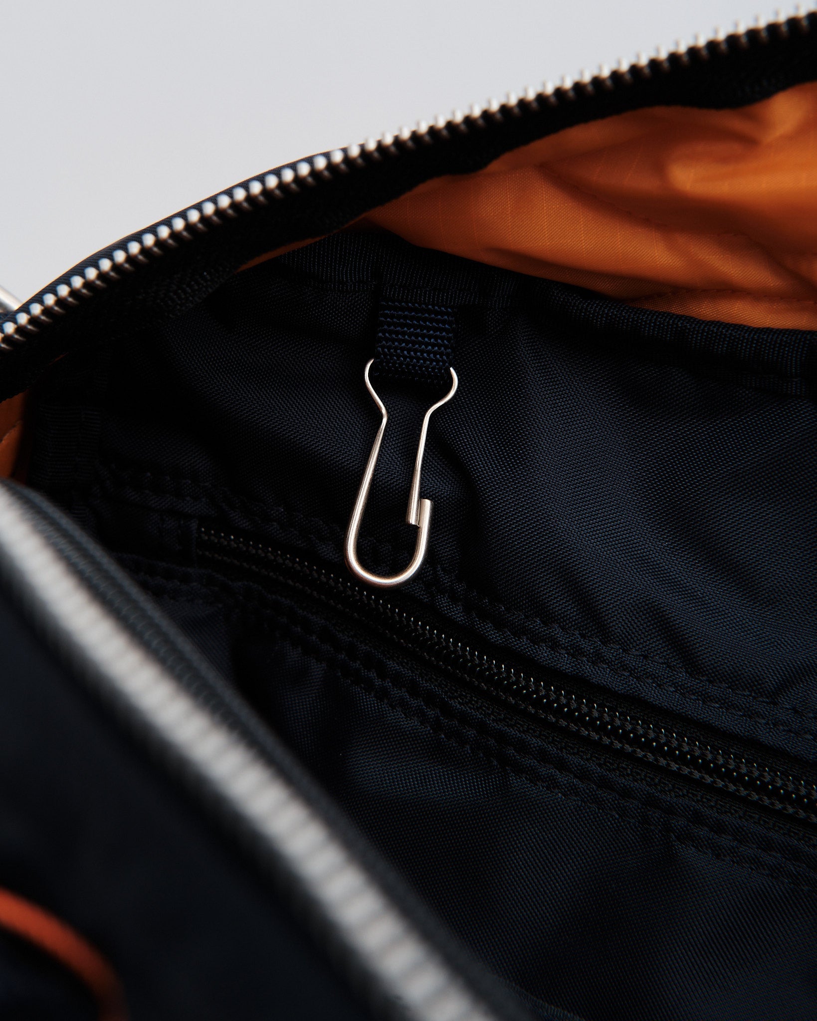Confectionné à partir d'un tissu de qualité industrielle tissé avec un fil solide en nylon de 210 deniers 6, à l'origine utilisé pour les bateaux pneumatiques, le sac est exceptionnellement durable. L'intérieur est doté d'une doublure orange d'urgence, inspirée des doublures de vestes militaires, et comporte du nylon ripstop matelassé pour une résilience accrue.