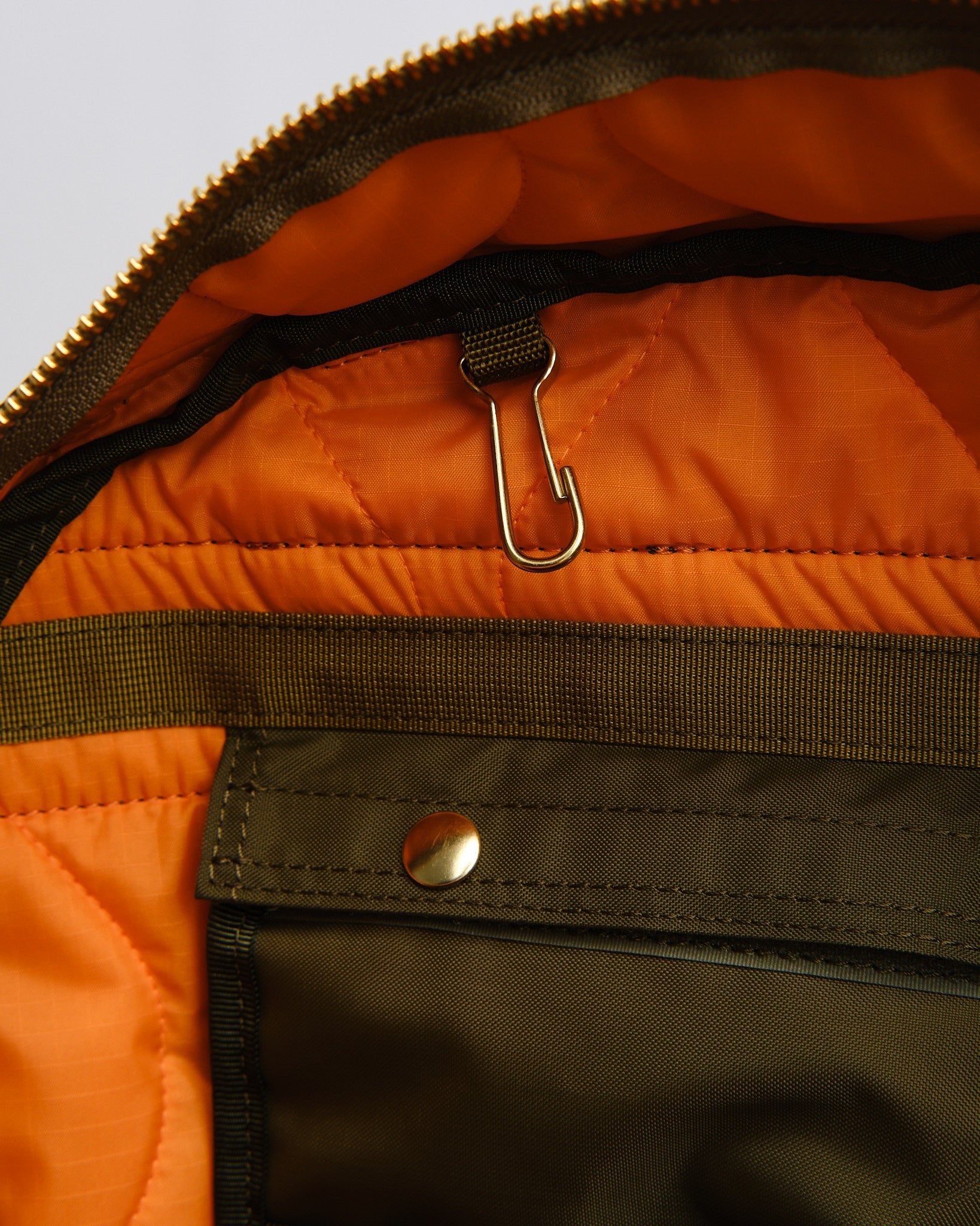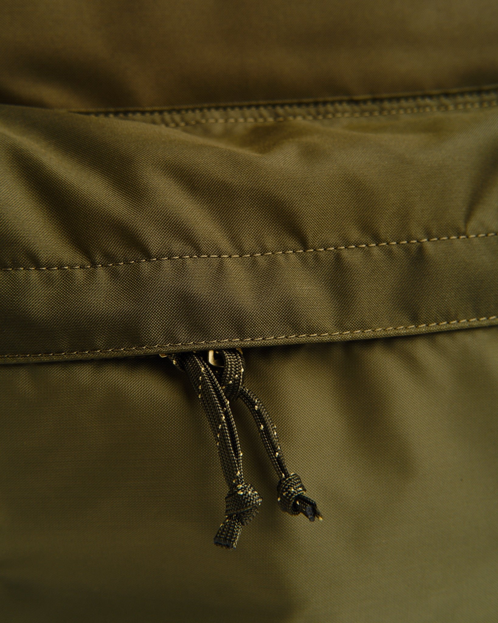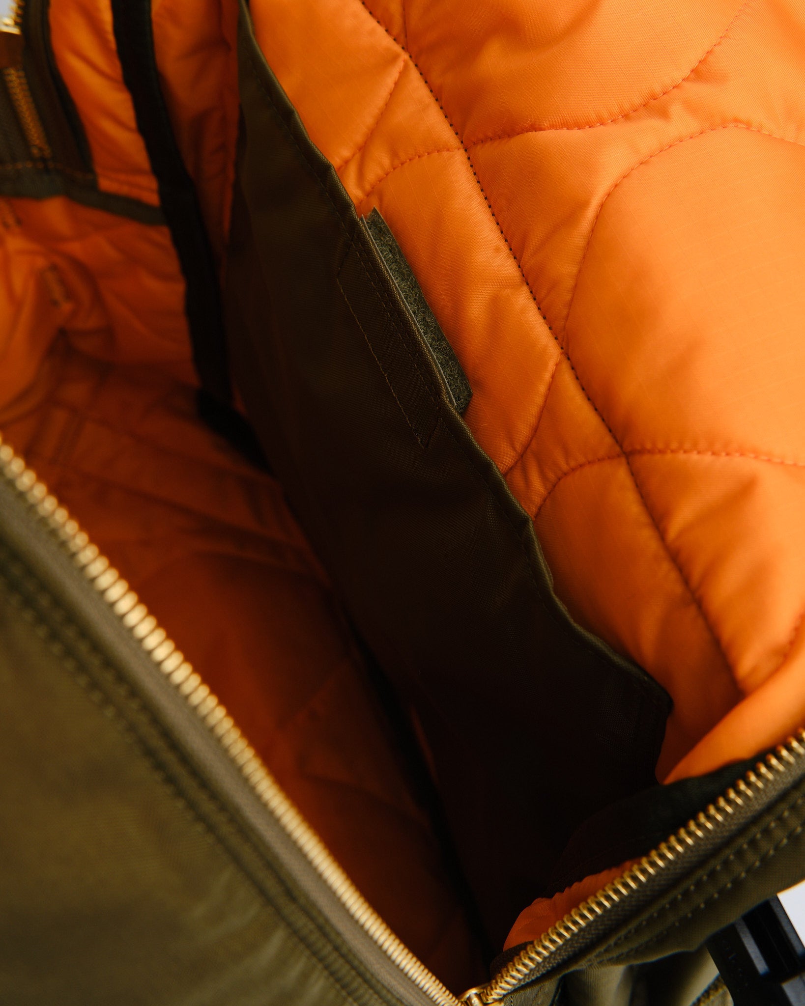 Le matériau extérieur est fabriqué à partir de tissu de qualité industrielle tissé avec 210 Denier 6 Nylon Strong File, utilisé à l'origine pour les bateaux en caoutchouc, le rendant exceptionnellement durable. L'intérieur possède une doublure orange couleur d'urgence, inspirée des doublures de la veste militaire et dispose d'un nylon ripstop matelassé pour une résilience supplémentaire.