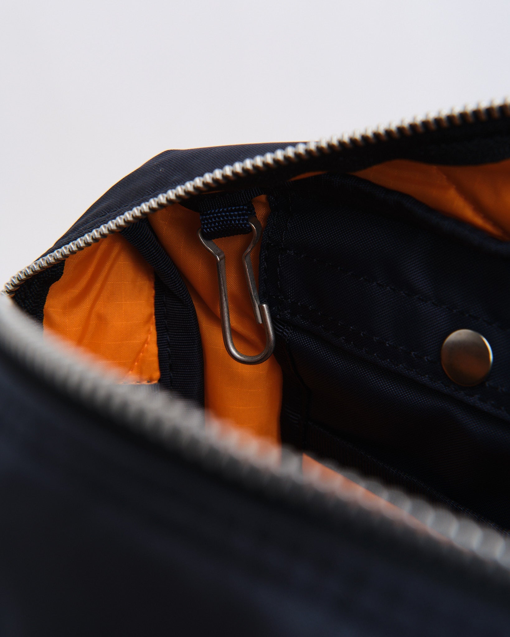 Le matériau extérieur est fabriqué à partir de tissu de qualité industrielle tissé avec 210 Denier 6 Nylon Strong File, utilisé à l'origine pour les bateaux en caoutchouc, le rendant exceptionnellement durable. L'intérieur dispose d'une doublure orange de couleur d'urgence, inspirée des doublures de la veste militaire, et est matelassé avec nylon ripstop pour plus de résilience.