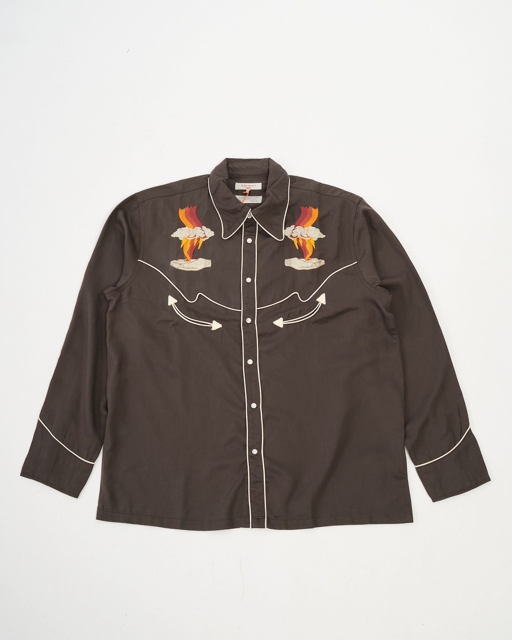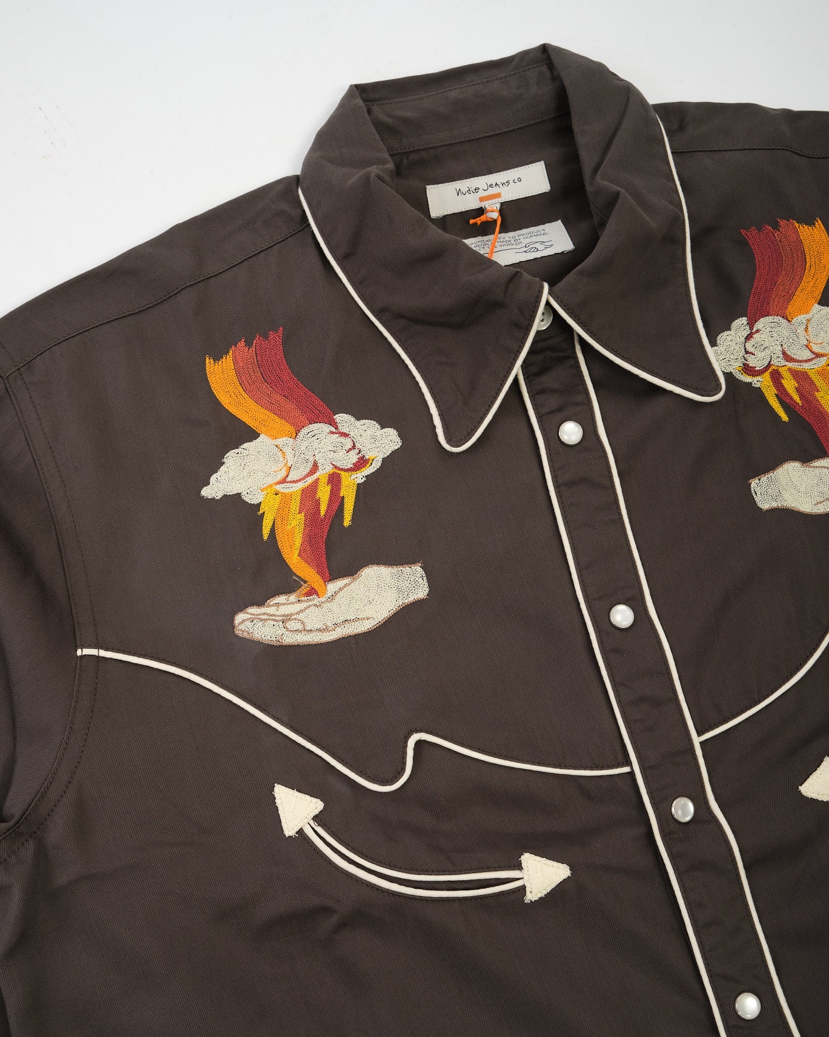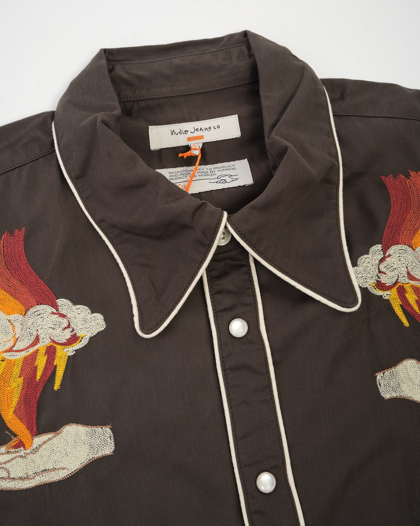 The Gonzo Western Shirt in Sunburns Black/Brown is Nudie’s tribute to classic cowboy cool, reimagined in soft, flowing TENCEL™ Lyocell. It’s light, drapey, and cool to the touch — but it’s the details that steal the show: vintage-style embroidery, piped seams, and pearl prong snap buttons that make every outfit a little bit bolder. Relaxed in fit and rich in character, this shirt blends old-school charm with modern values. Like every Nudie piece, it’s made with care — and yes, fair wages were part of the deal.