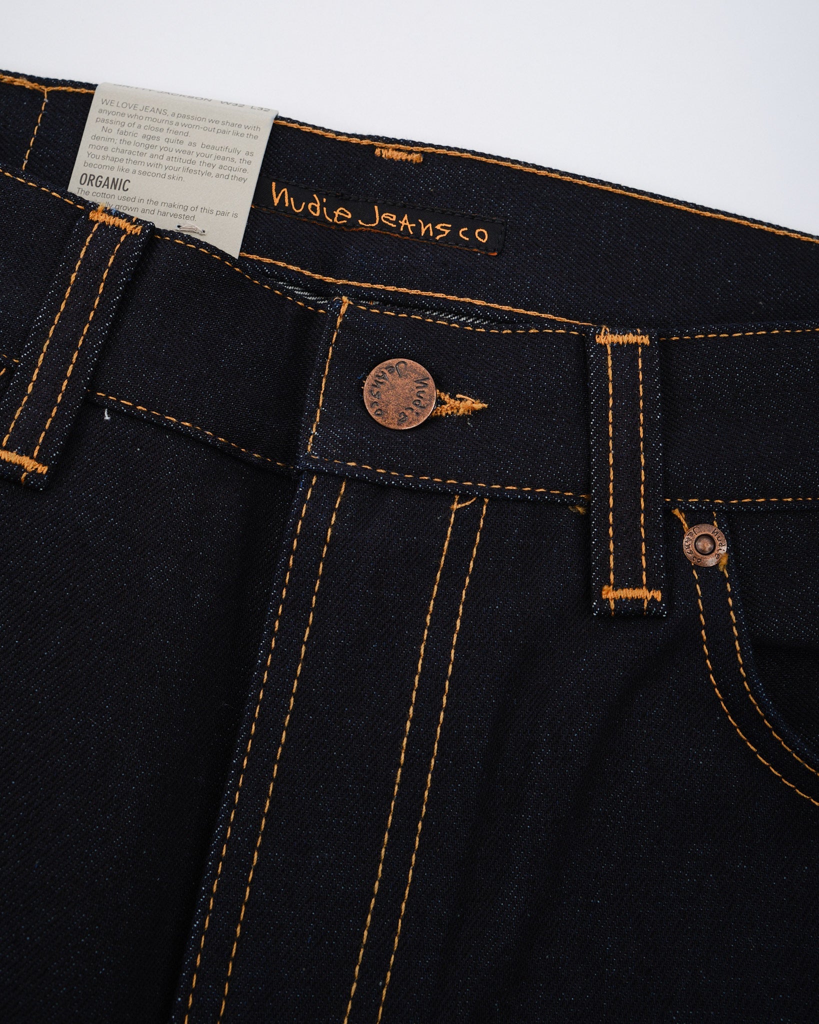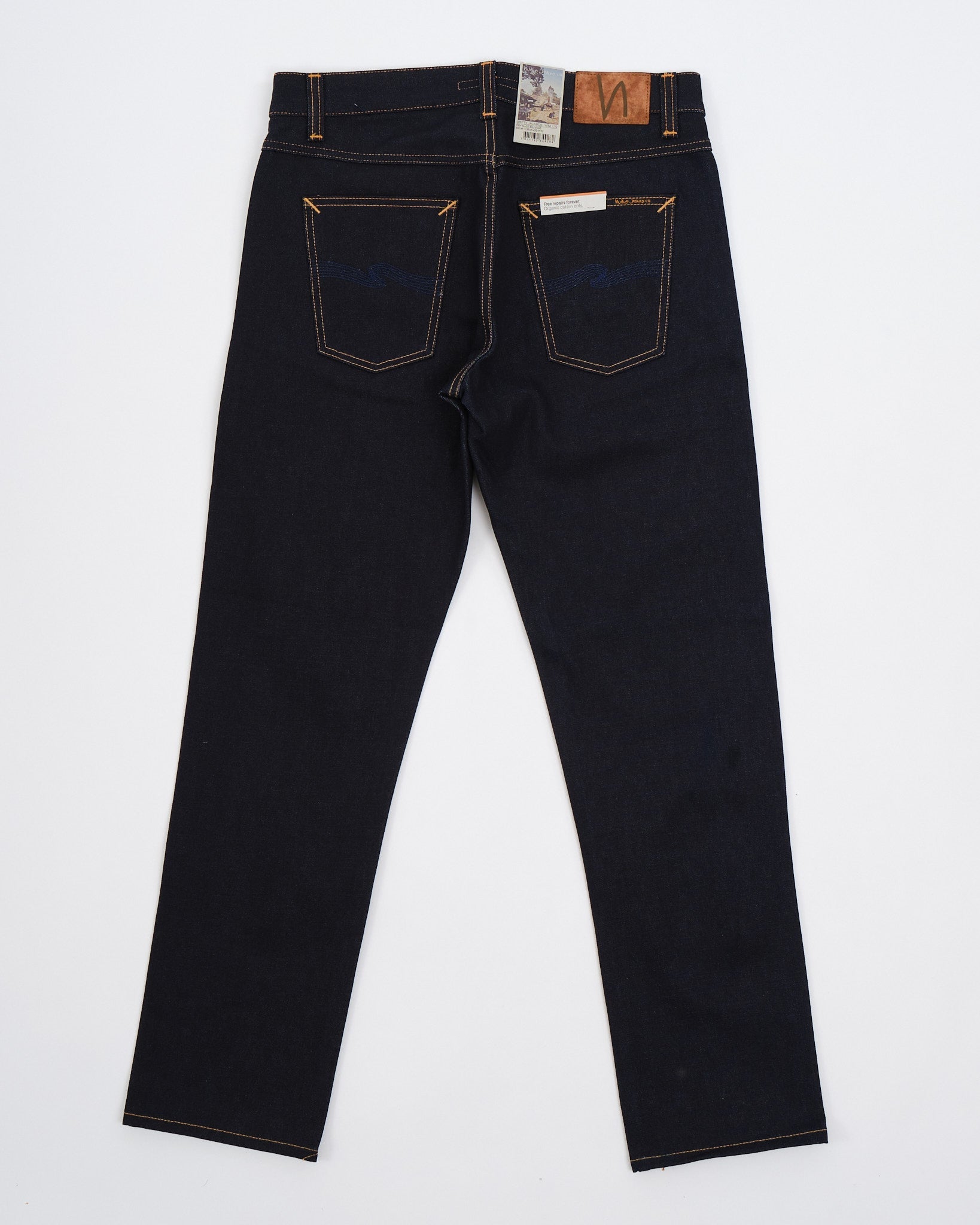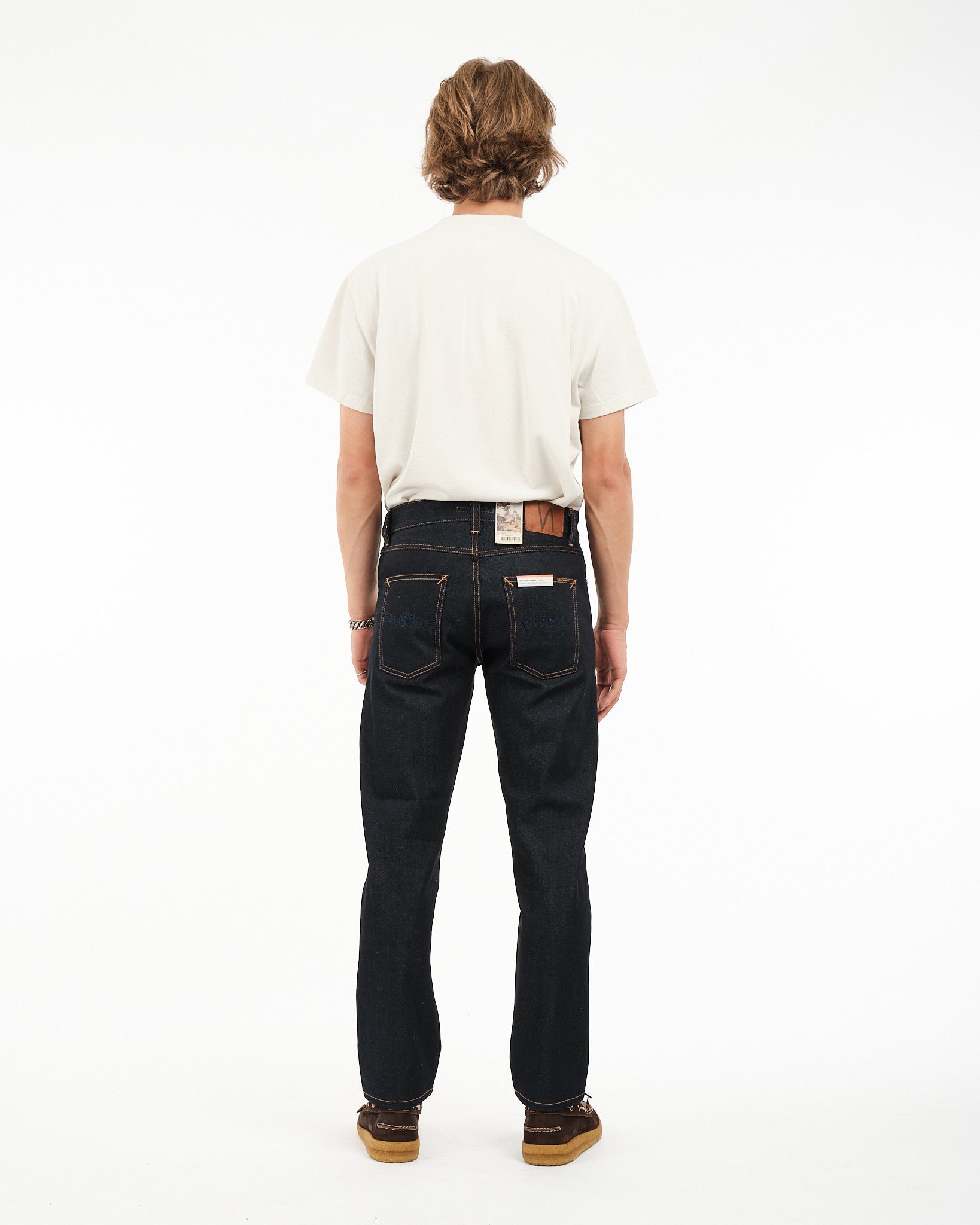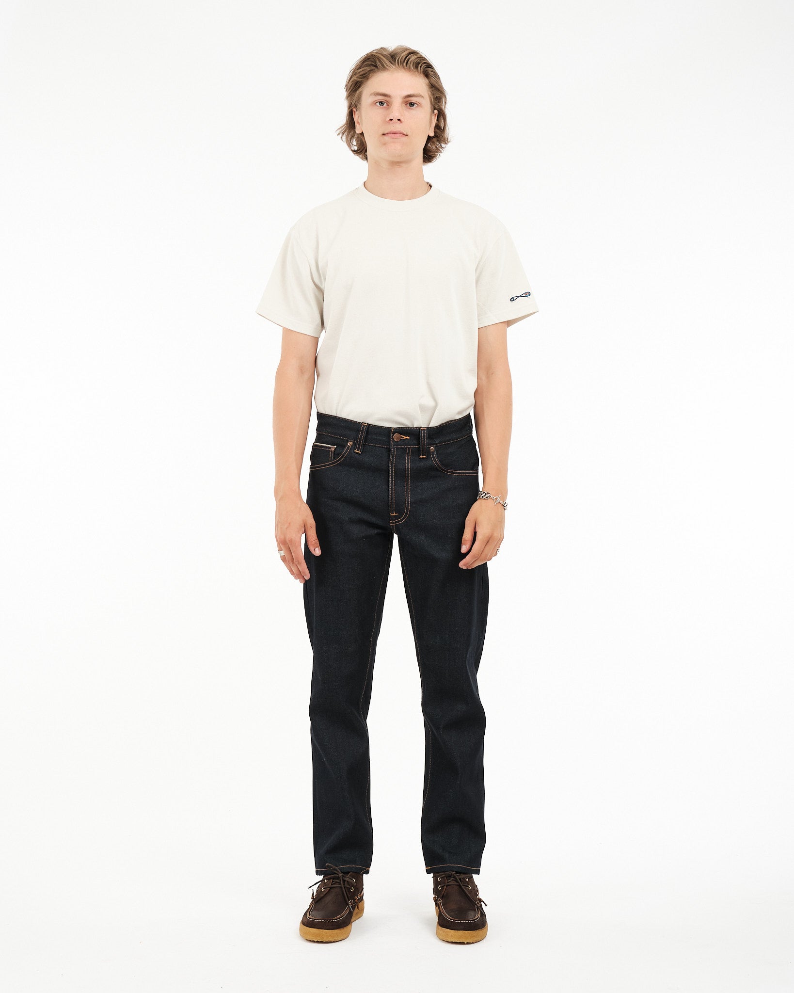 Améliorez votre collection de denim avec le Nudie Jeans Grande-Jackson dans le lien sec. Fabriqué à partir de coton 100%, ce denim rigide turc de 14,25 oz est doté d'une riche teinte indigo sombre avec une texture lisse et un motif diagonal cohérent. La silhouette de montée moyenne et de jambe droite offre un style durable et une facilité. Les caractéristiques notables incluent les coutures de poche de la Marine, le fil de bronzage sur toutes les autres coutures, les accents en laiton, une fermeture à glissière et une étiquette Jacron. Avec l'usure, le denim acquiert une profondeur à mesure que la surface s'estompe tout en conservant ses nuances plus sombres. Embrassez une apparence vécue, à chaque utilisation.