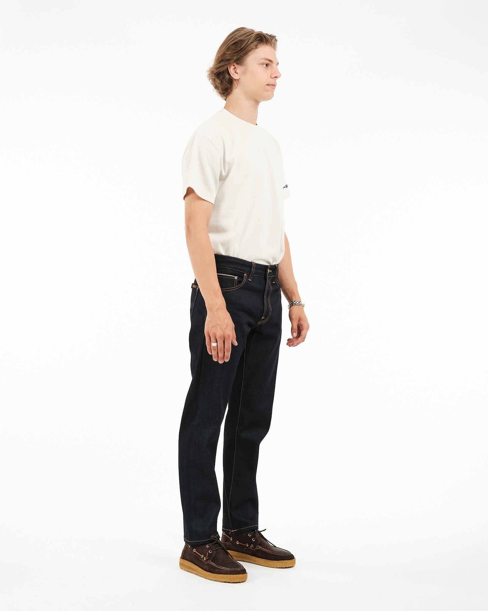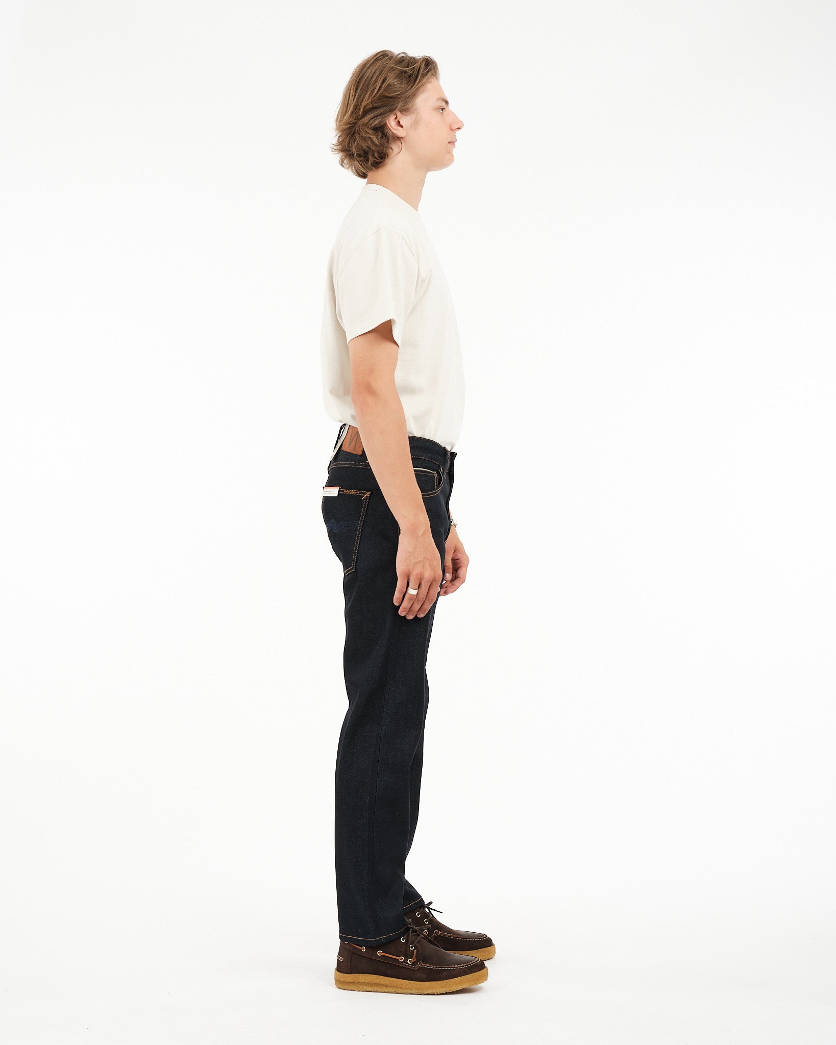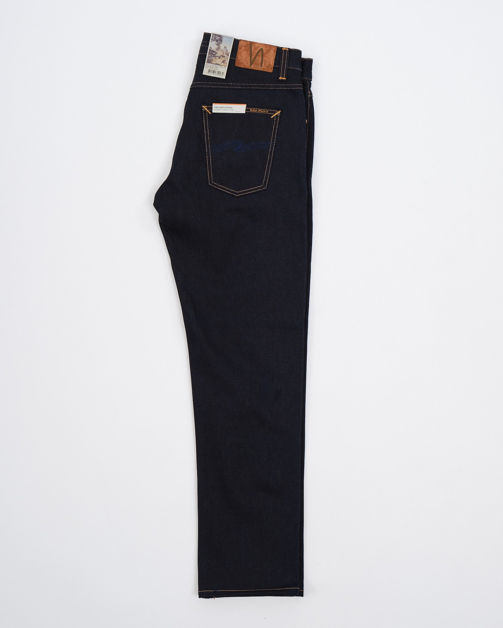 Améliorez votre collection de denim avec le Nudie Jeans Grande-Jackson dans le lien sec. Fabriqué à partir de coton 100%, ce denim rigide turc de 14,25 oz est doté d'une riche teinte indigo sombre avec une texture lisse et un motif diagonal cohérent. La silhouette de montée moyenne et de jambe droite offre un style durable et une facilité. Les caractéristiques notables incluent les coutures de poche de la Marine, le fil de bronzage sur toutes les autres coutures, les accents en laiton, une fermeture à glissière et une étiquette Jacron. Avec l'usure, le denim acquiert une profondeur à mesure que la surface s'estompe tout en conservant ses nuances plus sombres. Embrassez une apparence vécue, à chaque utilisation.