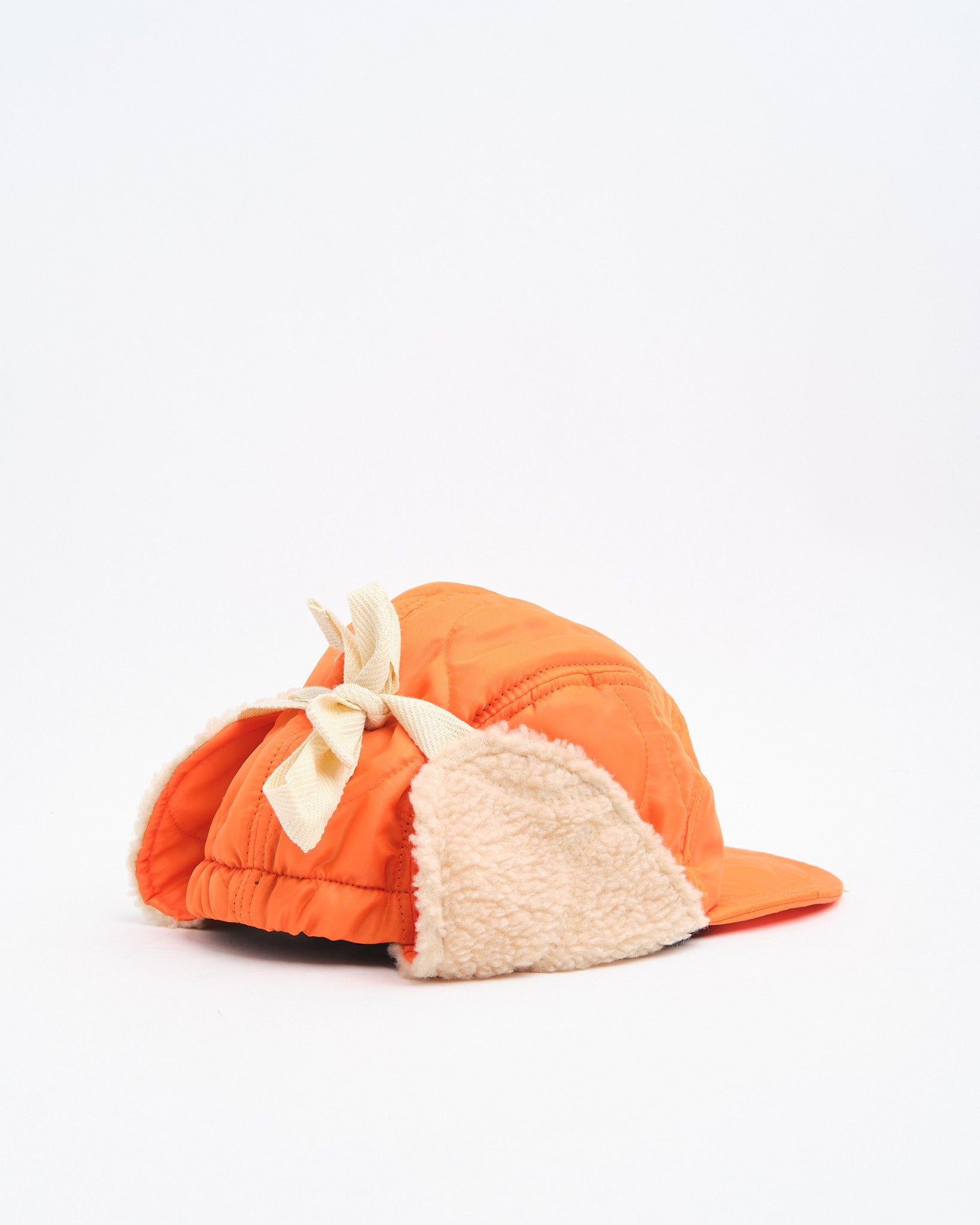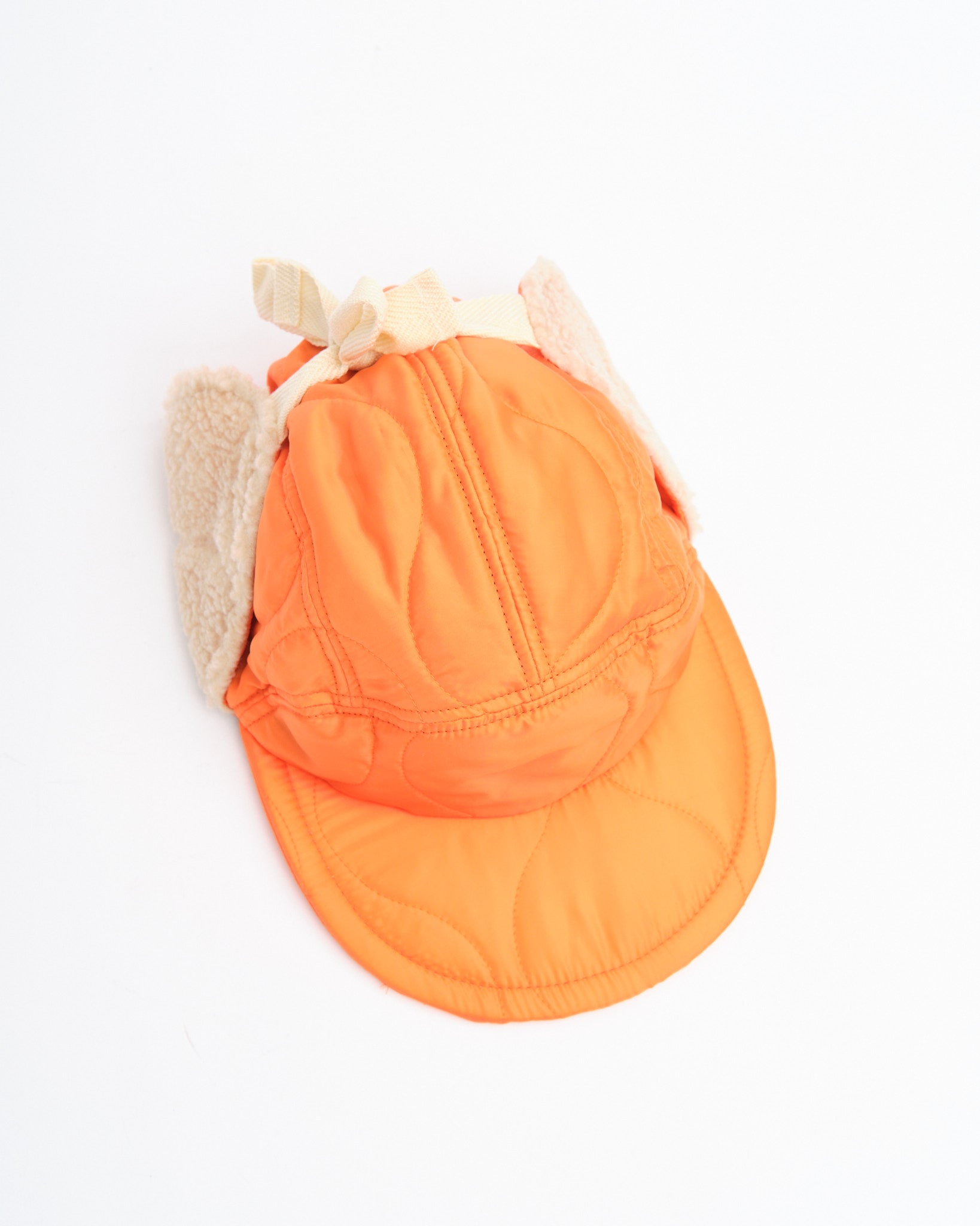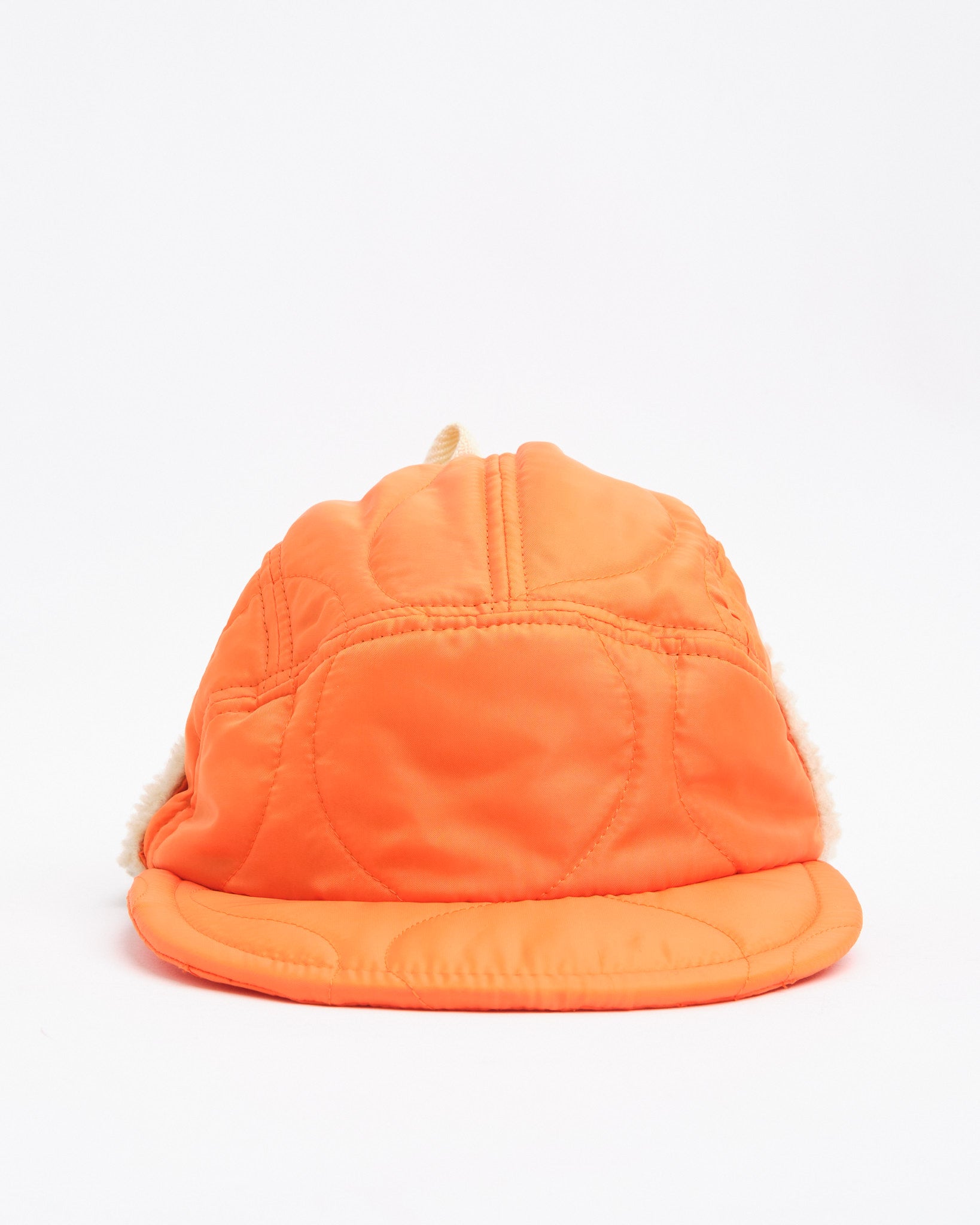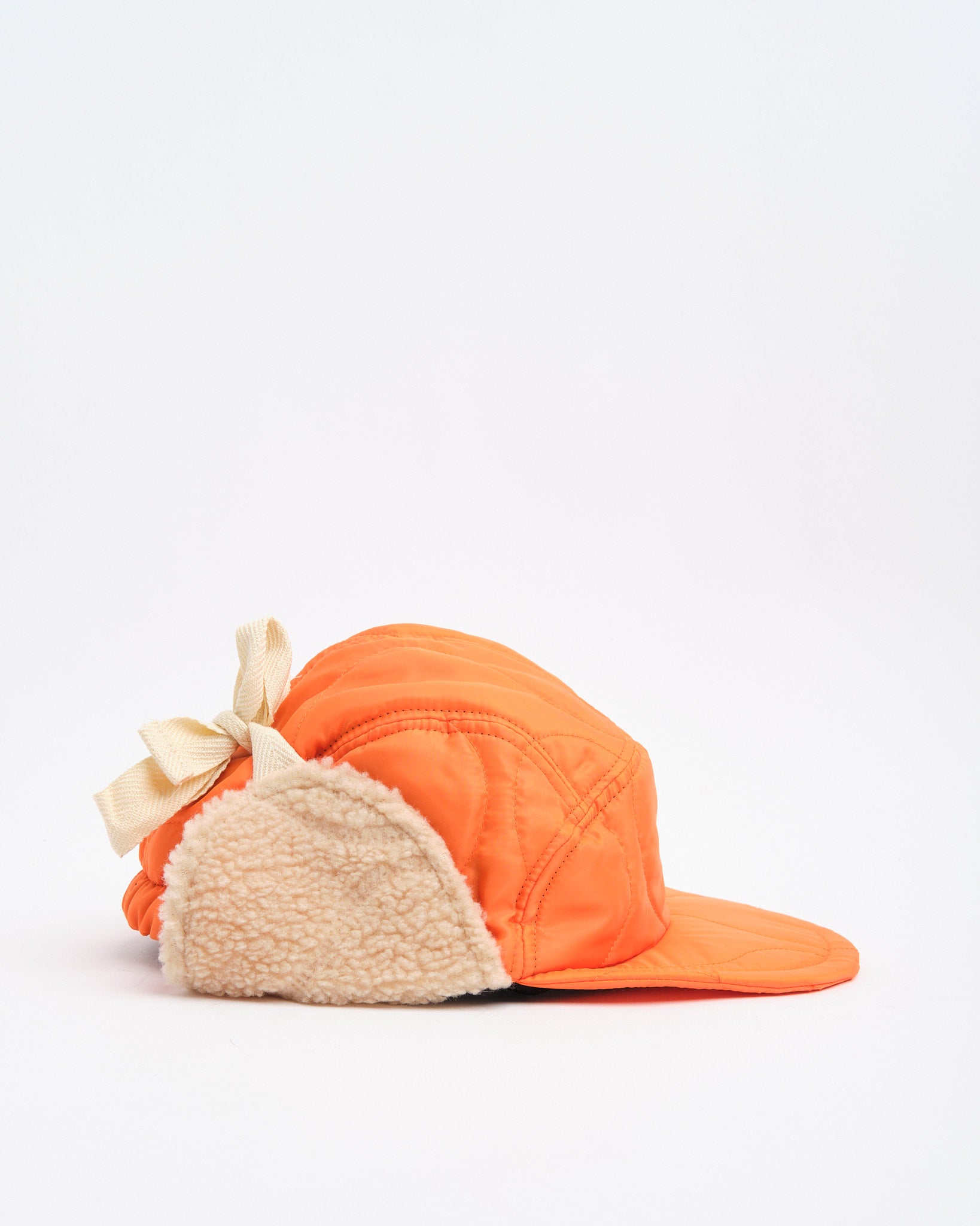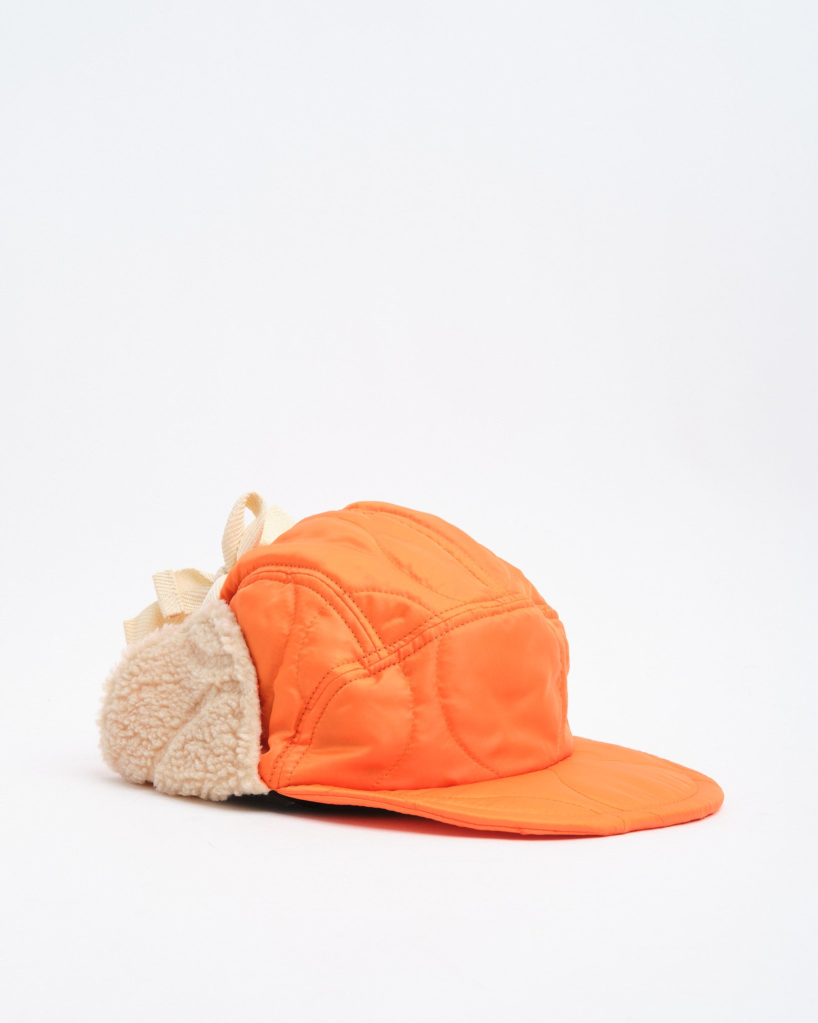The Halfmoon Cap With Ears in Orange by Found Feather fuses military functionality with bold styling. Made in Japan from quilted nylon with a lightweight polyester fill, it features plush boa fleece ear panels and a soft EVA foam brim for warmth and comfort without weight. The four-panel design provides structure, while full-back elastic and cotton flat laces give it a secure, adaptable fit. Finished with hand-stamped detail, cotton twill lining, and a QR-coded care label, this cap is equal parts utilitarian and expressive.