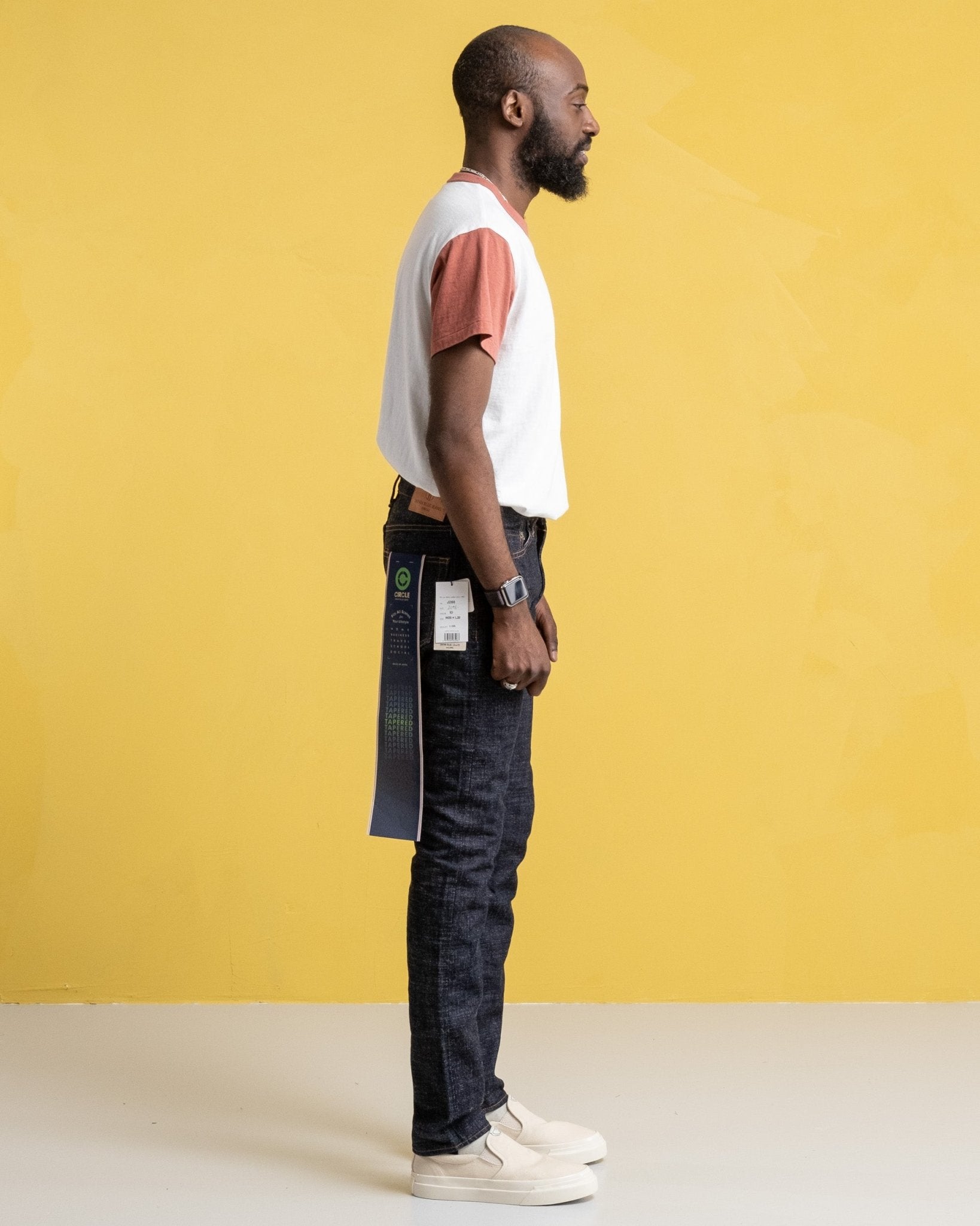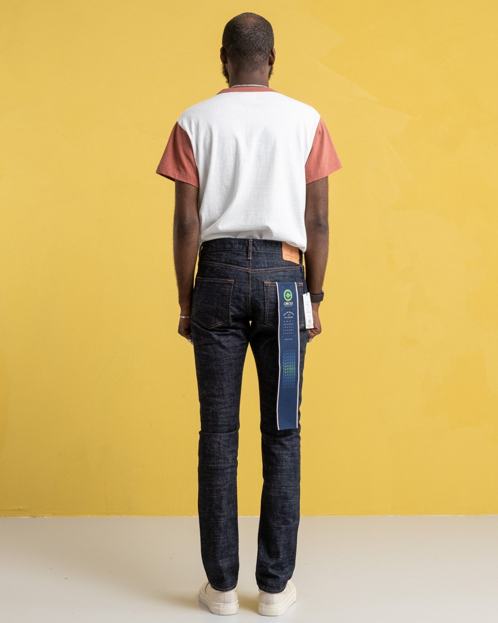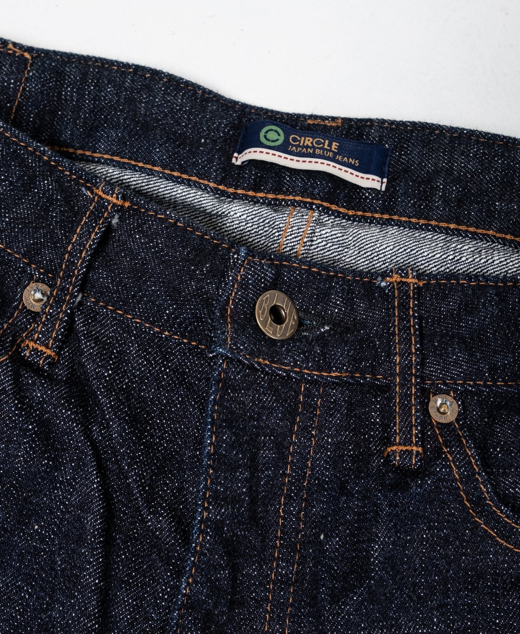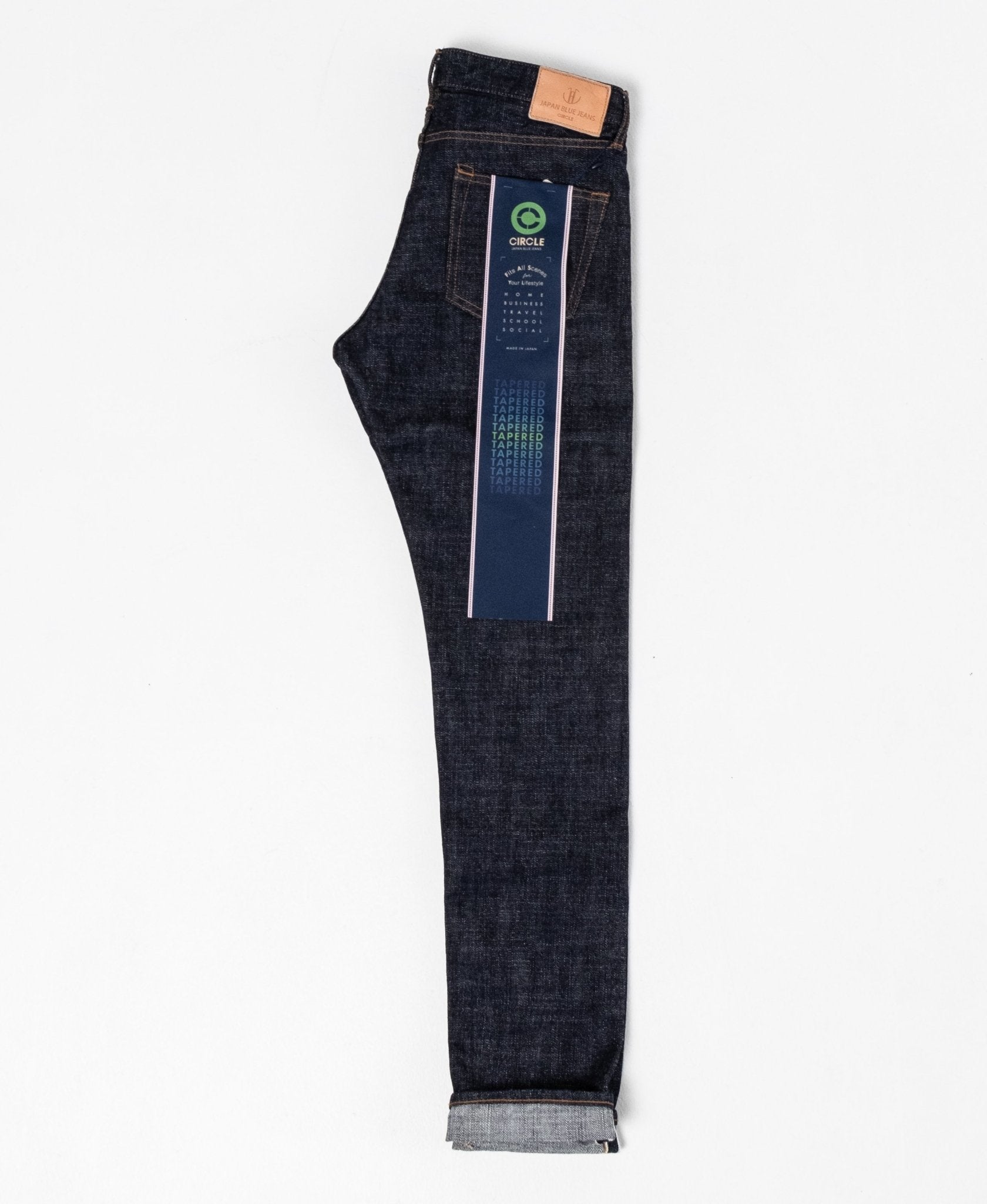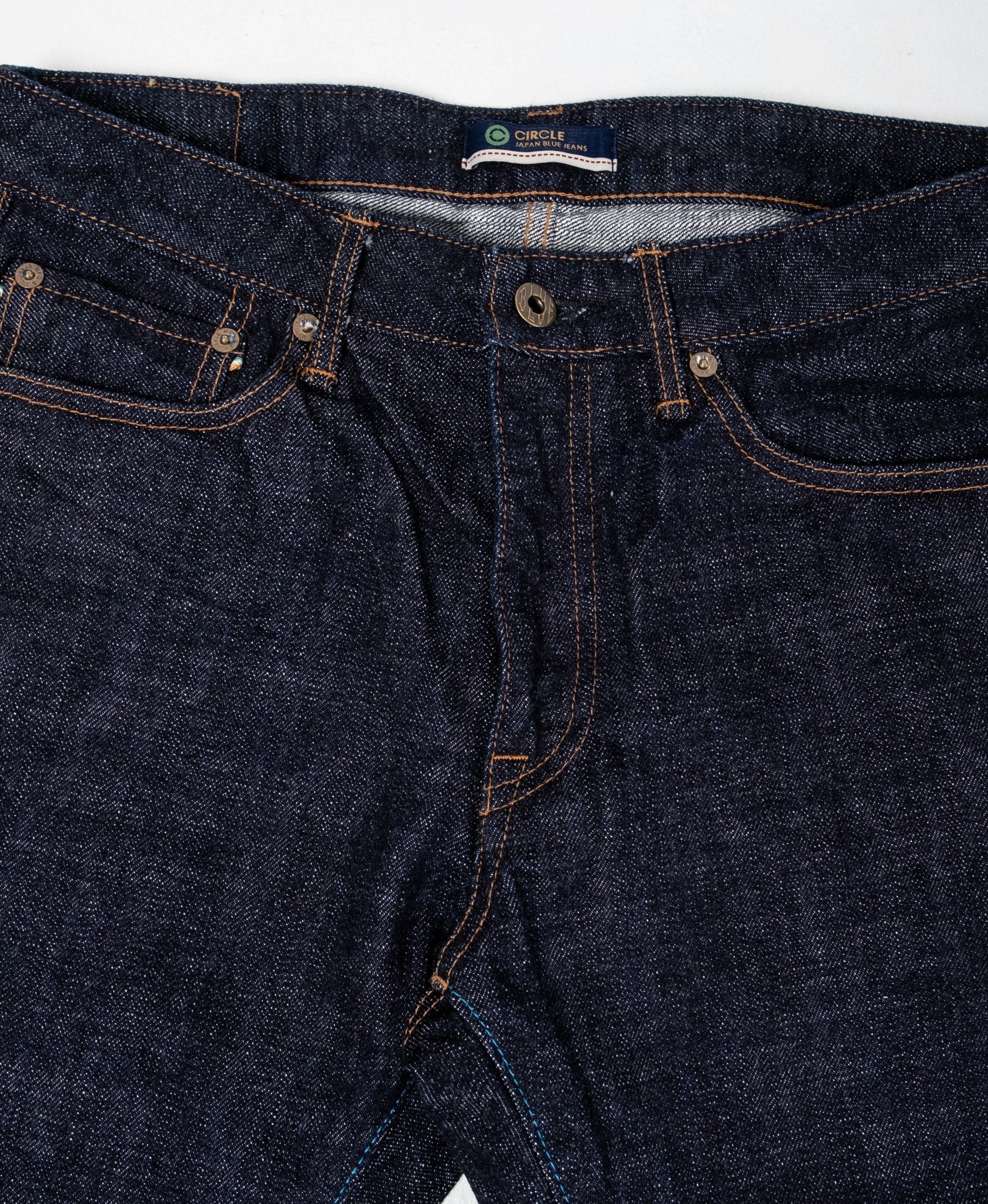 J266 Circle 16,5 Jeans effilés oz du Japon Blue Jeans. Une silhouette effilée moderne avec une silhouette maigre des genoux aux ourlets. Le denim de selvage vintage de l'once lourd est fait d'un coton naturel à partir de Côte d'Ivoire. En la coudant avec une touche faible dans une machine, le produit terminé finit comme un denim fait à la main. Le matériau est un peu rude au début, mais il sera progressivement plus fluide en le portant pendant un certain temps. Fait au Japon.