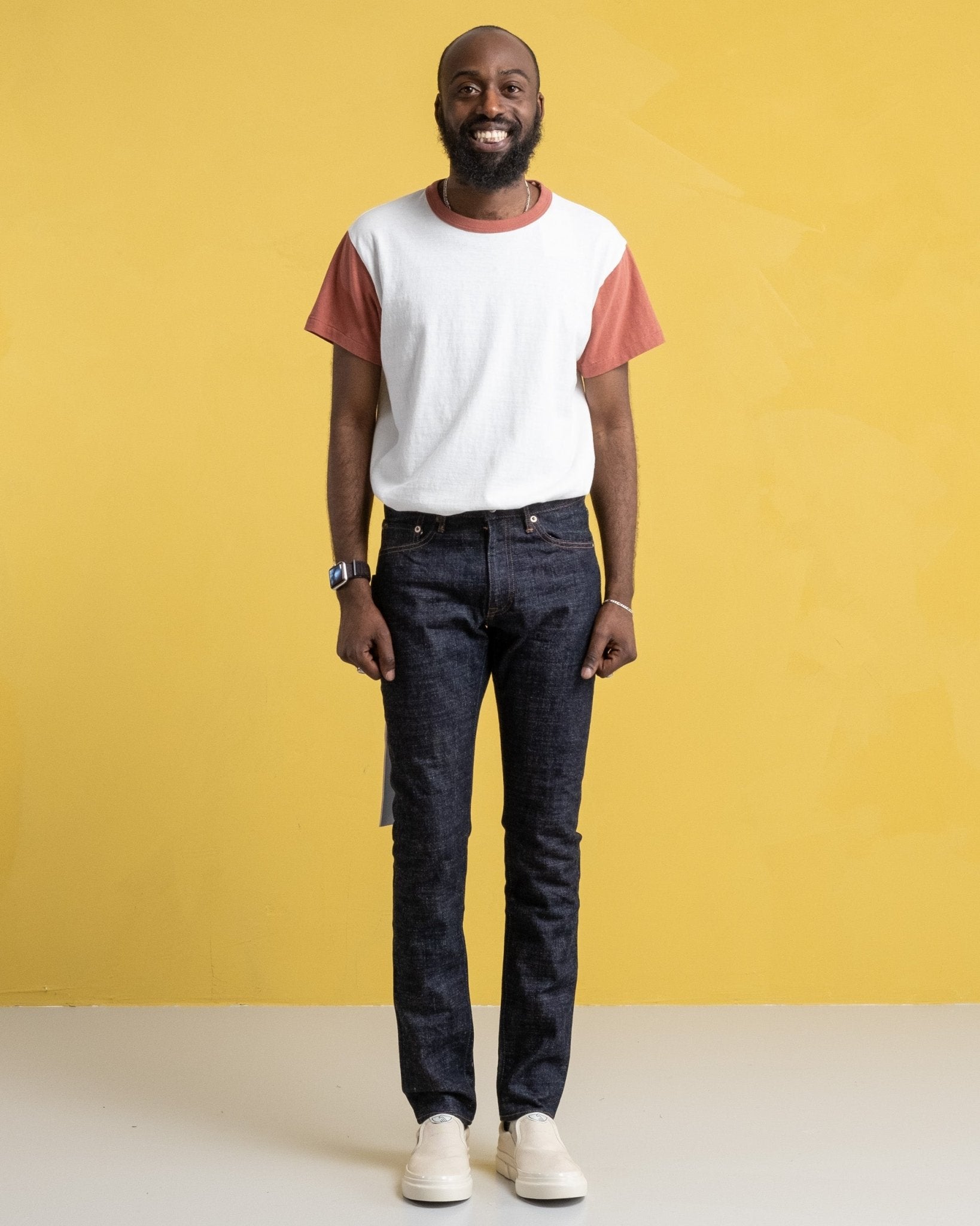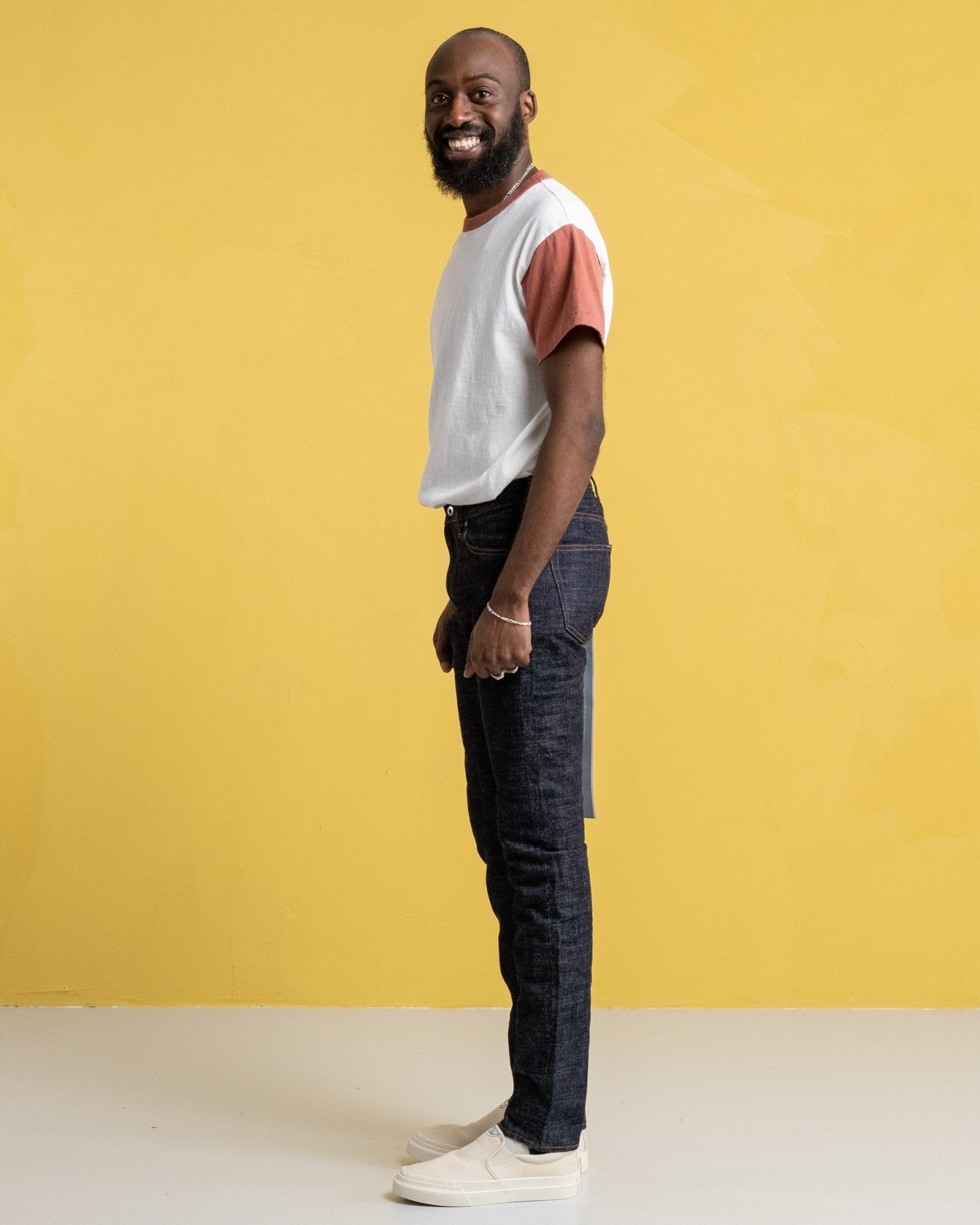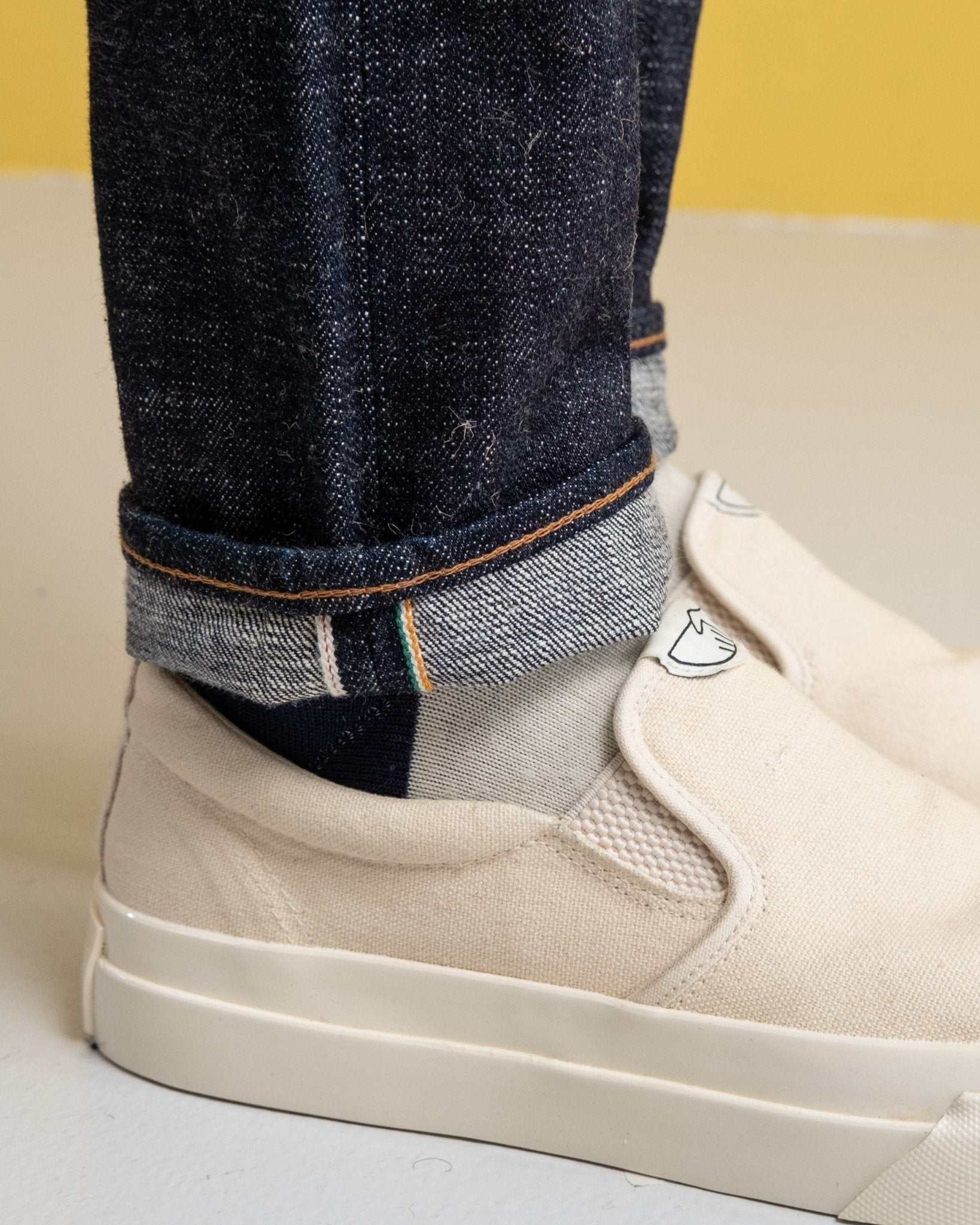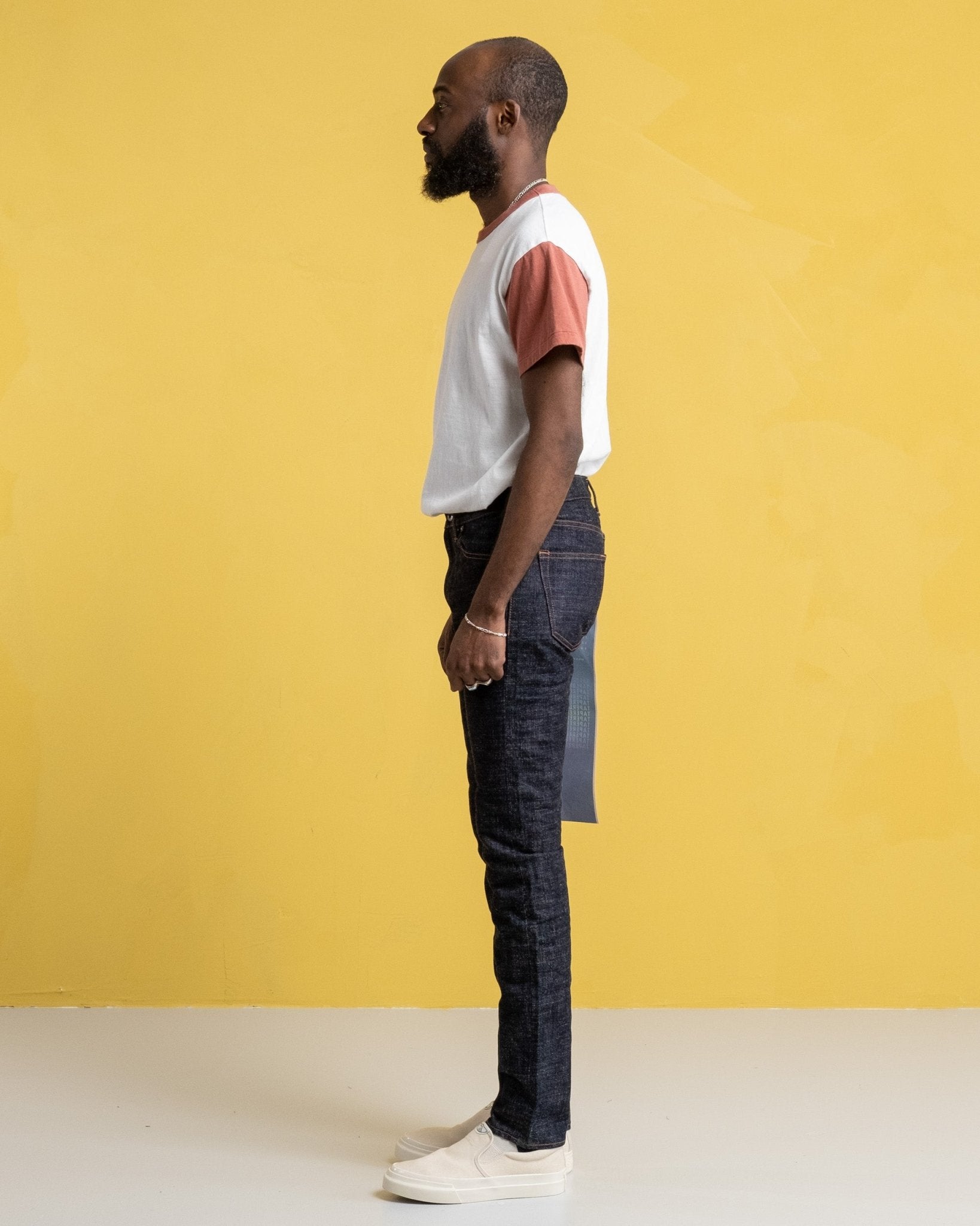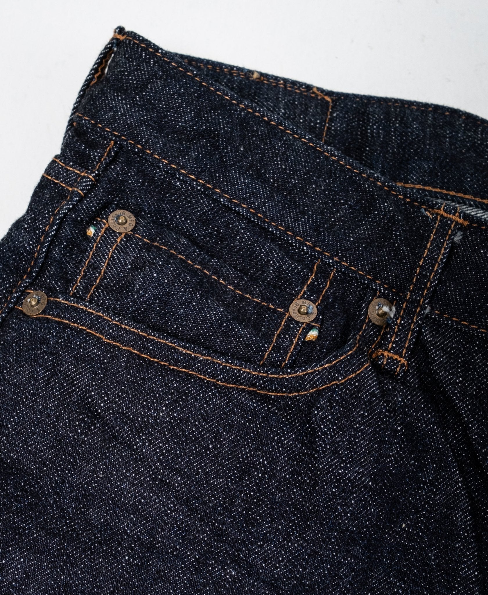 J266 Circle 16,5 Jeans effilés oz du Japon Blue Jeans. Une silhouette effilée moderne avec une silhouette maigre des genoux aux ourlets. Le denim de selvage vintage de l'once lourd est fait d'un coton naturel à partir de Côte d'Ivoire. En la coudant avec une touche faible dans une machine, le produit terminé finit comme un denim fait à la main. Le matériau est un peu rude au début, mais il sera progressivement plus fluide en le portant pendant un certain temps. Fait au Japon.