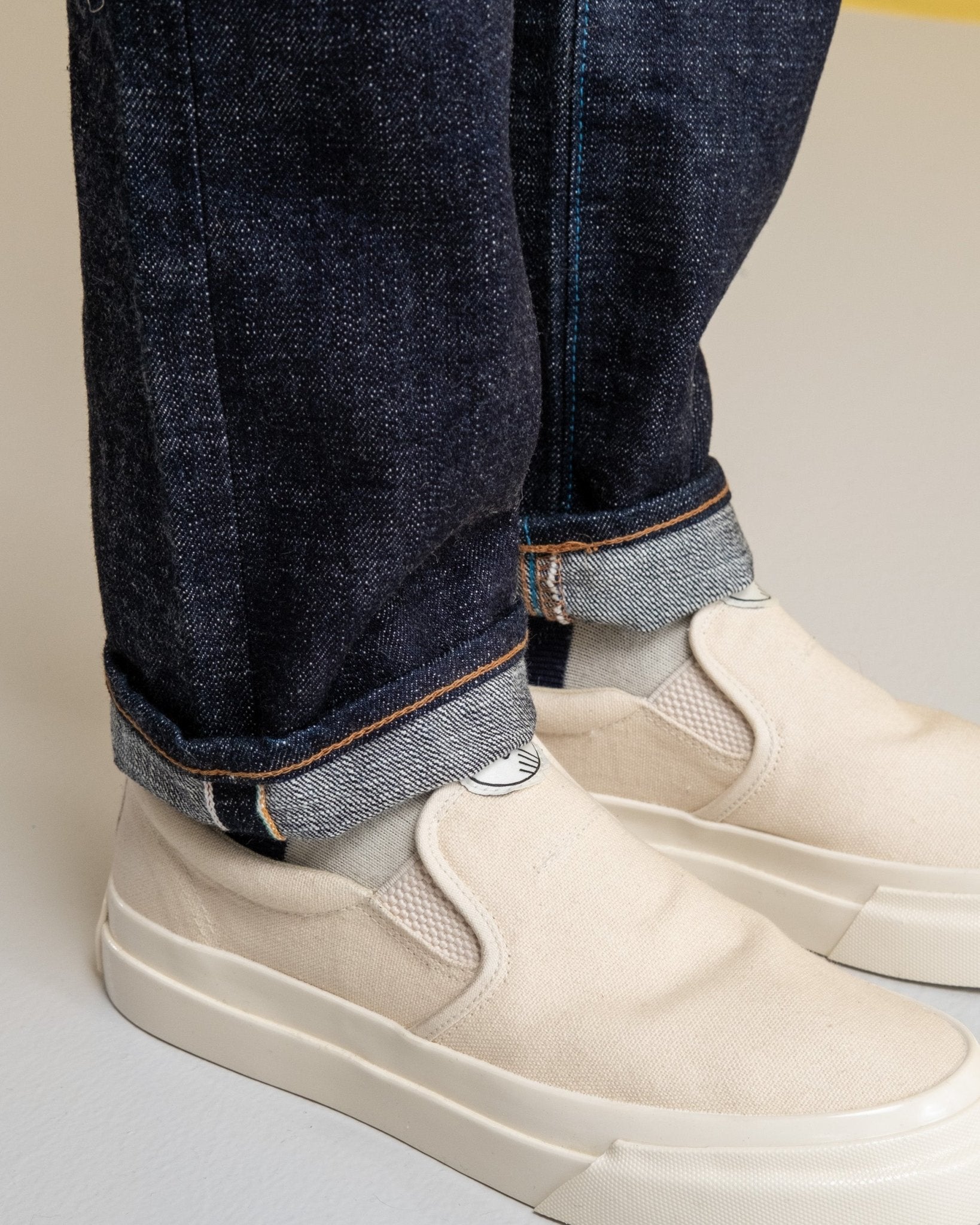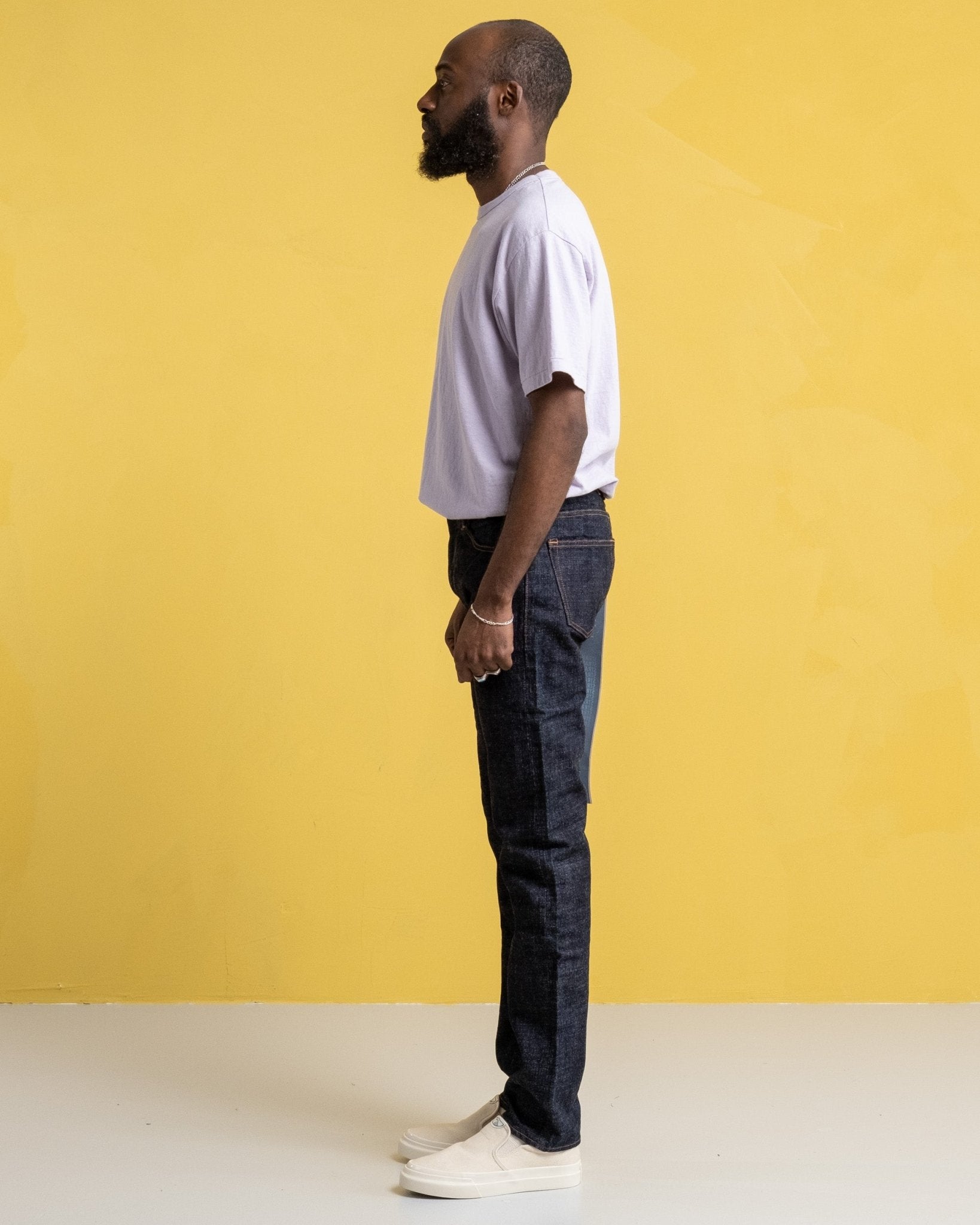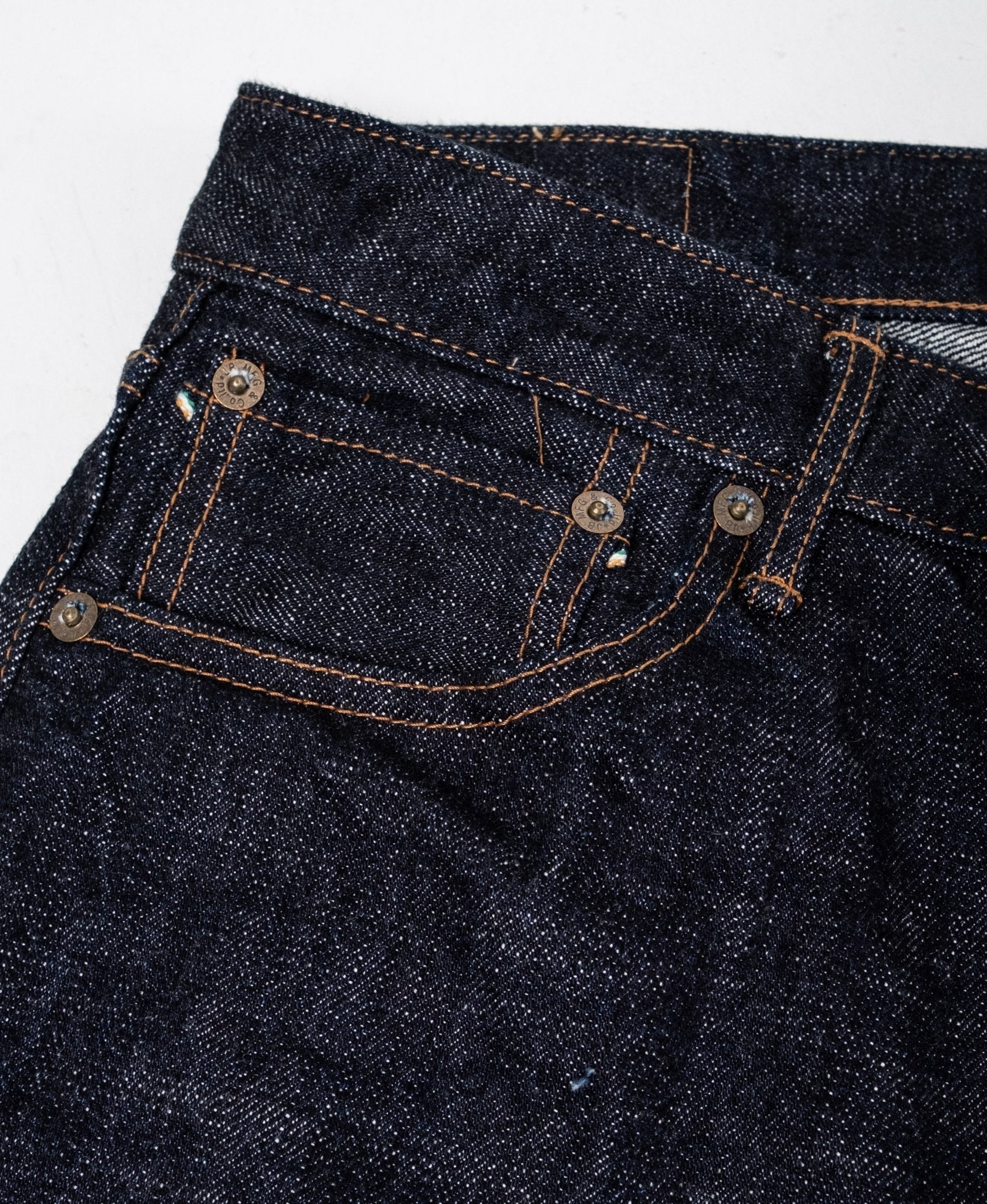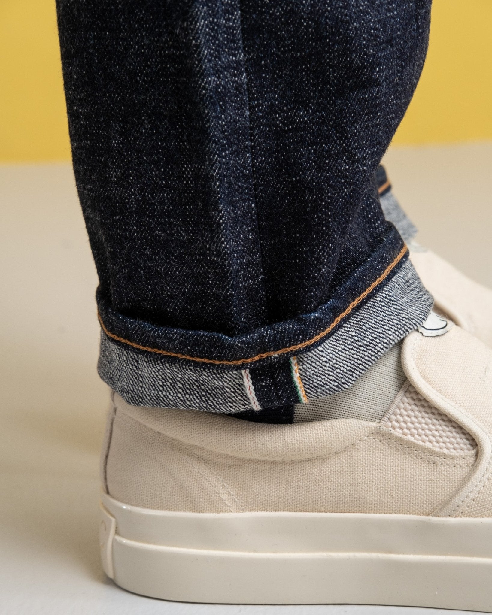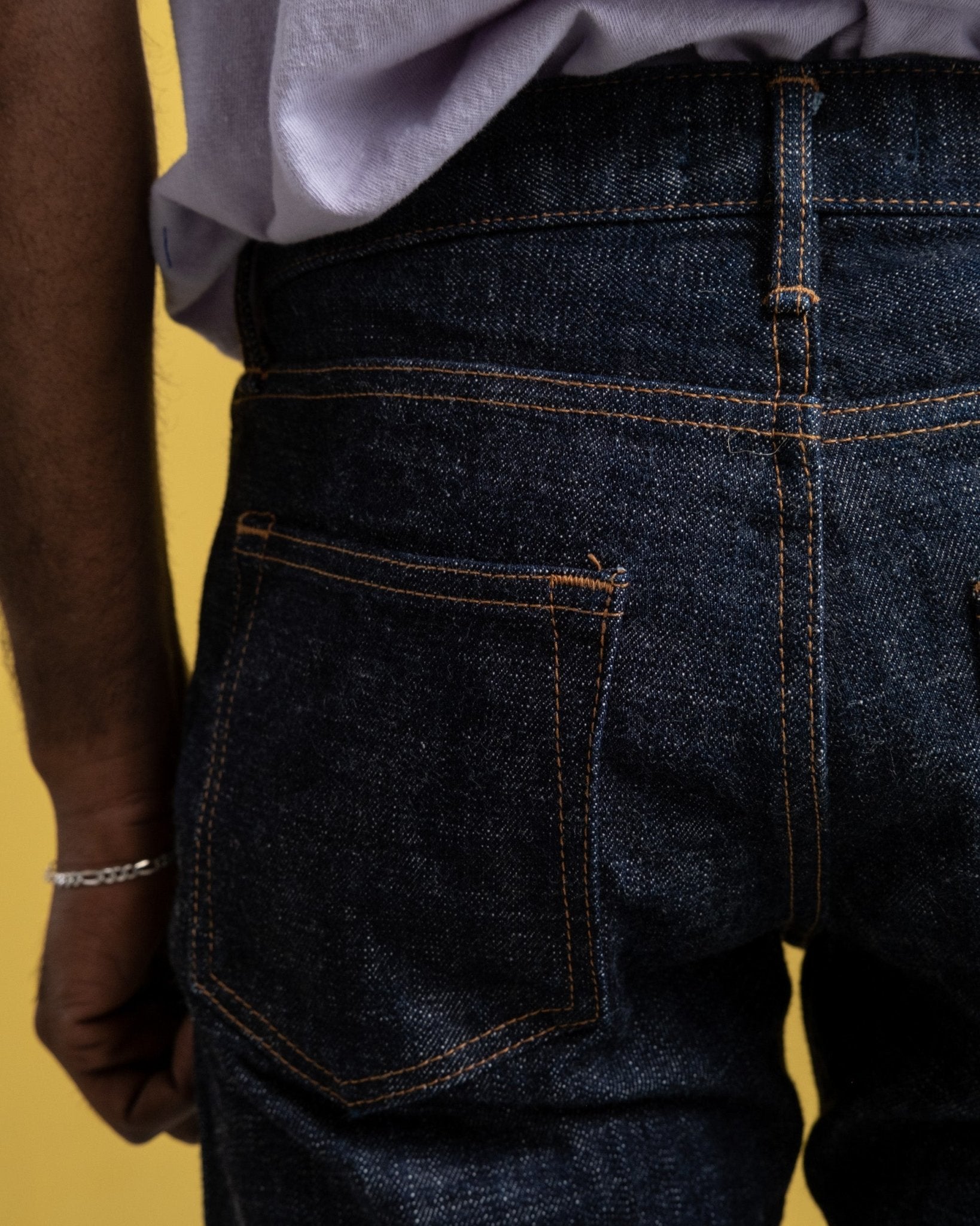 J366 Circle 16,5 oz Jeans droits du Japon Blue Jeans. Il atterrit quelque part entre mince et détendu. Il a un peu d'espace autour des cuisses et un beau cône du genou vers le bas. Le denim de selvage vintage de l'once lourd est fait d'un coton naturel à partir de Côte d'Ivoire. En la coudant avec une touche faible dans une machine, le produit terminé finit comme un denim fait à la main. Le matériau est un peu rude au début, mais il sera progressivement plus fluide en le portant pendant un certain temps. Fait au Japon.