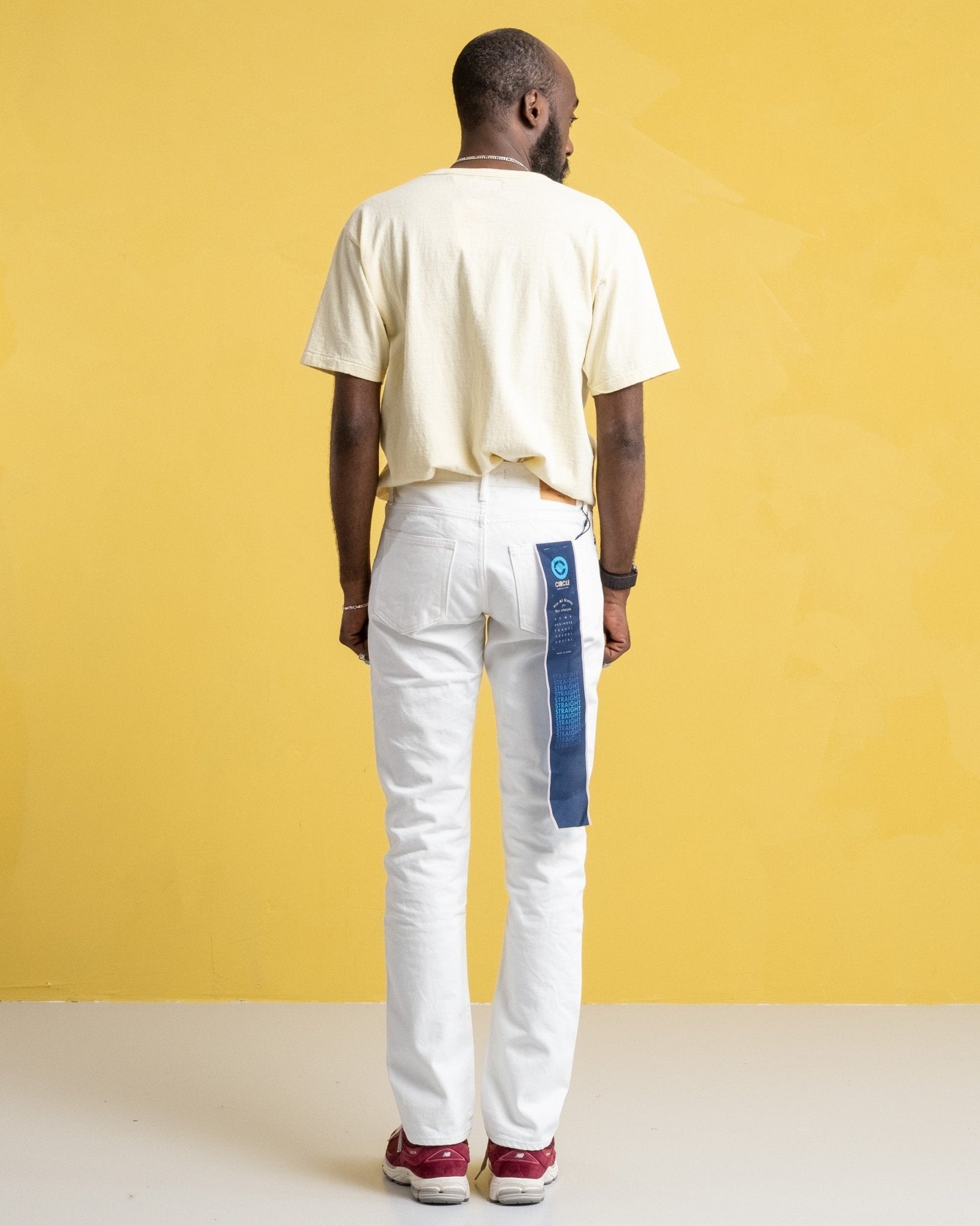 J370 Circle 14 oz Jeans blancs droits du Japon Blue Jeans. Il atterrit quelque part entre mince et détendu. Il a un peu d'espace autour des cuisses et un beau cône du genou vers le bas. Le denim de selvage vintage de l'once lourd est fait d'un coton naturel à partir de Côte d'Ivoire. En la coudant avec une touche faible dans une machine, le produit terminé finit comme un denim fait à la main. Le matériau est plus lisse et super confortable pour le début. Fait au Japon.