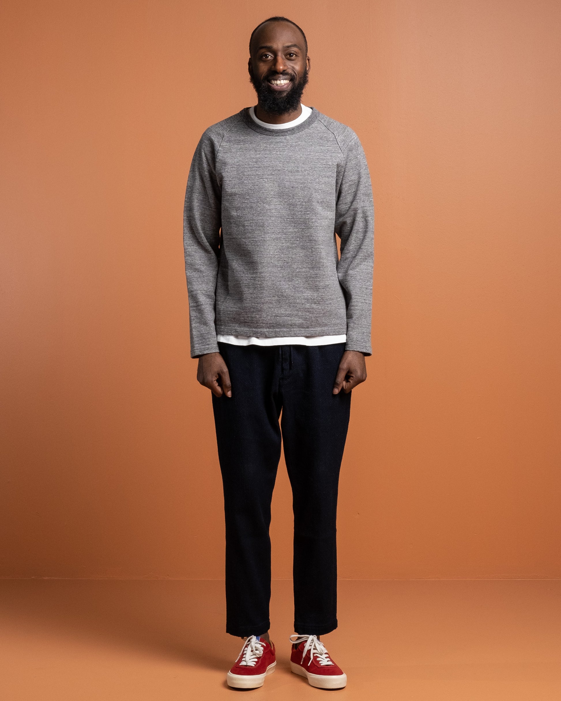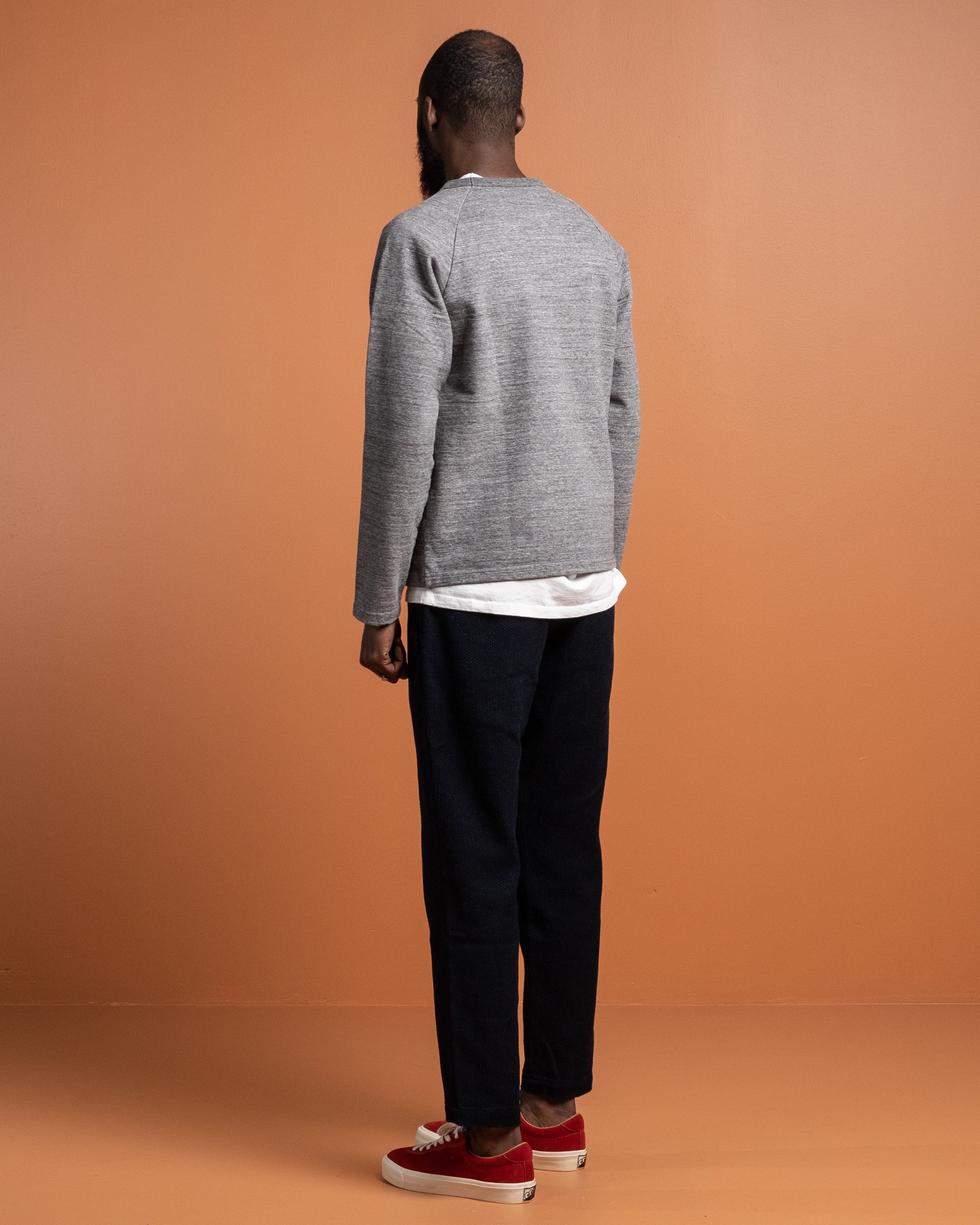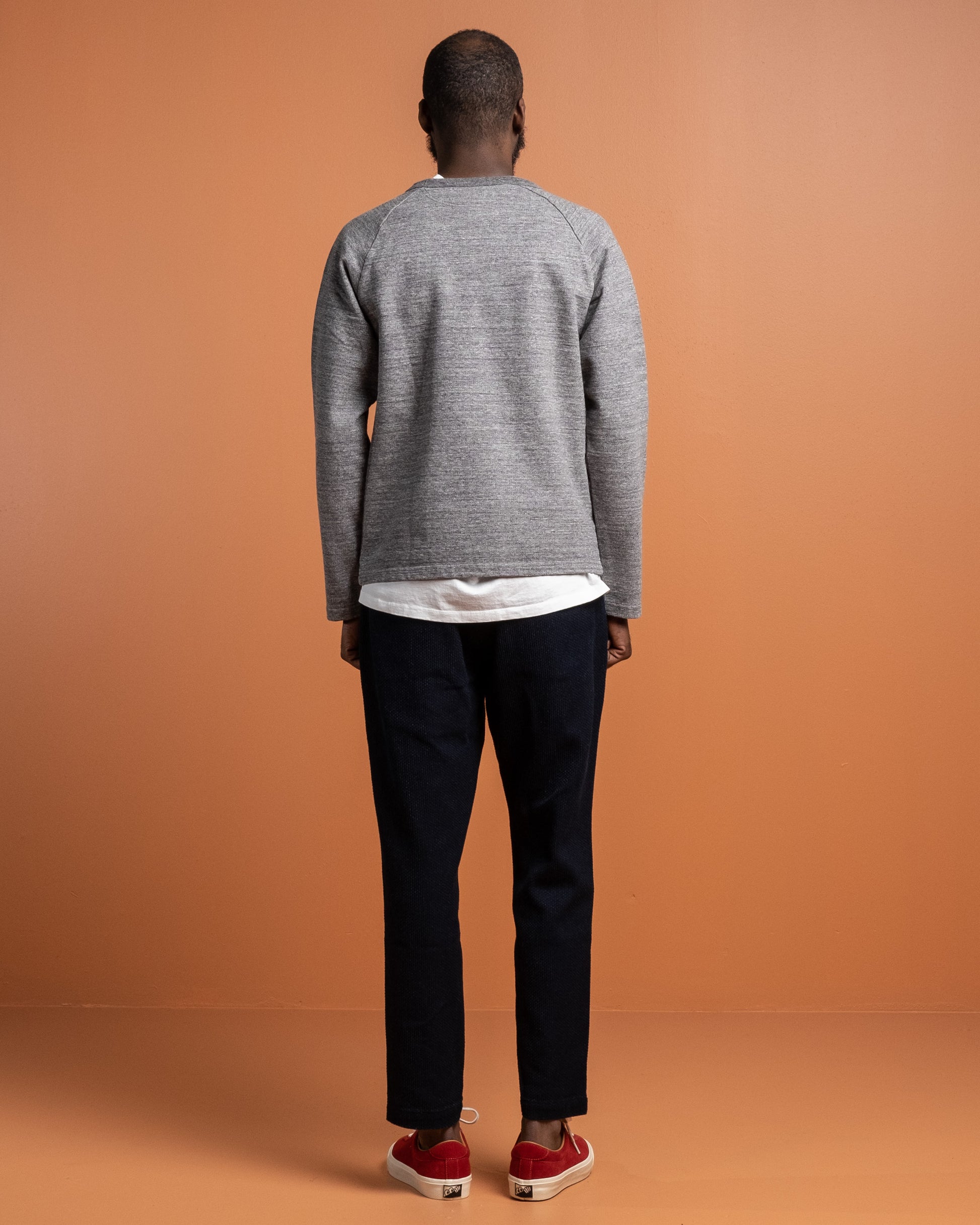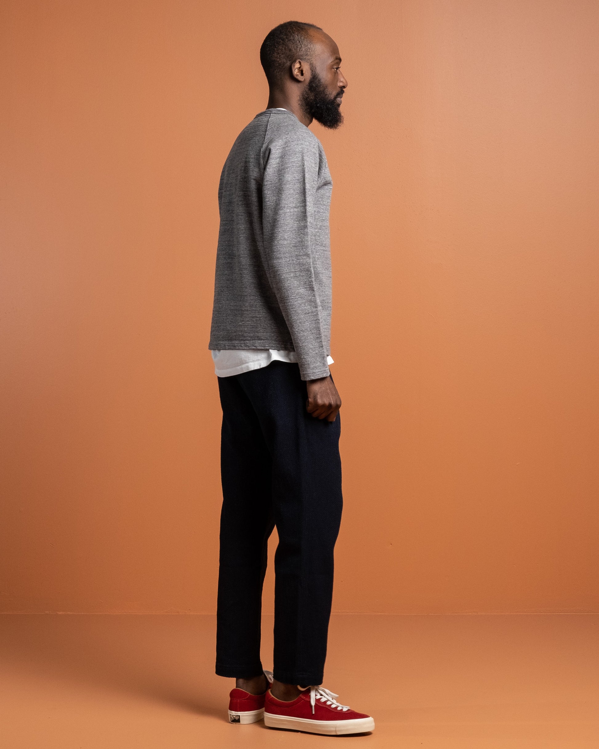 J6740J01 T-shirt à manches longues de 16,5 oz à manches longues en charbon de bois de Japan Blue Jeans. Créé à l'aide de techniques de tricot vintage et complexes. Beau tissu de coton de 16,5 oz avec manches raglan de style vintage. Fait au Japon.