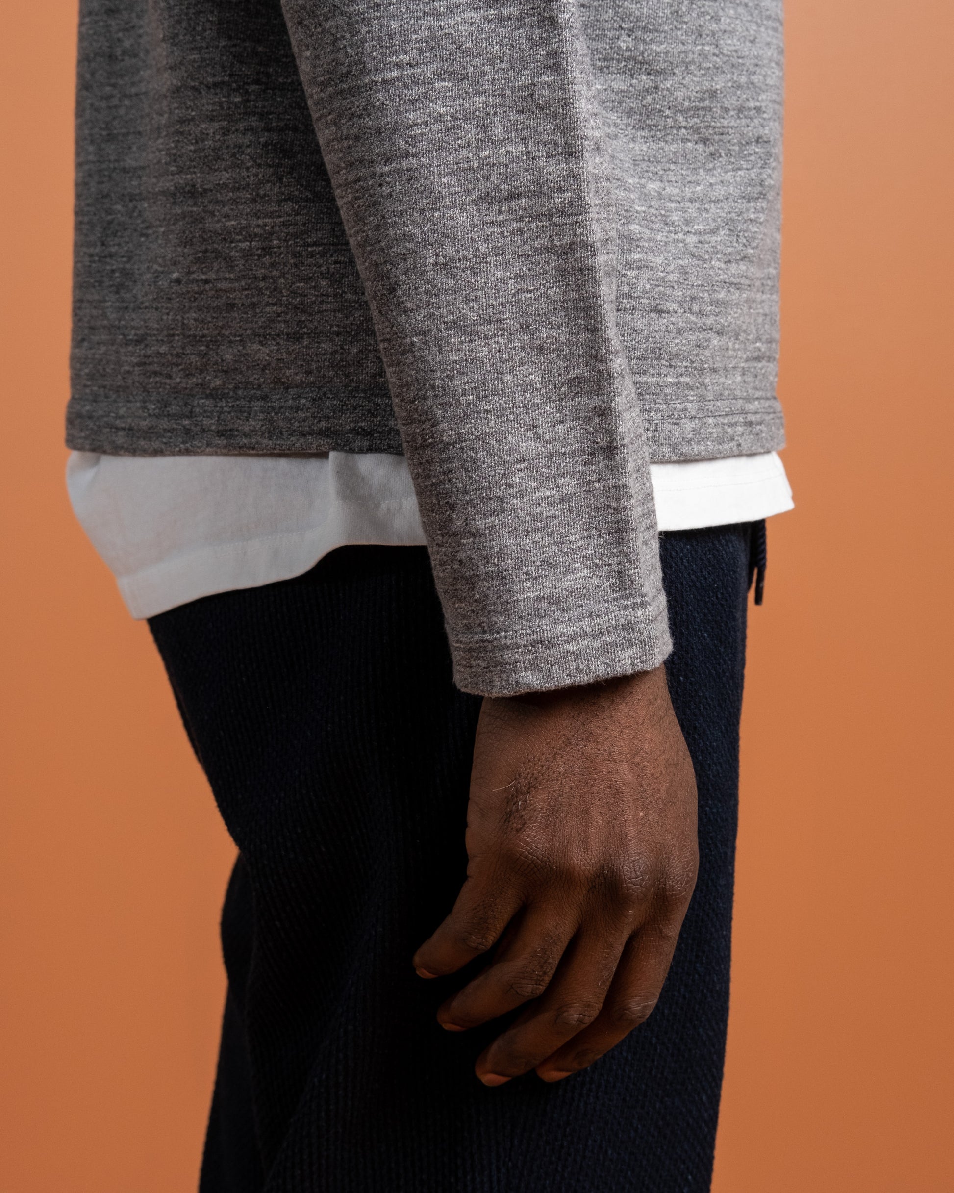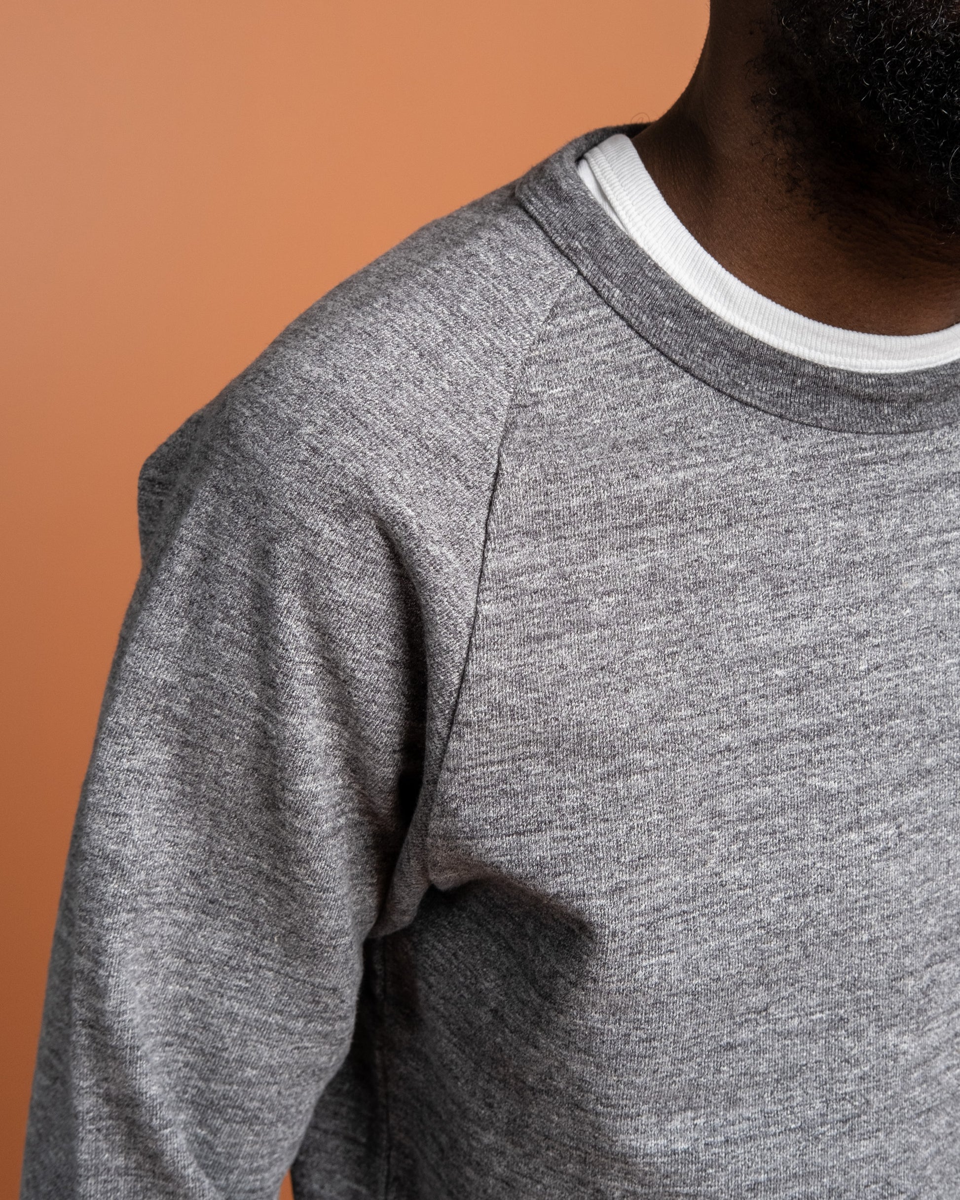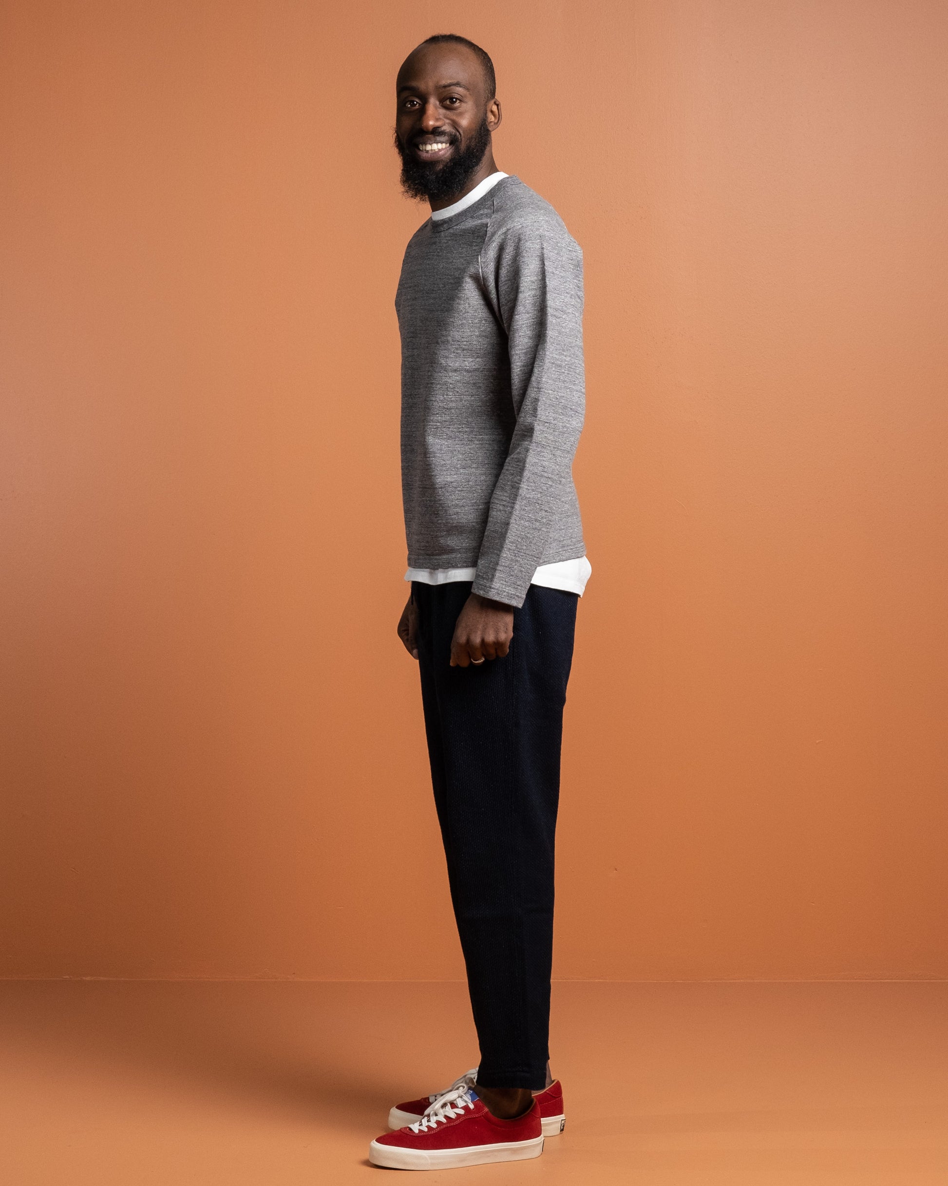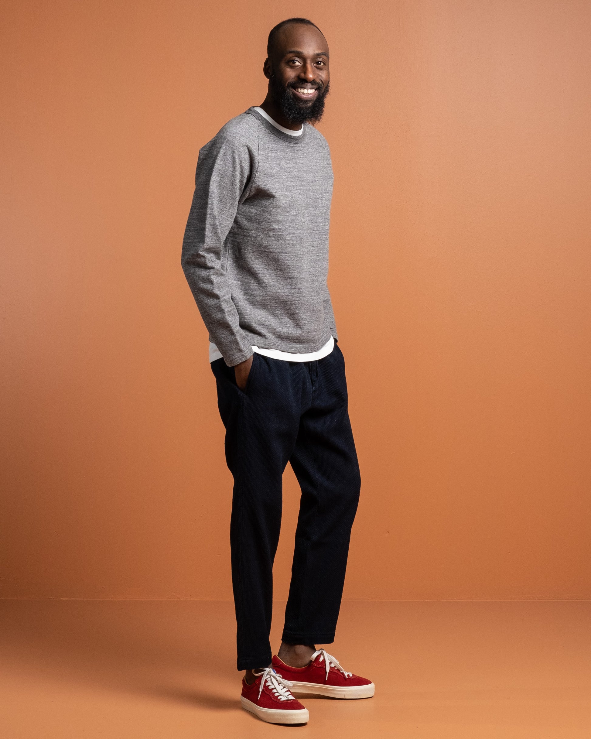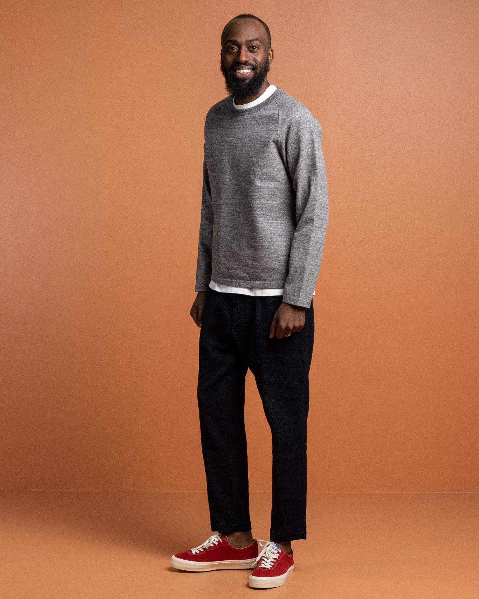 J6740J01 T-shirt à manches longues de 16,5 oz à manches longues en charbon de bois de Japan Blue Jeans. Créé à l'aide de techniques de tricot vintage et complexes. Beau tissu de coton de 16,5 oz avec manches raglan de style vintage. Fait au Japon.