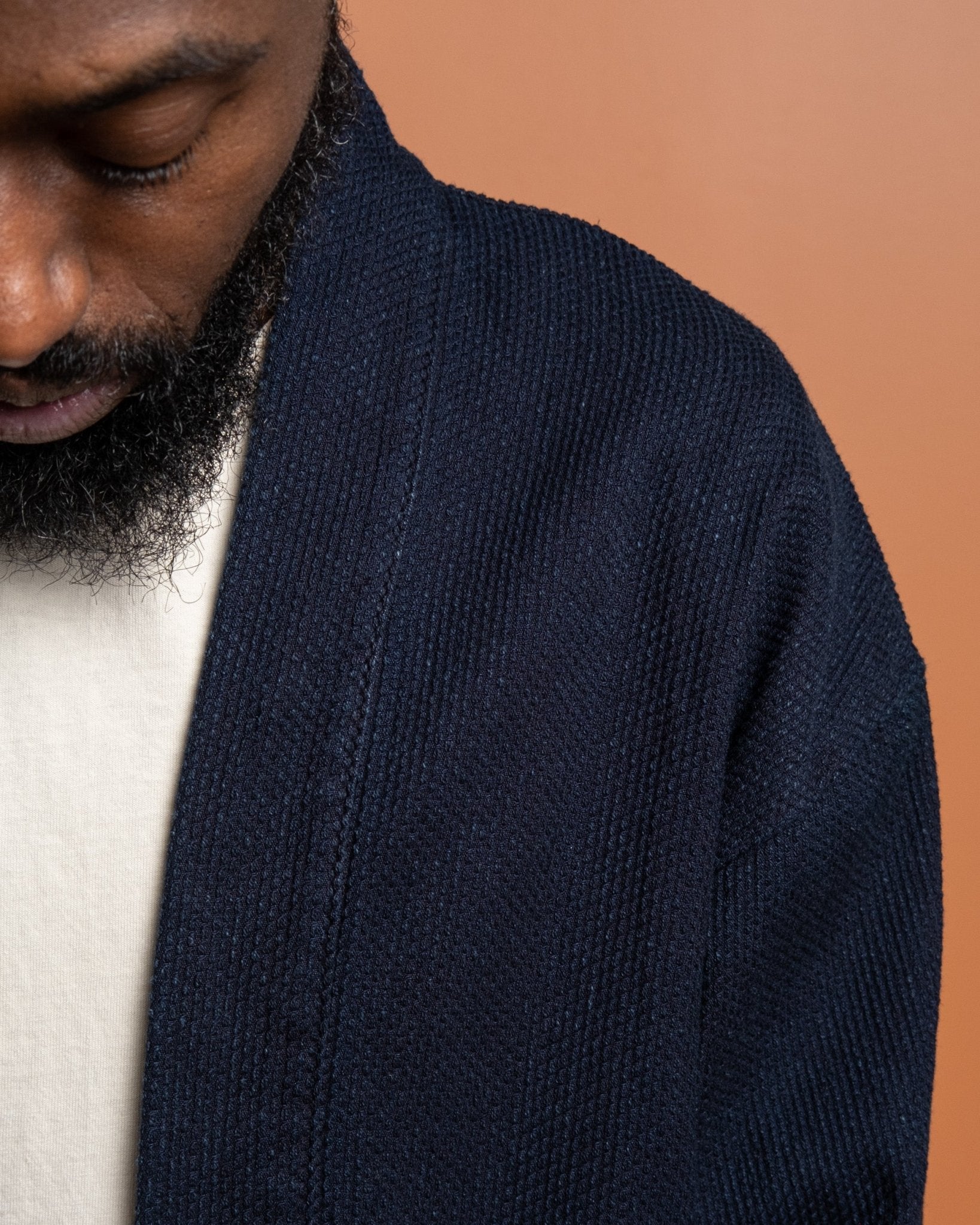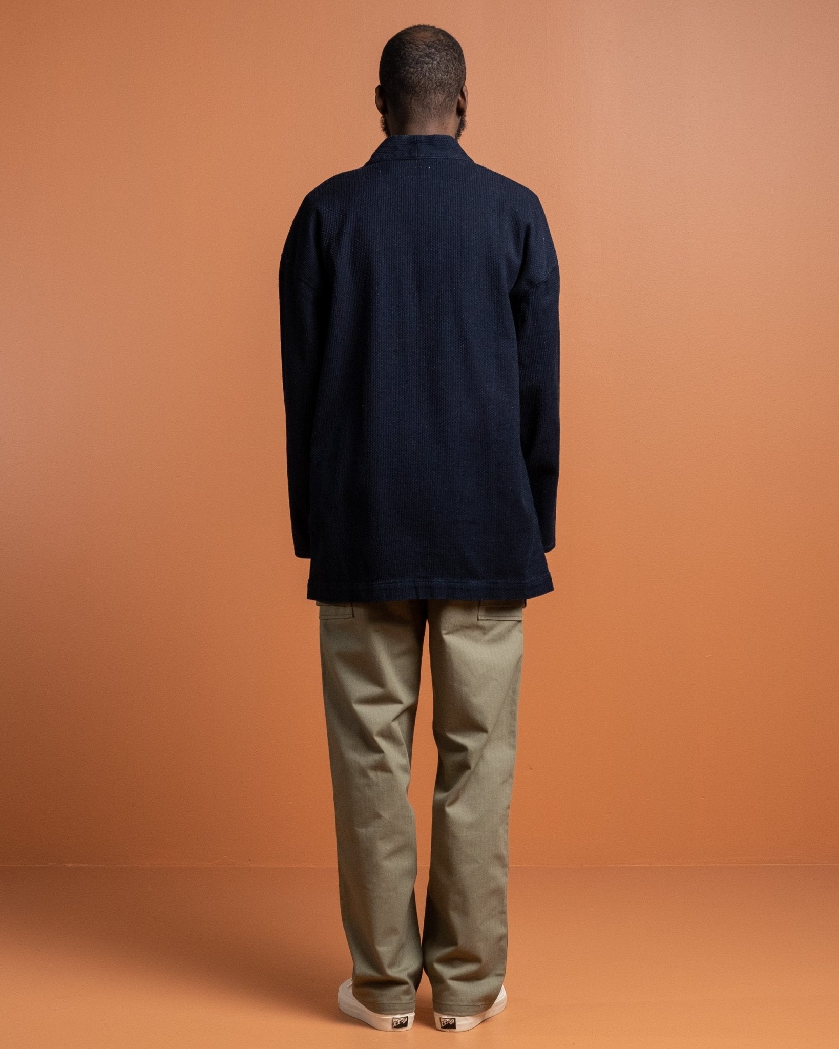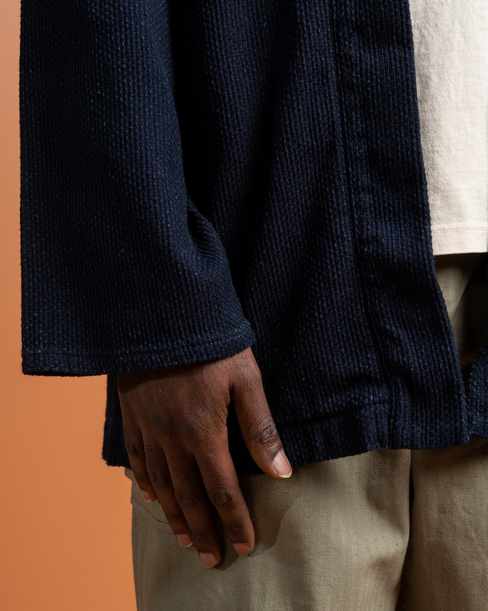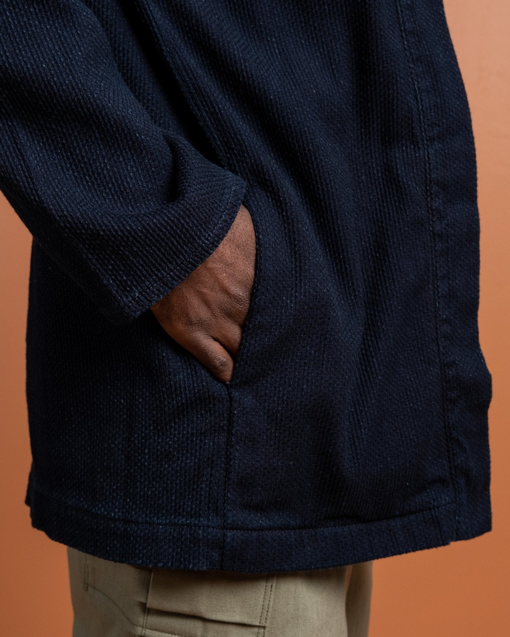 J692951 Sashiko Haori Indigo du Japon Blue Jeans. Veste haori en forme détendue. Fabriqué à partir d'un tissu sashiko japonais de 11 oz à partir de 100% de coton. Deux poches latérales cachées et deux poches internes. Le Haori est une veste japonaise traditionnelle portée sur un kimono. Taille unique (f). Fait au Japon.