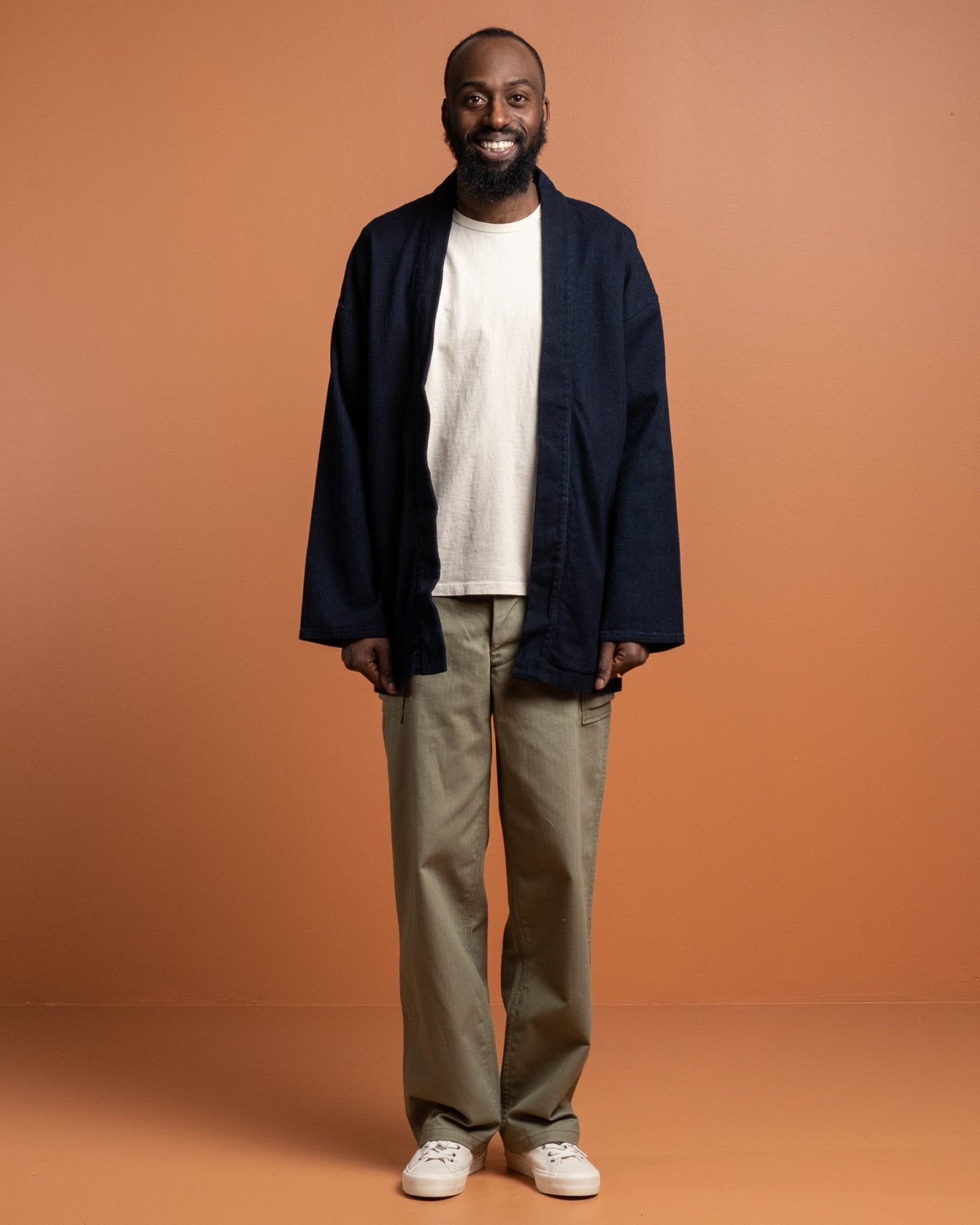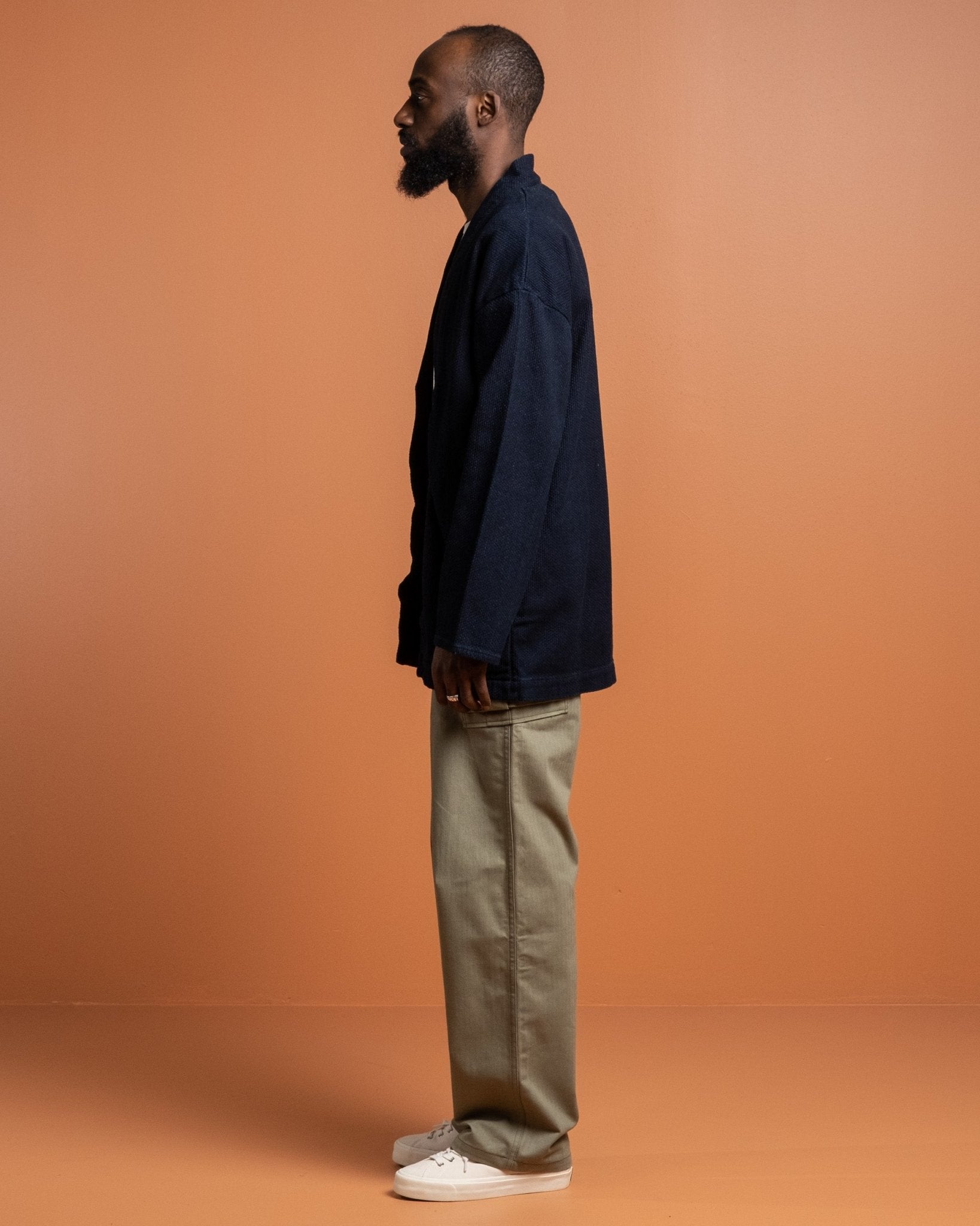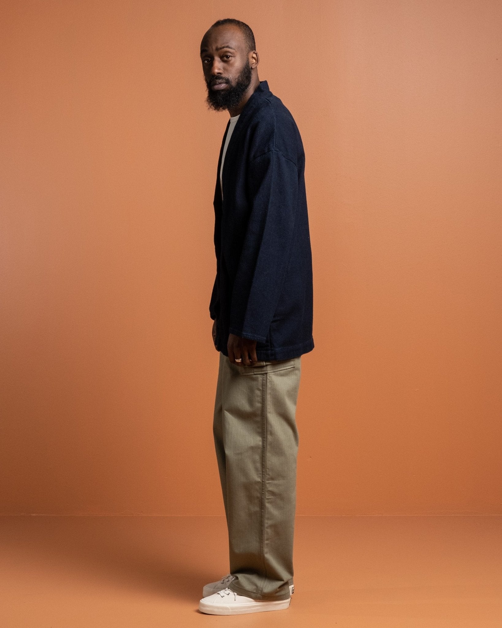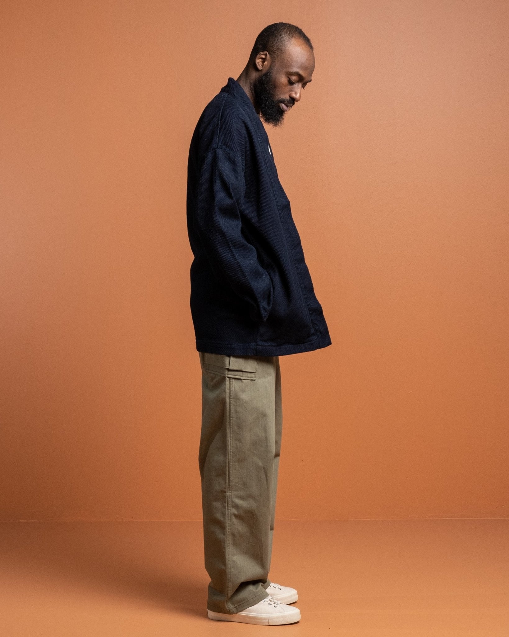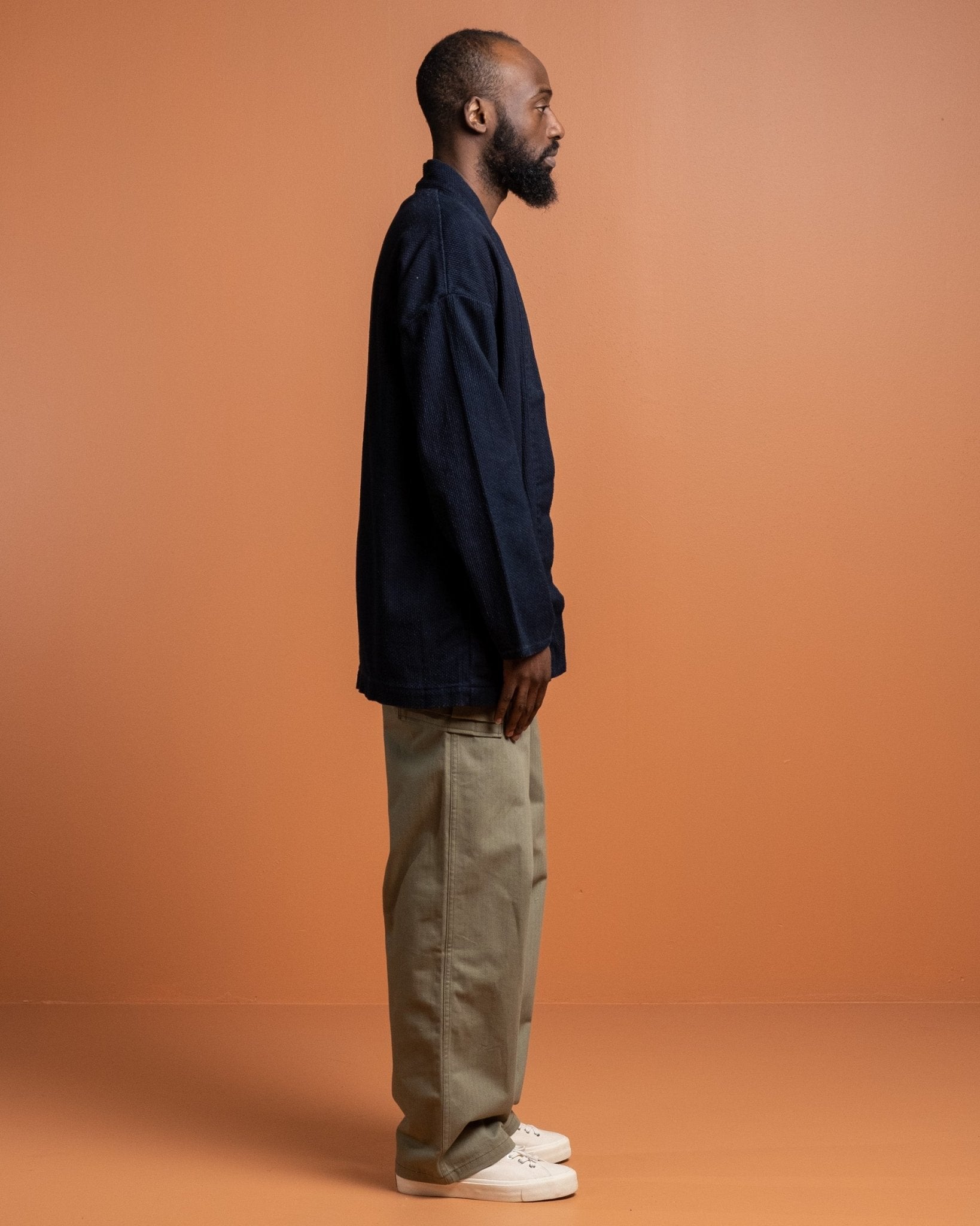 J692951 Sashiko Haori Indigo du Japon Blue Jeans. Veste haori en forme détendue. Fabriqué à partir d'un tissu sashiko japonais de 11 oz à partir de 100% de coton. Deux poches latérales cachées et deux poches internes. Le Haori est une veste japonaise traditionnelle portée sur un kimono. Taille unique (f). Fait au Japon.