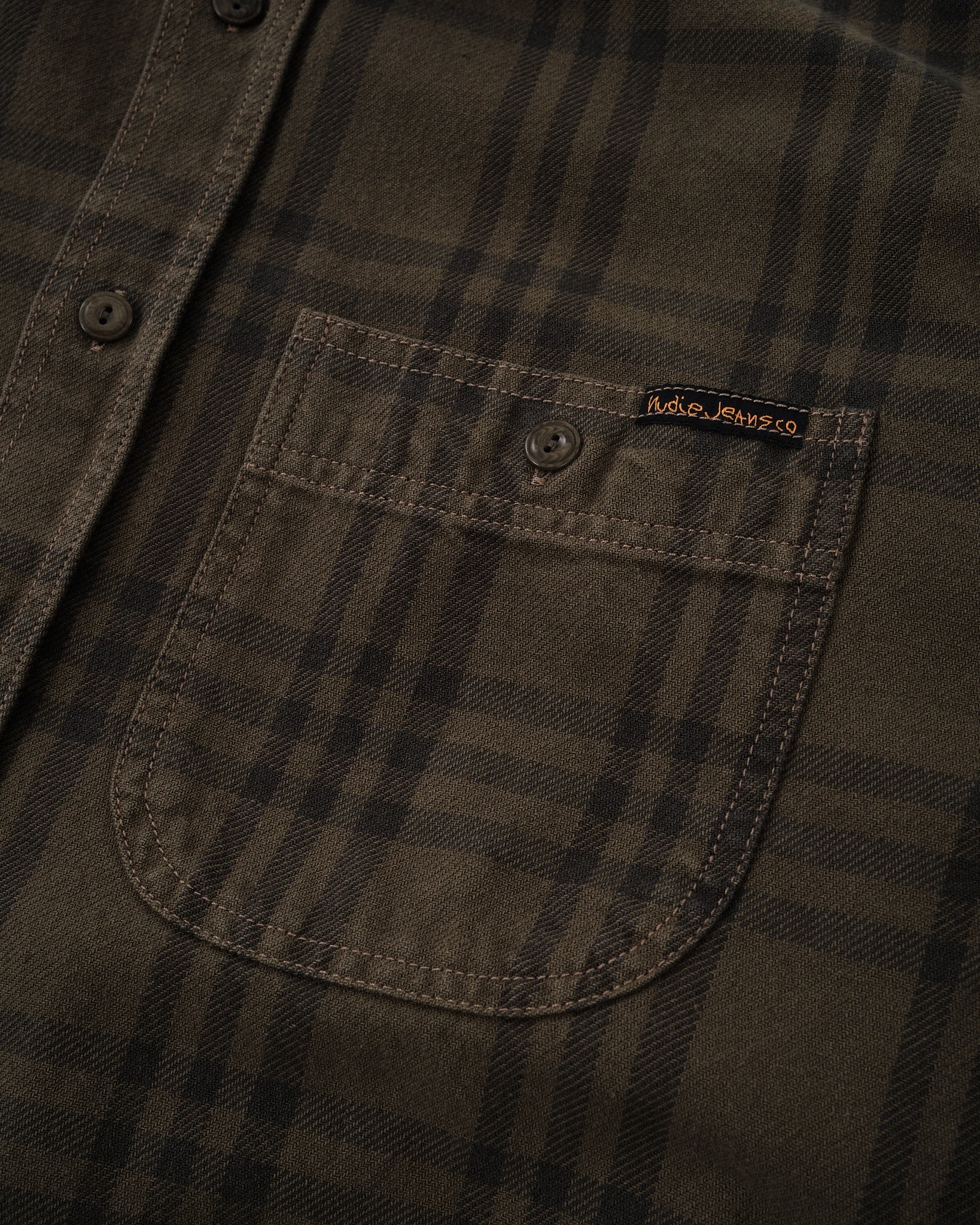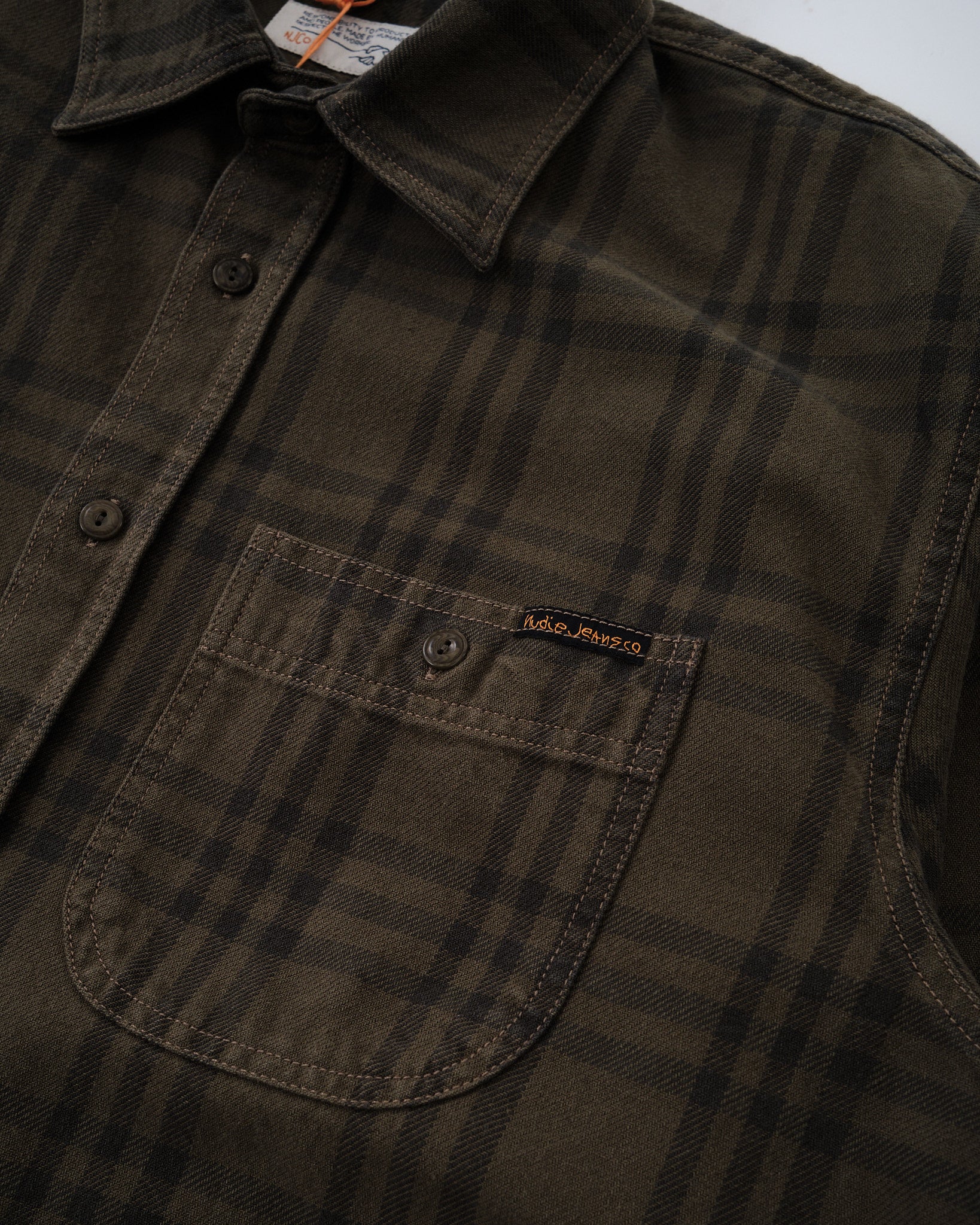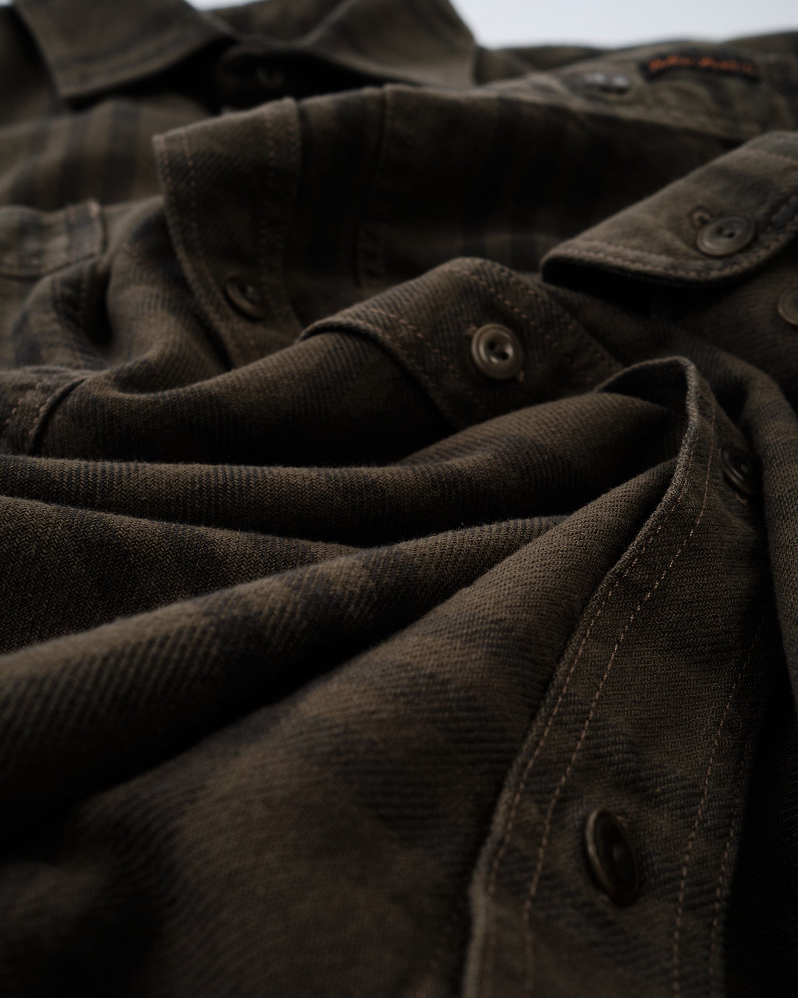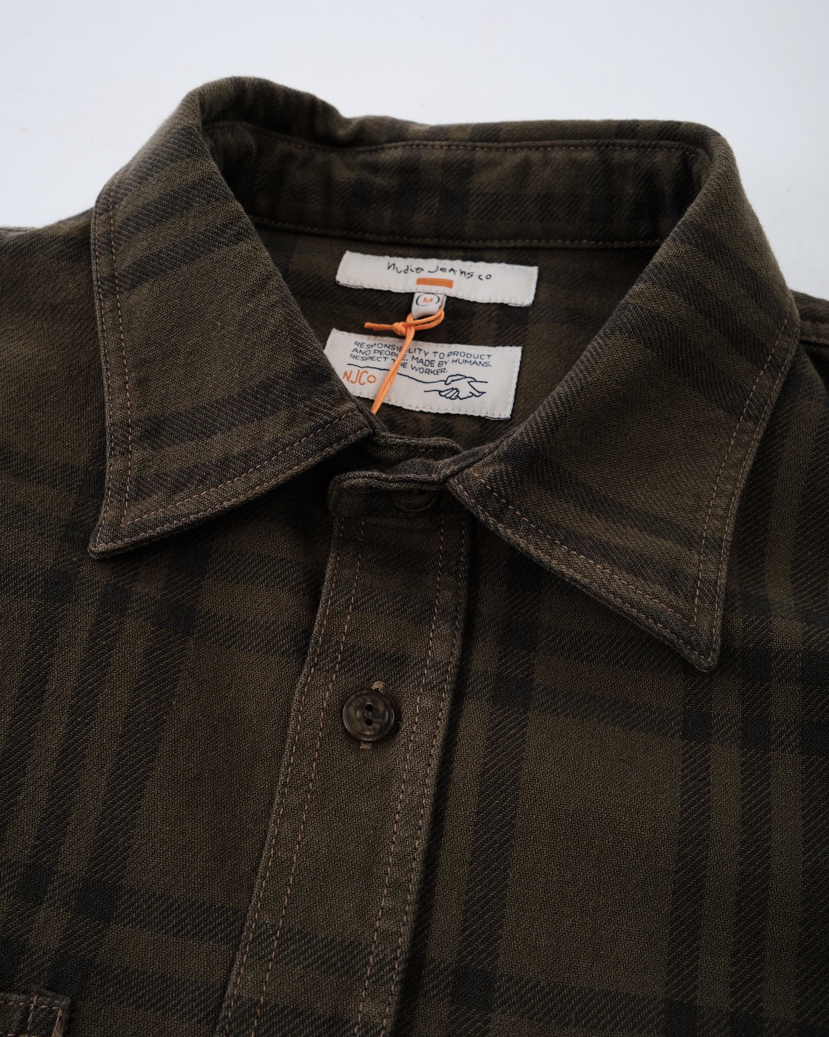 Le Nudie Jeans CO. Julian Worker Plaid Check Shirt Olive est un chemise à manches longues inspirée des vêtements de travail classique, fabriqué à partir de Twill en coton biologique robuste mais doux. Le tissu dispose d'un base terrestre vert olive avec un motif de contrôle vert foncé, créant un look intemporel et polyvalent.