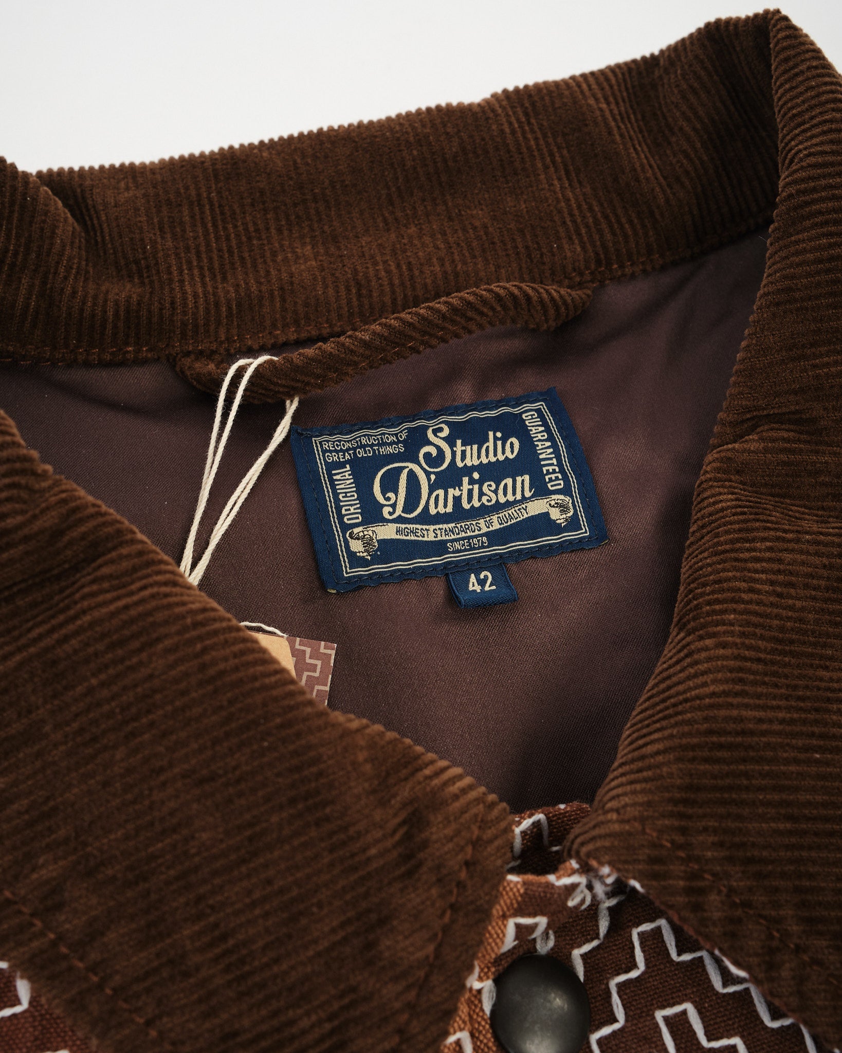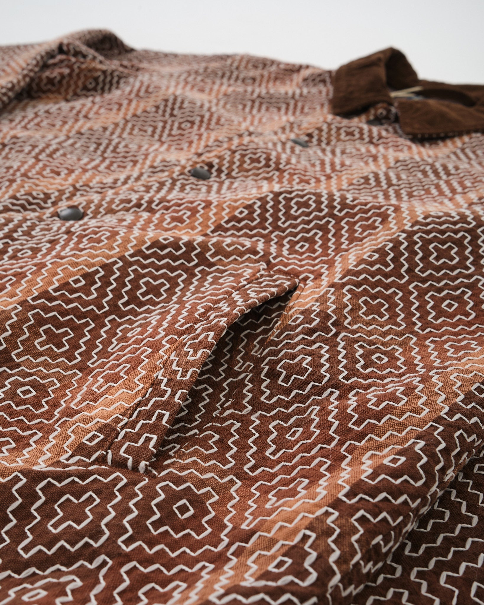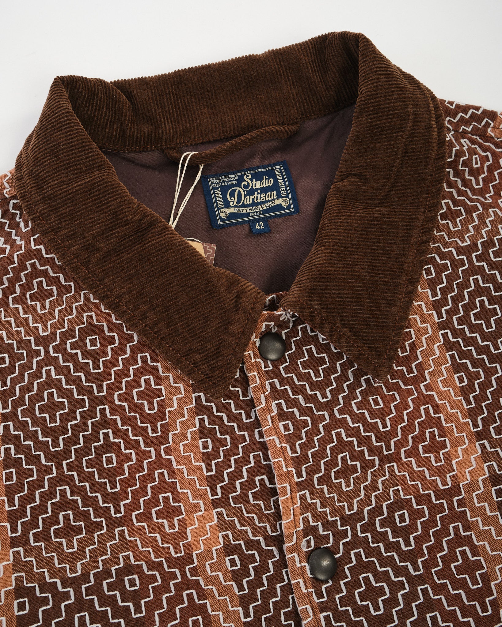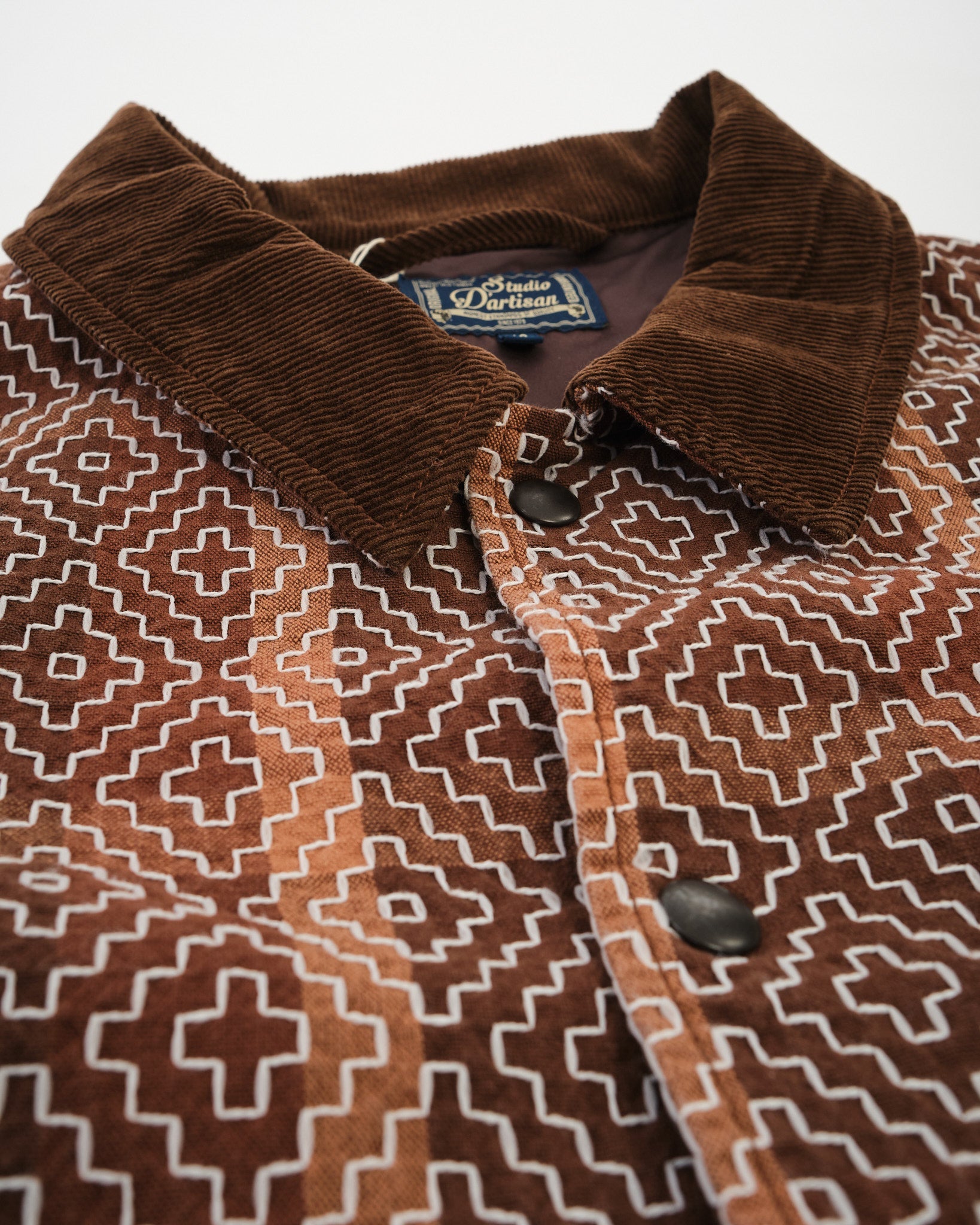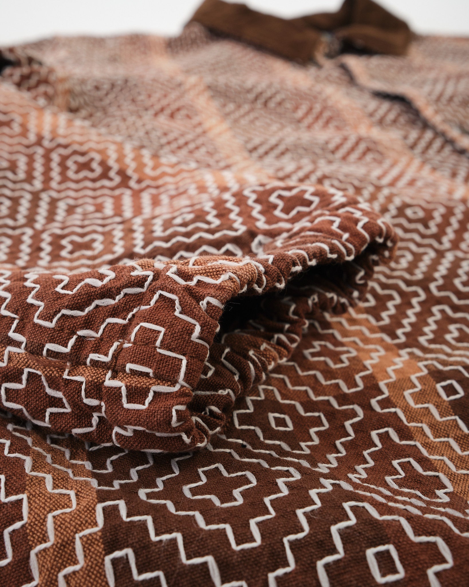 Le Studio D'Artisan Kakishibu Noragi Sashiko Jacket (4618) à Kakishibu mélange traditionnel Artisanat textile japonais avec une esthétique moderne. Ce veste d'entraîneur est fait à partir de Kakishibu-Zome Noragi Sashiko tissu, où La teinture de tanin de kakis (Kakishibu) est appliqué pour créer un Modèle de contrôle unique, en utilisant trois fils teints de kaki différents.