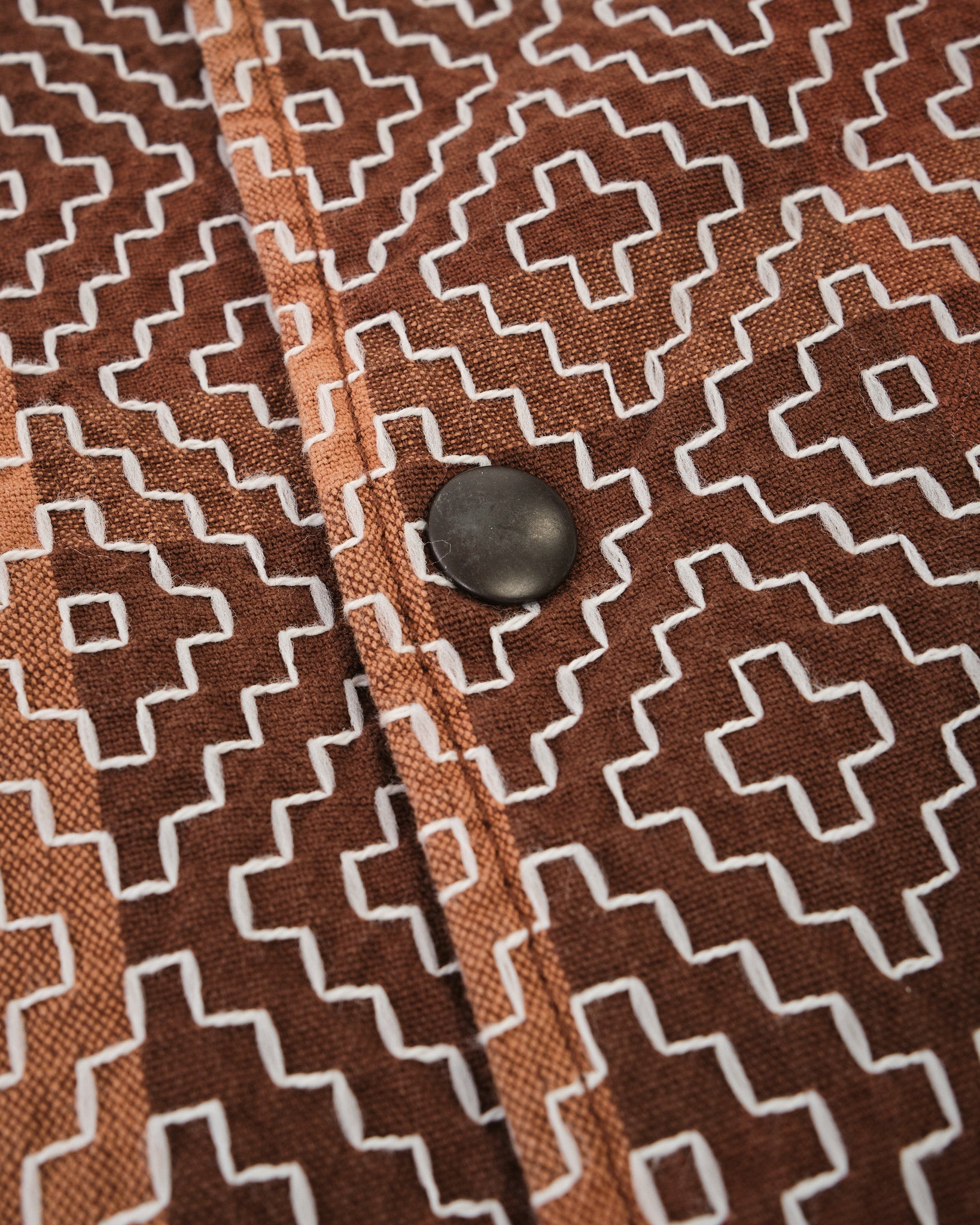 Le Coux de sashiko fonctionne à la fois verticalement et horizontalement, avec un Conception traditionnelle des feuilles de kaki, ajoutant de la profondeur et du patrimoine au vêtement. Le le tissu subit un lavage à haute température, créant un riche texture de type cousue à la main, grâce aux taux de retrait variables des matériaux utilisés.
