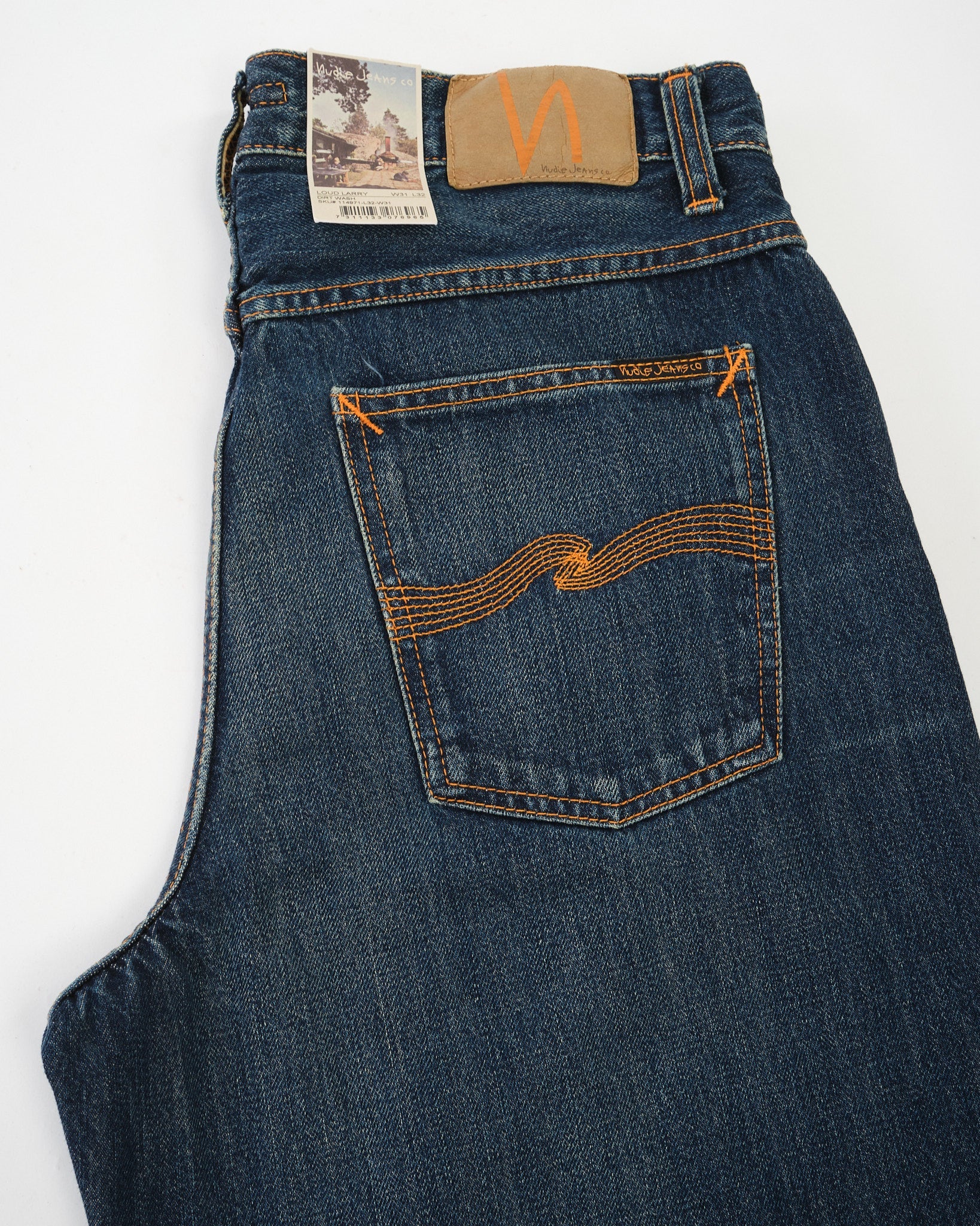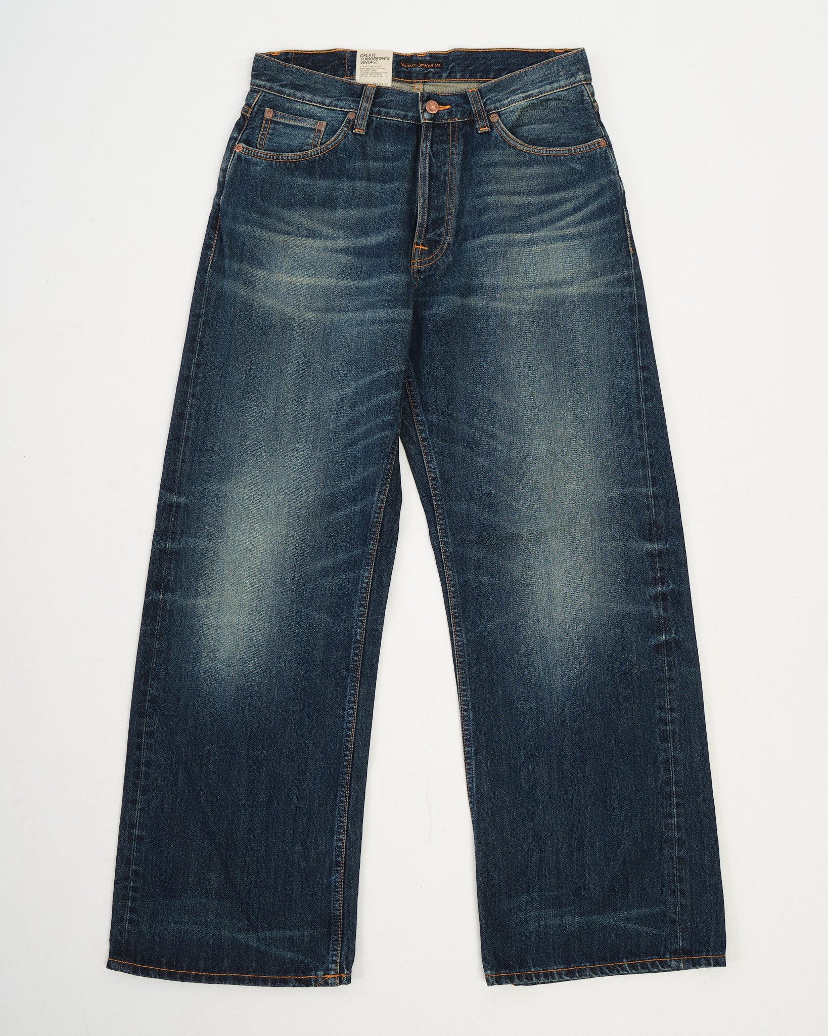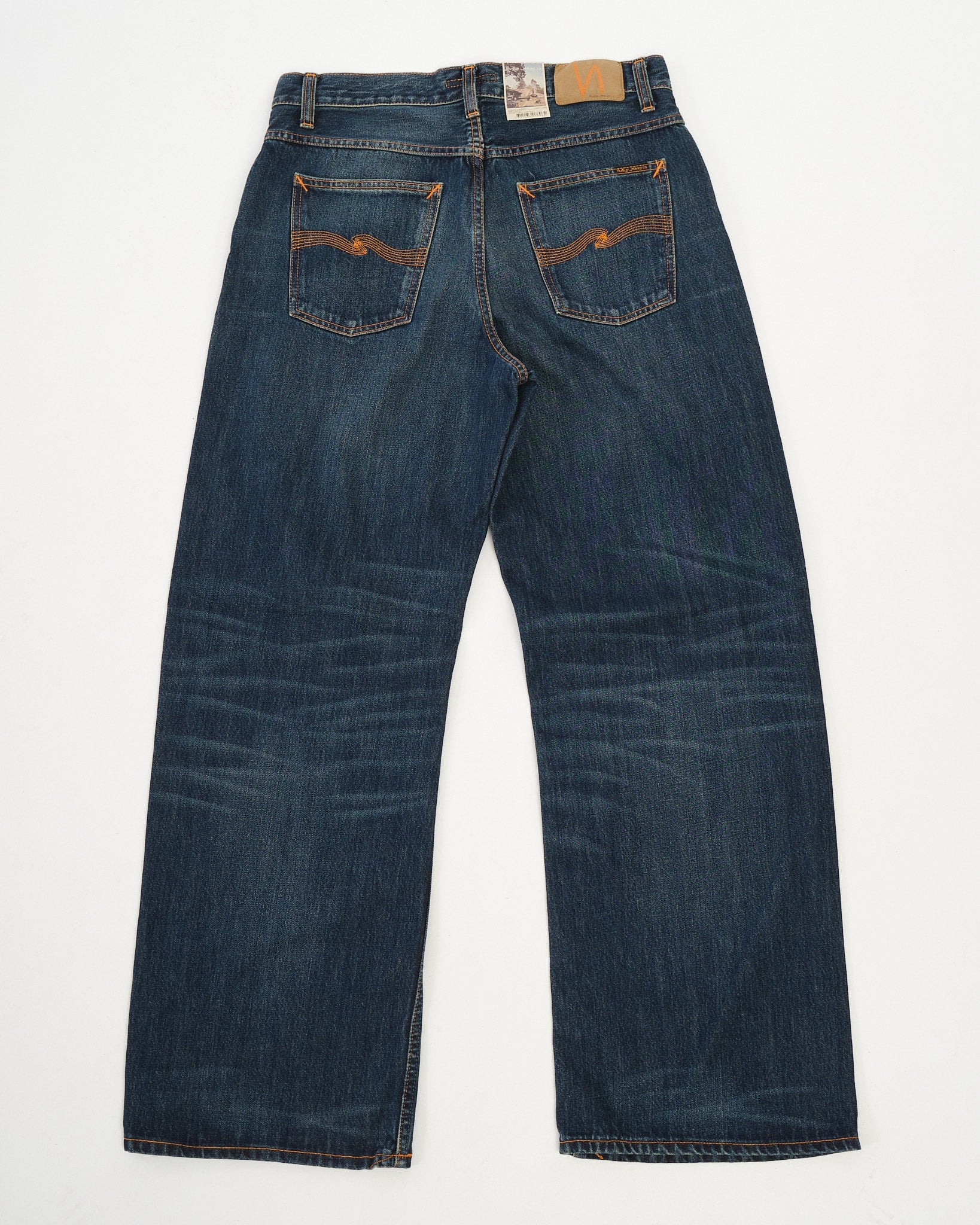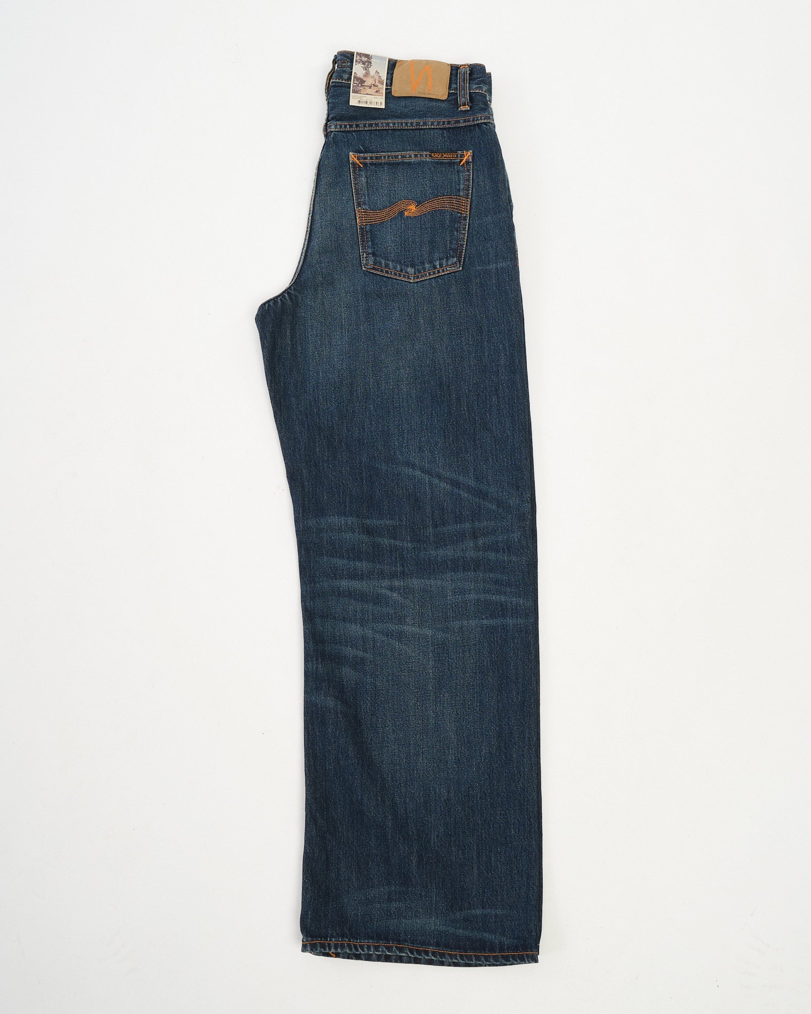 Loud Larry gets even louder in the Dirt Wash finish — a dusty, sun-faded look that brings out the vintage soul of this bold silhouette. Crafted from 14.2 oz rigid denim made with regenerative organic cotton, it’s a step forward in both sustainability and style. With classic orange stitching, copper trims, and a jacron patch, this pair stays true to Nudie’s heritage roots. The loose, high-waisted fit and wide leg give you room to move and plenty of attitude. Loud Larry Dirt Wash is worn-in denim with serious presence.