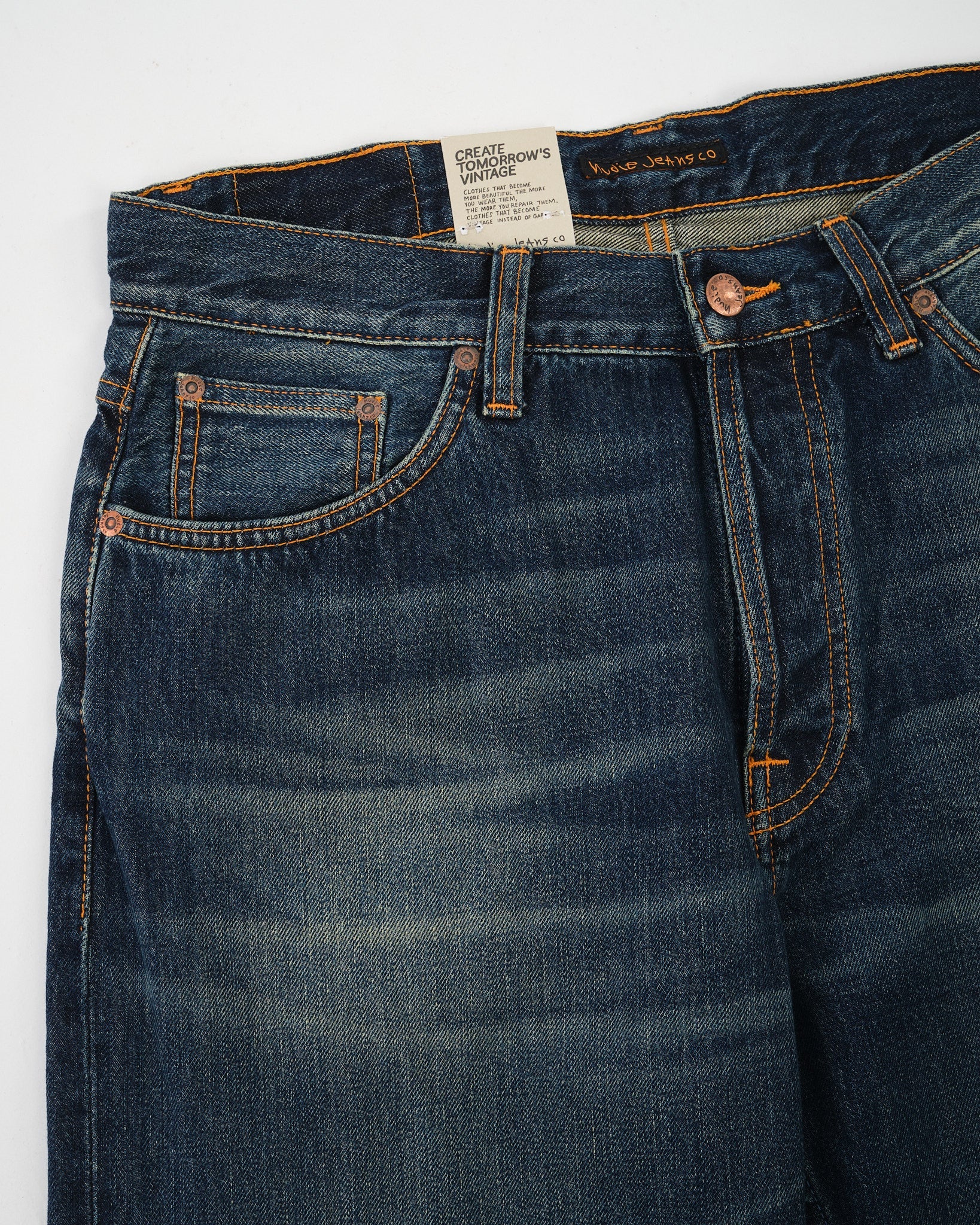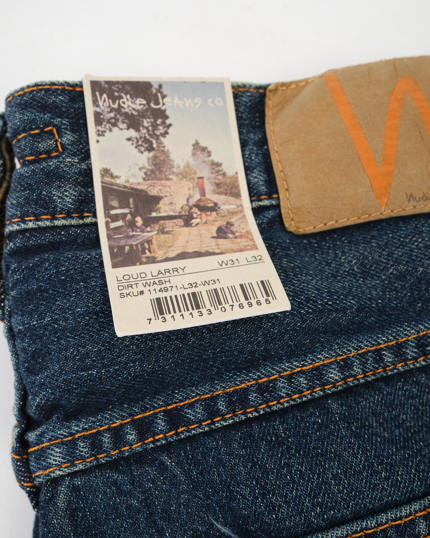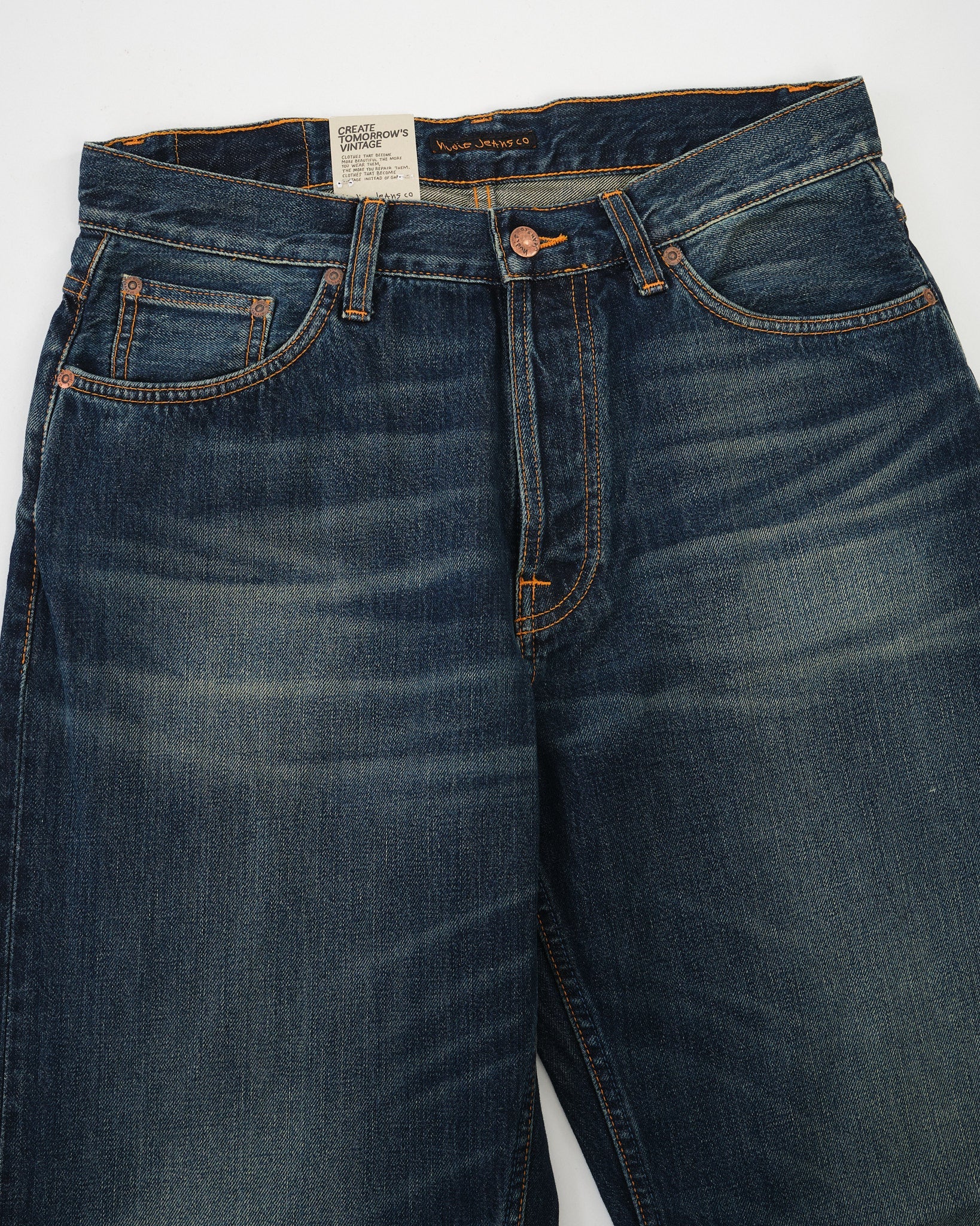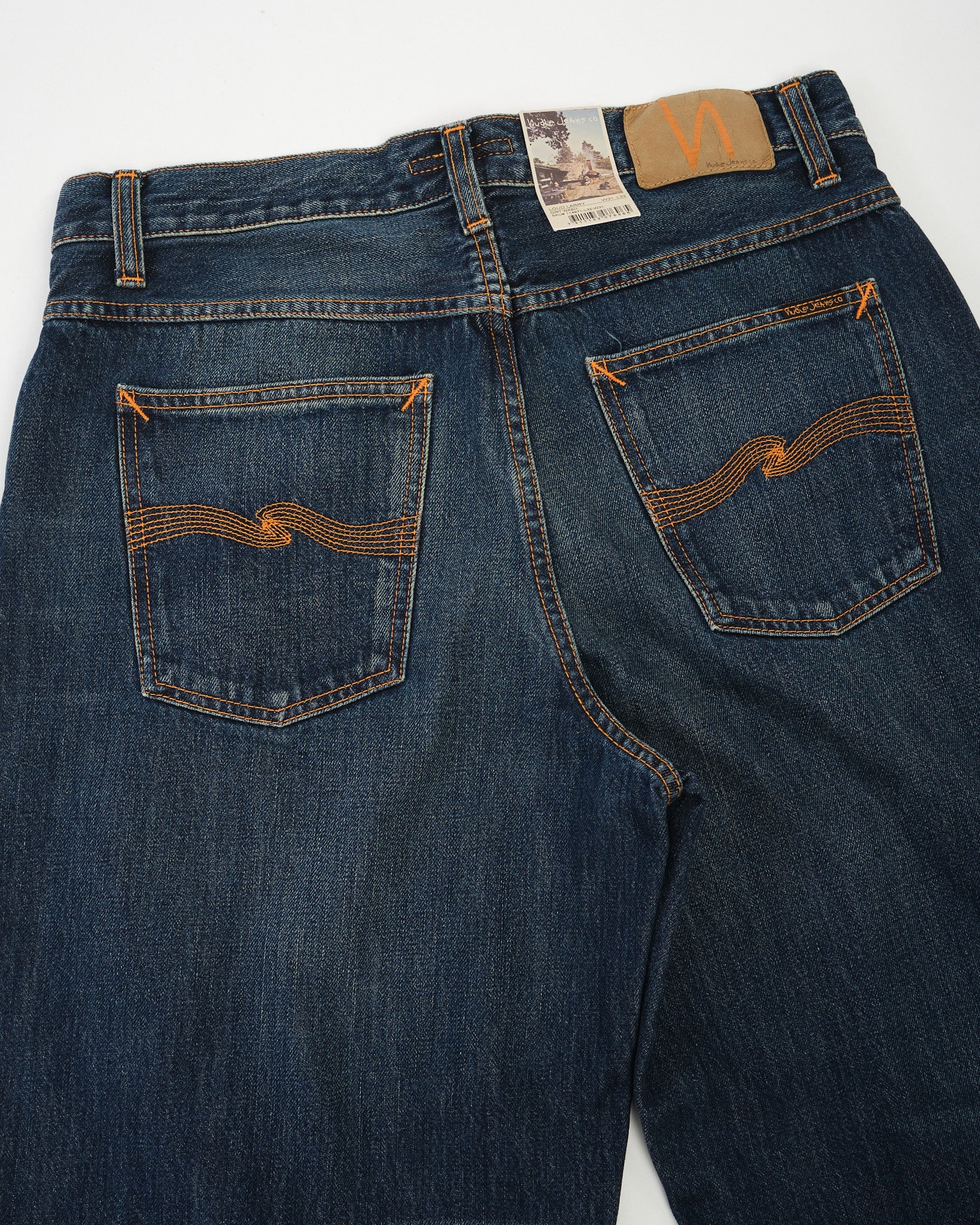 Loud Larry gets even louder in the Dirt Wash finish — a dusty, sun-faded look that brings out the vintage soul of this bold silhouette. Crafted from 14.2 oz rigid denim made with regenerative organic cotton, it’s a step forward in both sustainability and style. With classic orange stitching, copper trims, and a jacron patch, this pair stays true to Nudie’s heritage roots. The loose, high-waisted fit and wide leg give you room to move and plenty of attitude. Loud Larry Dirt Wash is worn-in denim with serious presence.