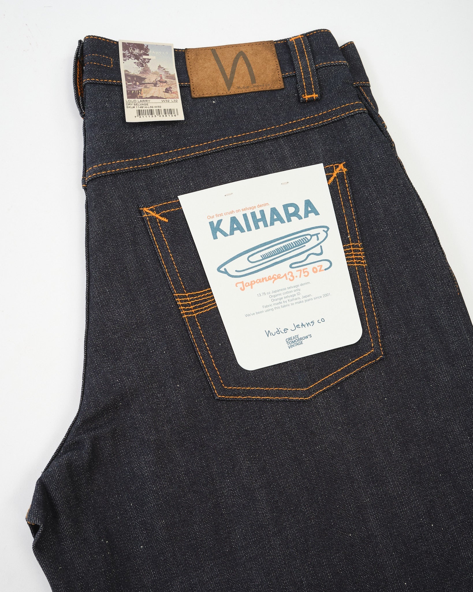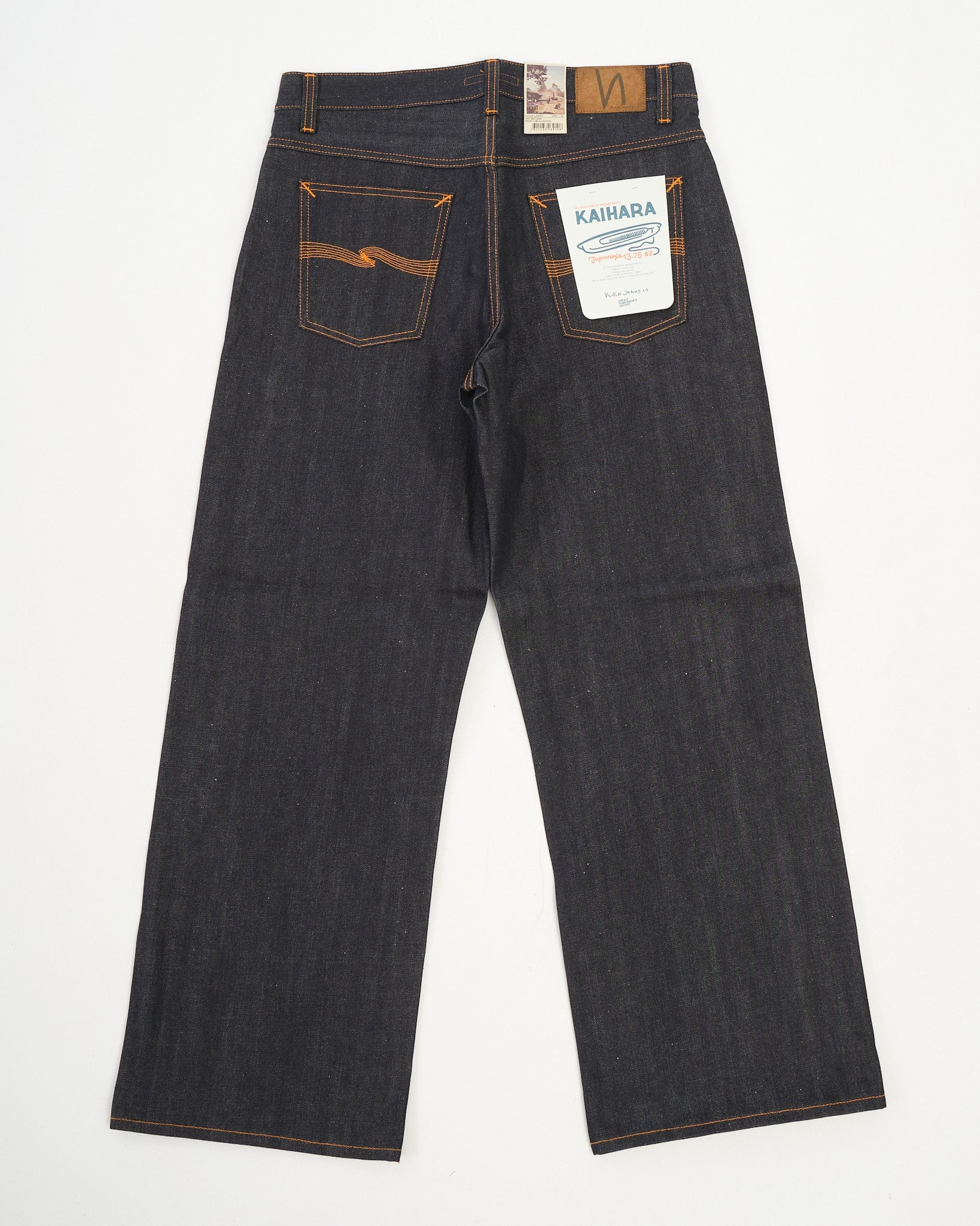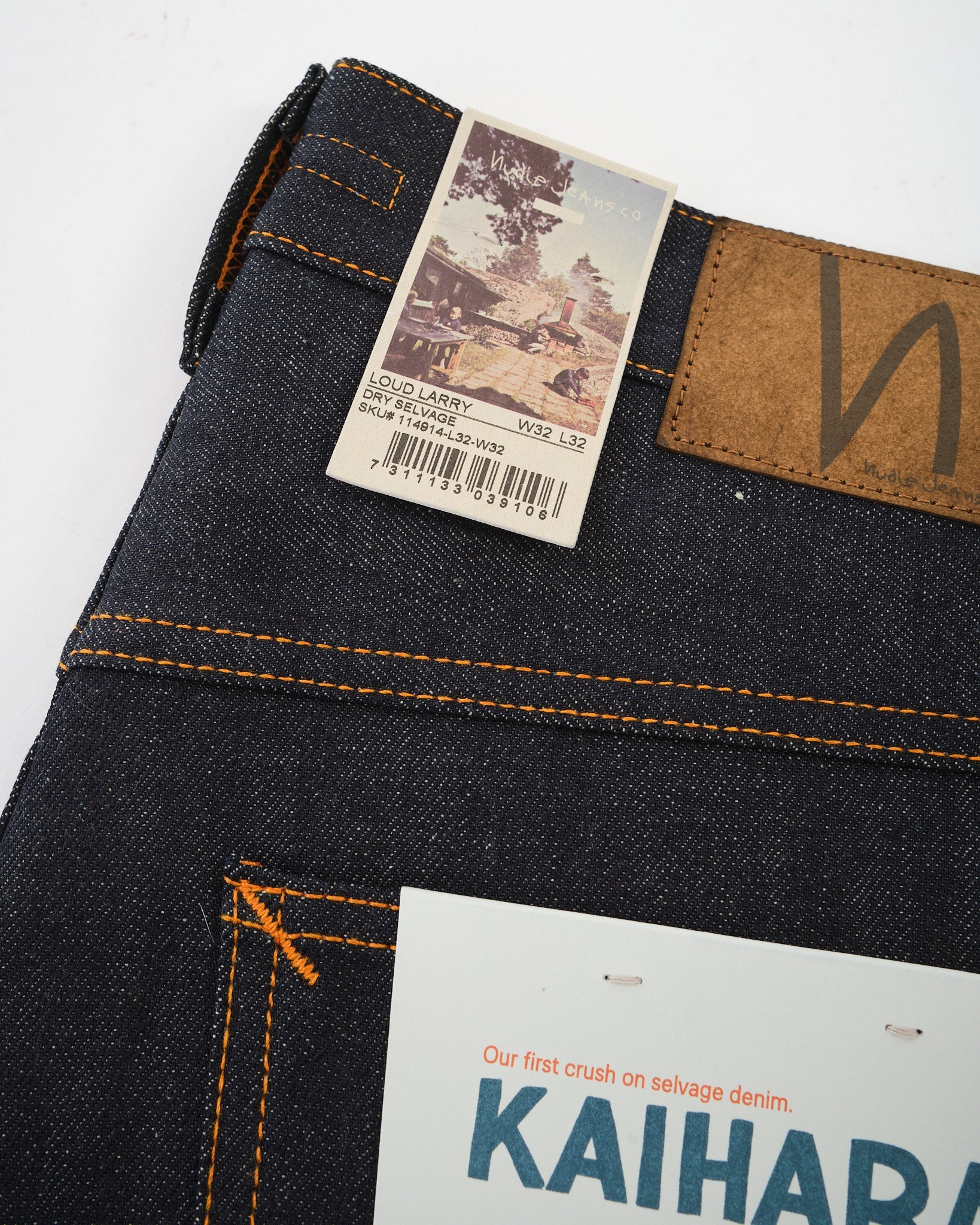 The Loud Larry in Dry Selvage is Nudie Jeans Co’s boldest silhouette, cut from 13.75 oz organic Japanese selvage denim from Kaihara. This rigid denim has a greencast tone that promises a distinct fade with wear, enhanced by classic orange stitching and antique silver trims. A high waist and dramatically wide legs offer a loose, vintage-inspired fit that’s both statement-making and steeped in denim tradition. Finished with a jacron patch and button fly, Loud Larry is made for those who want their jeans loud and proud.