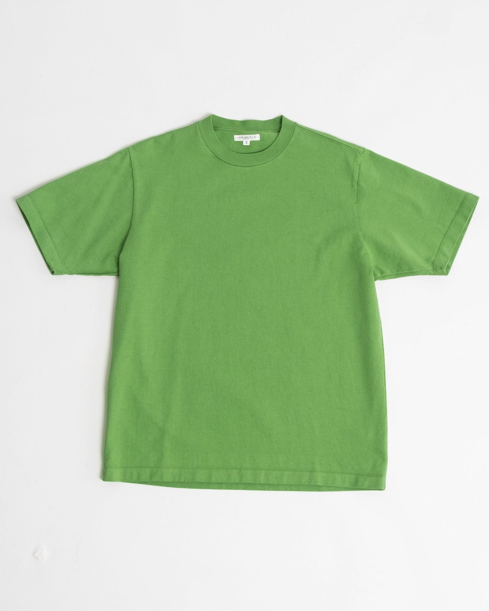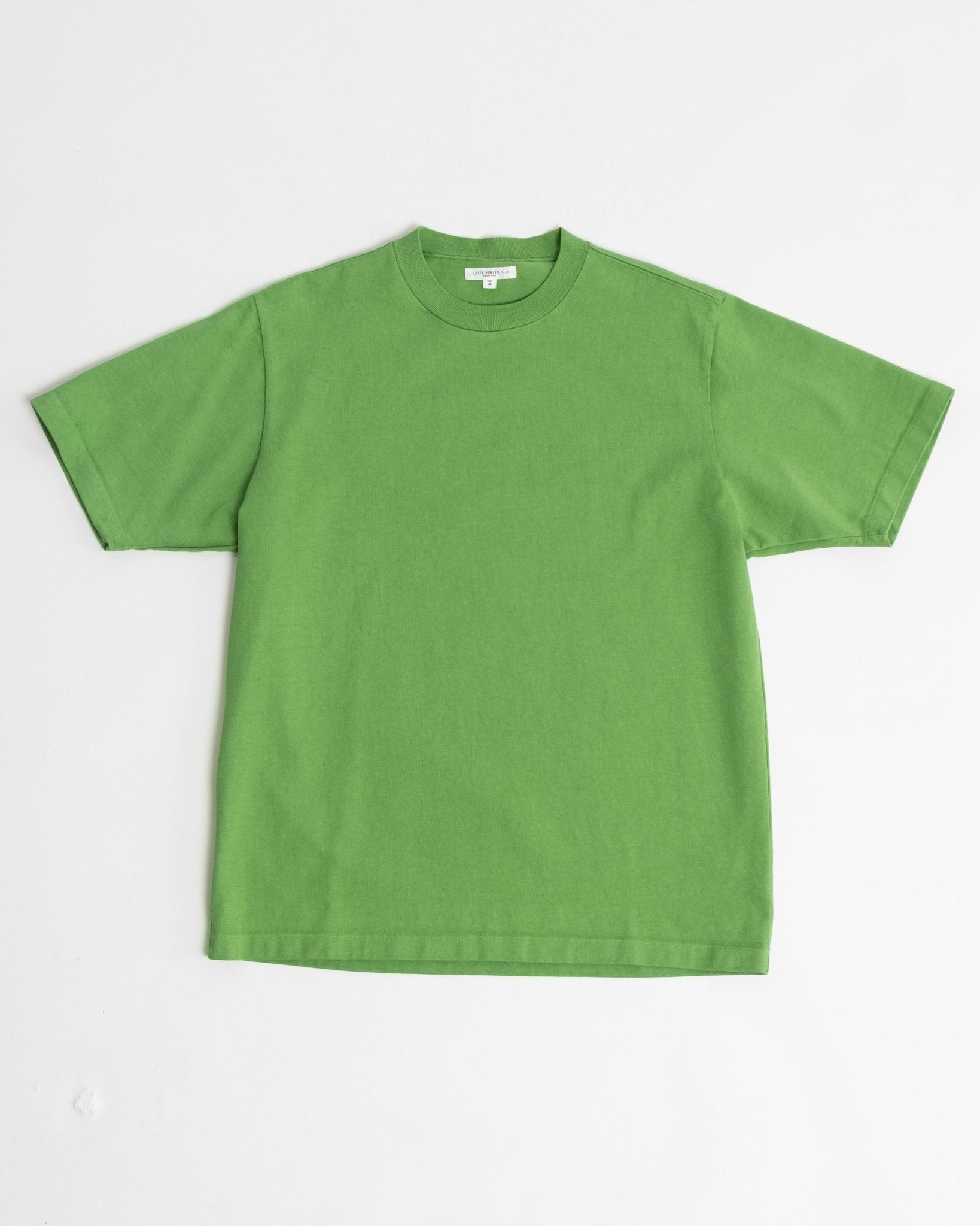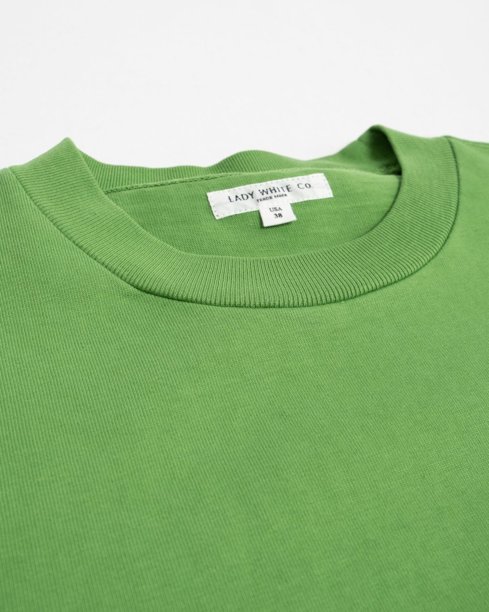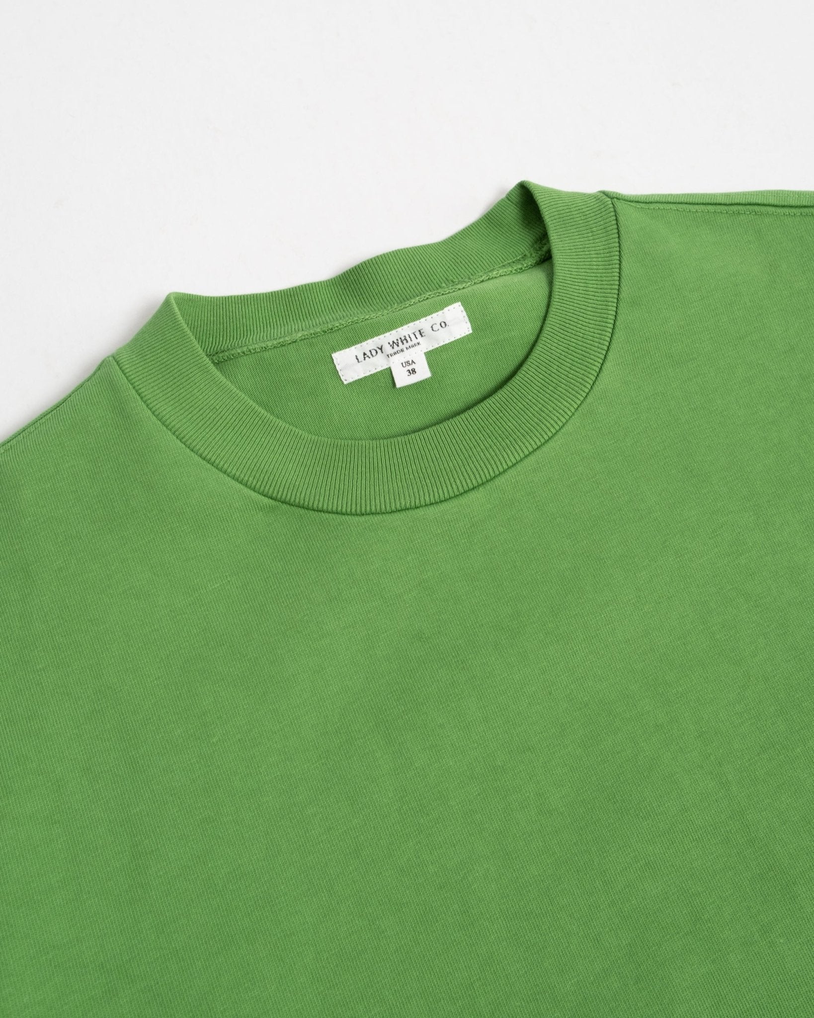 T-shirt de rugby vert vif de la marque Los Angeles Lady White Co. Tissé, coupé, cousu et teint à Los Angeles. La trame est sanforée, donc le rétrécissement n'est aussi proche que possible. Probablement l'un des meilleurs t-shirts jamais fabriqués. Fabriqué aux États-Unis.