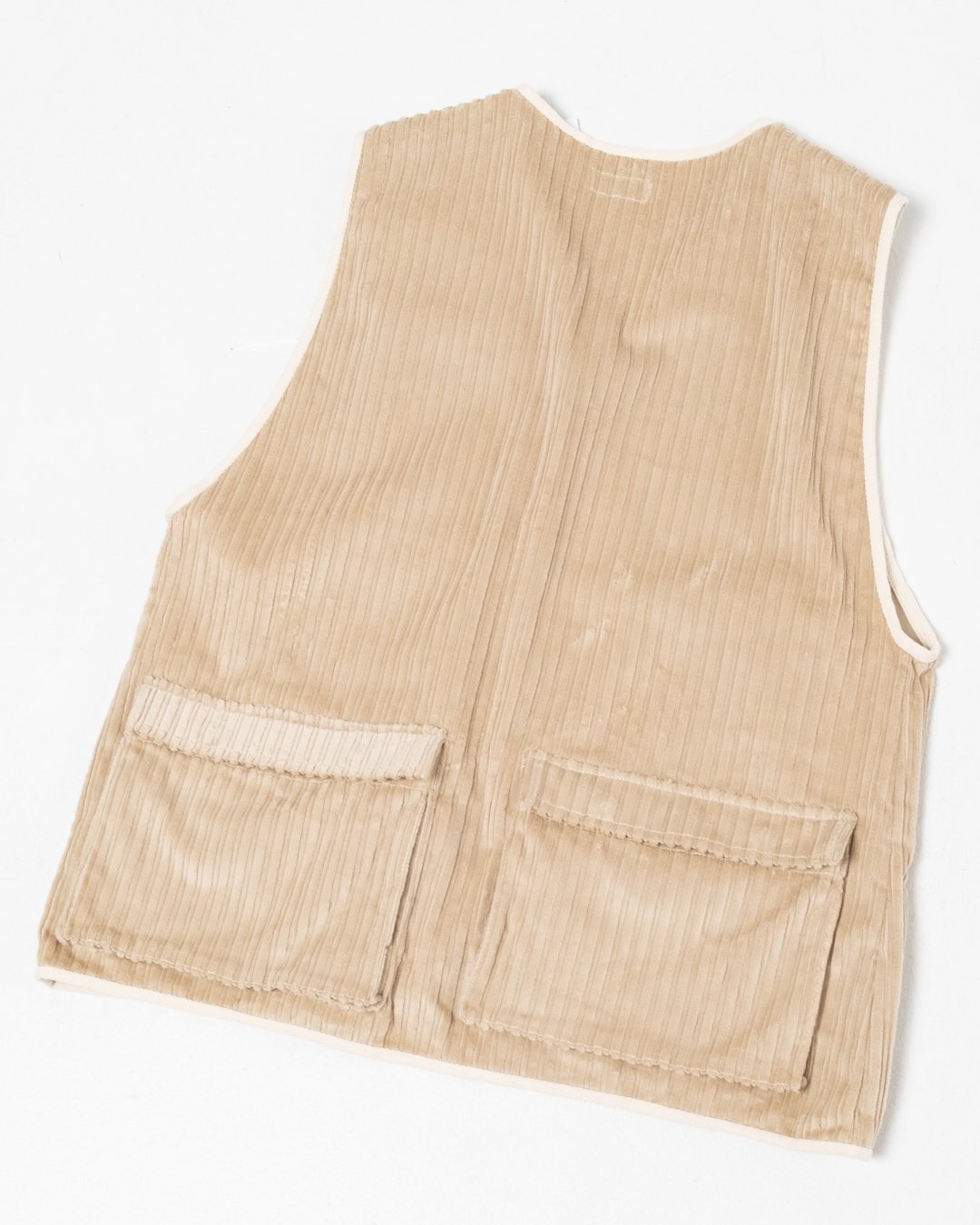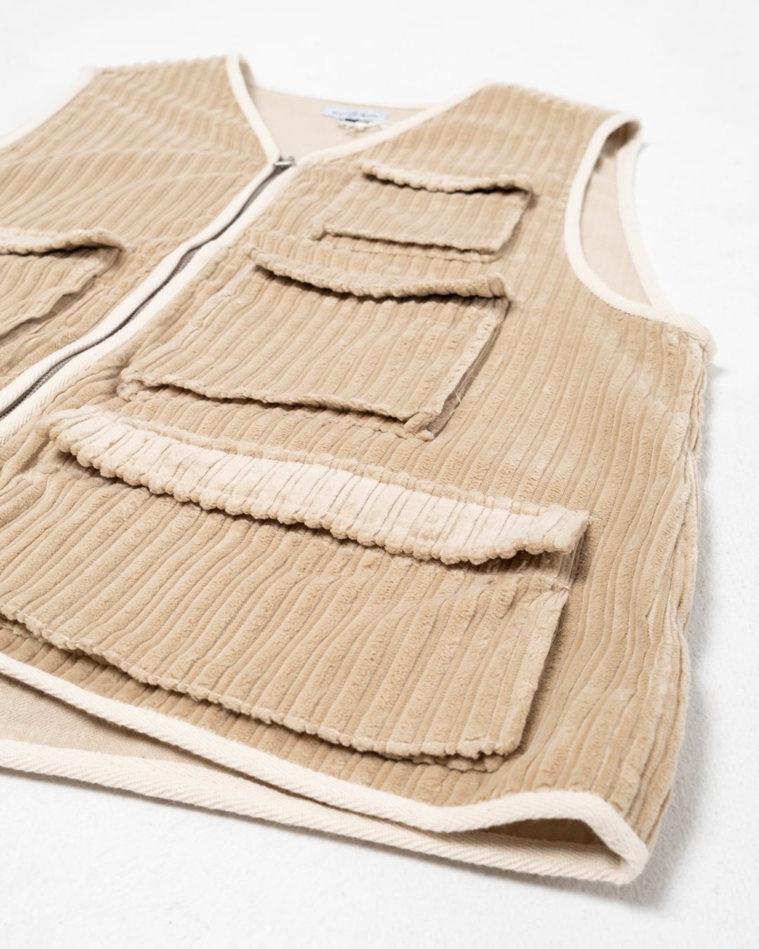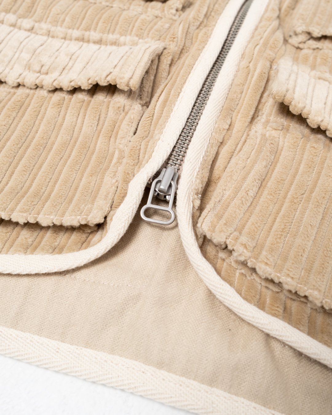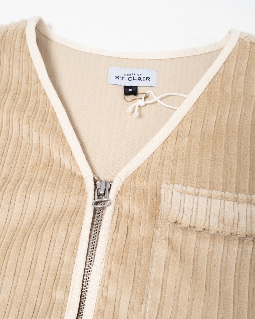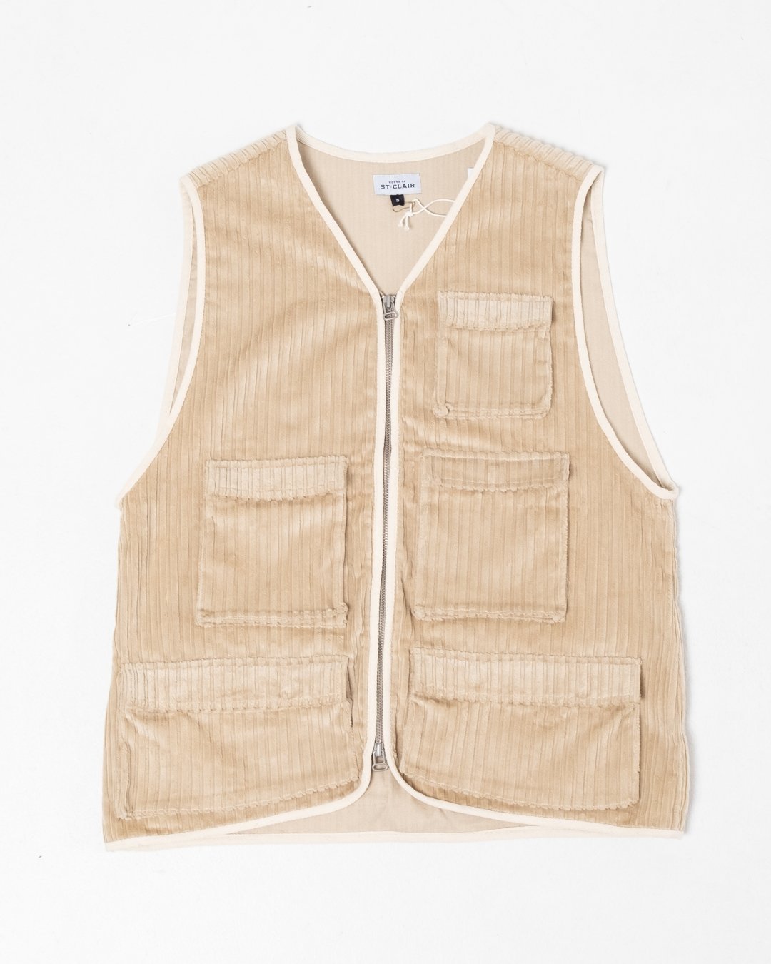 MJM Gest Stone de House of St. Clair. Gilet multi-poche léger en anglais Hi Lo Cotton Corchuroy. Cinq poches 3D avant avec fermeture à ruban et deux grandes poches 3D à l'arrière avec fermeture à pression. Fermeture à glissière bidirectionnelle. Fabriqué aux États-Unis.