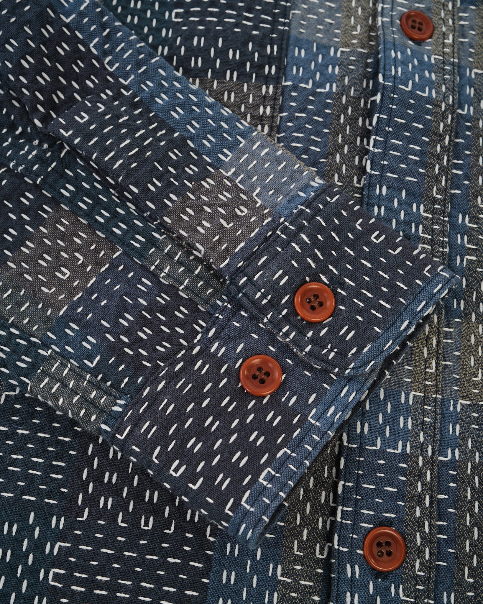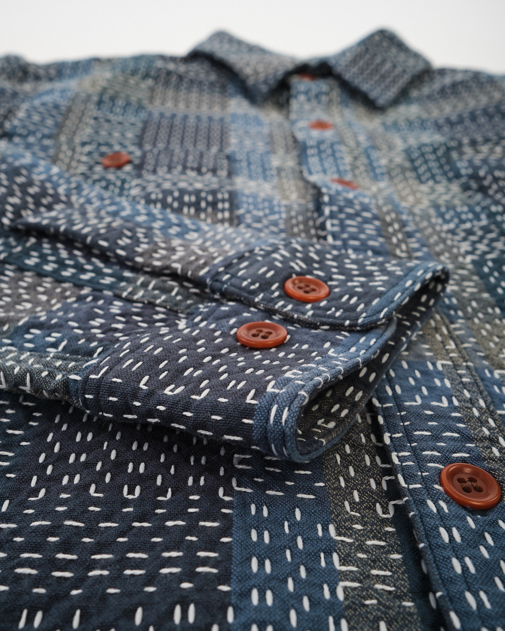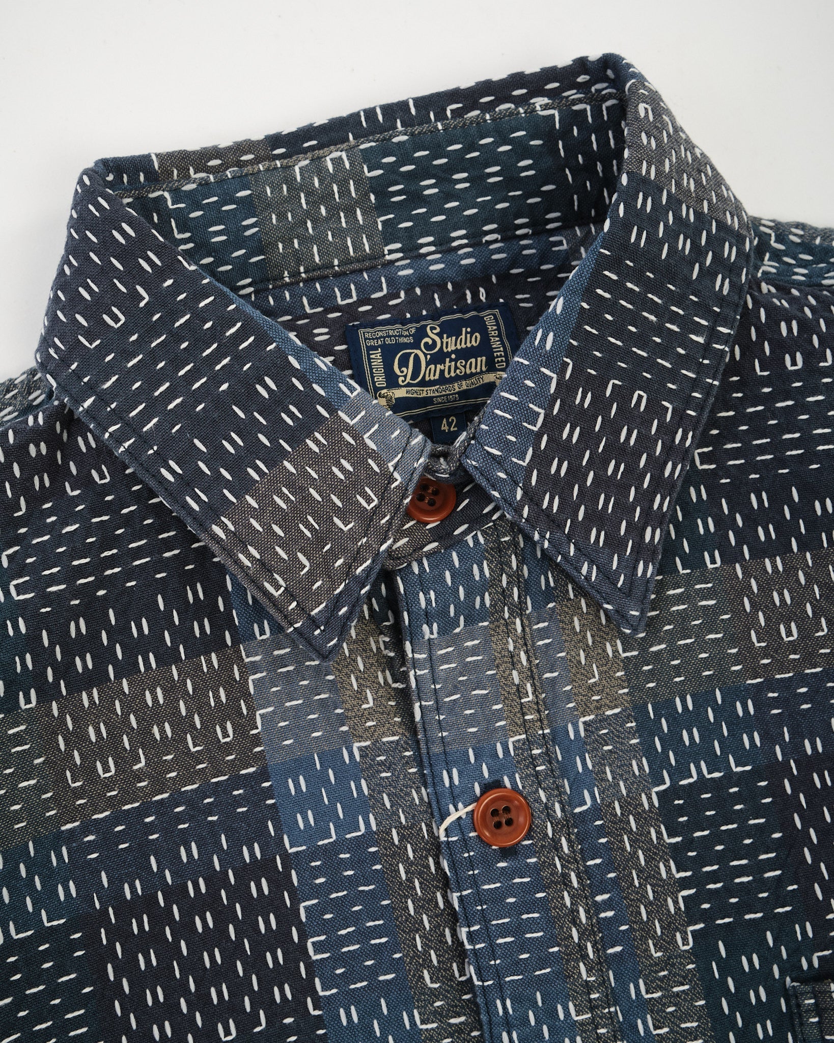 Le Studio D'Artisan Noragi Sashiko (5651) est une interprétation moderne de vêtements de travail japonais traditionnels, s'inspirant de Noragi, les vêtements robustes portés par les ouvriers au cours des siècles passés. Conçu avec Sashiko couture en cours d'exécution verticalement et horizontalement, cette chemise présente une esthétique unique artisanale qui honore le riche héritage textile du Japon.